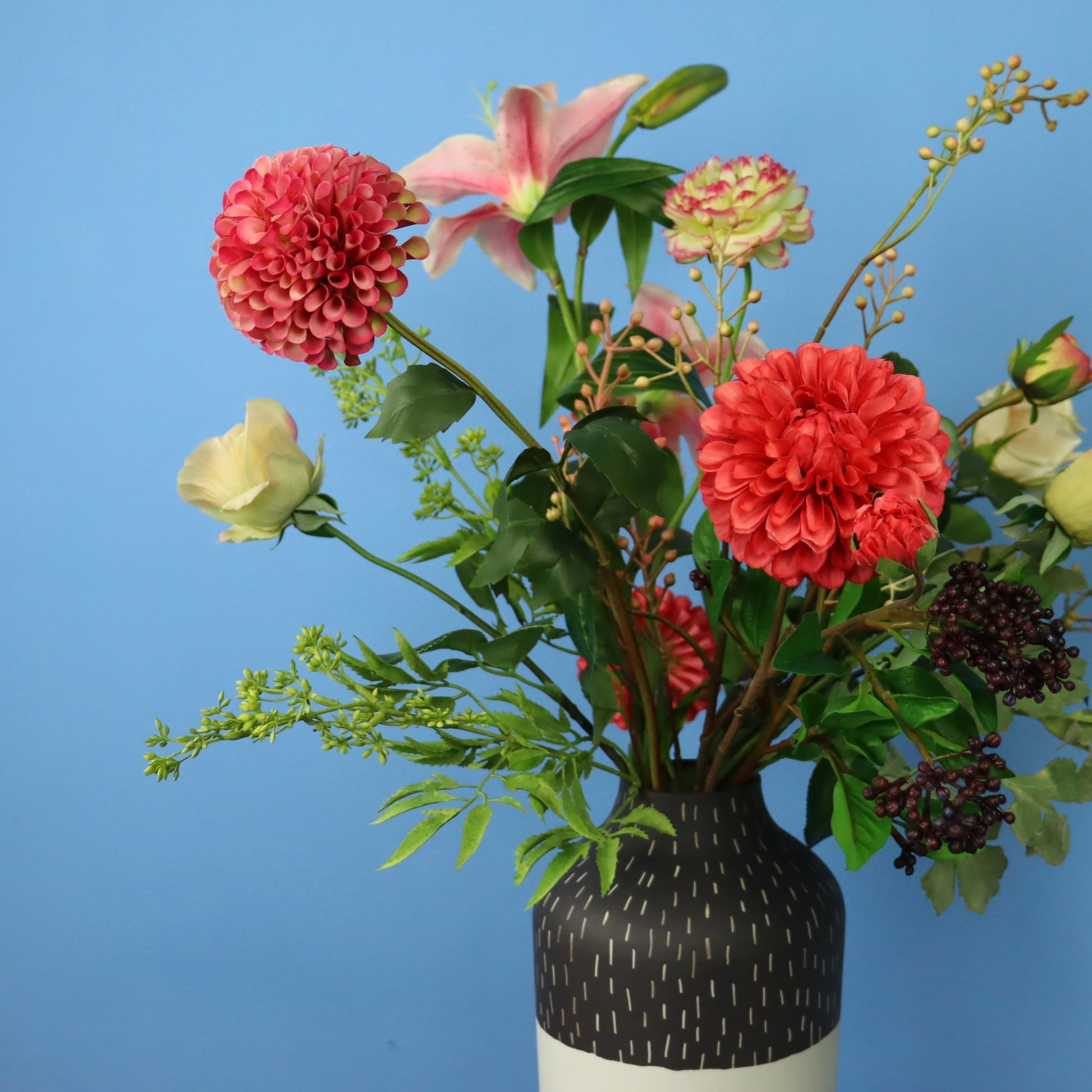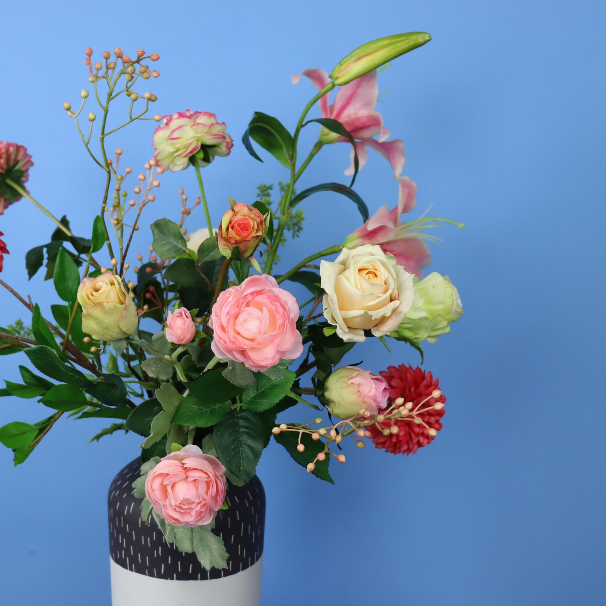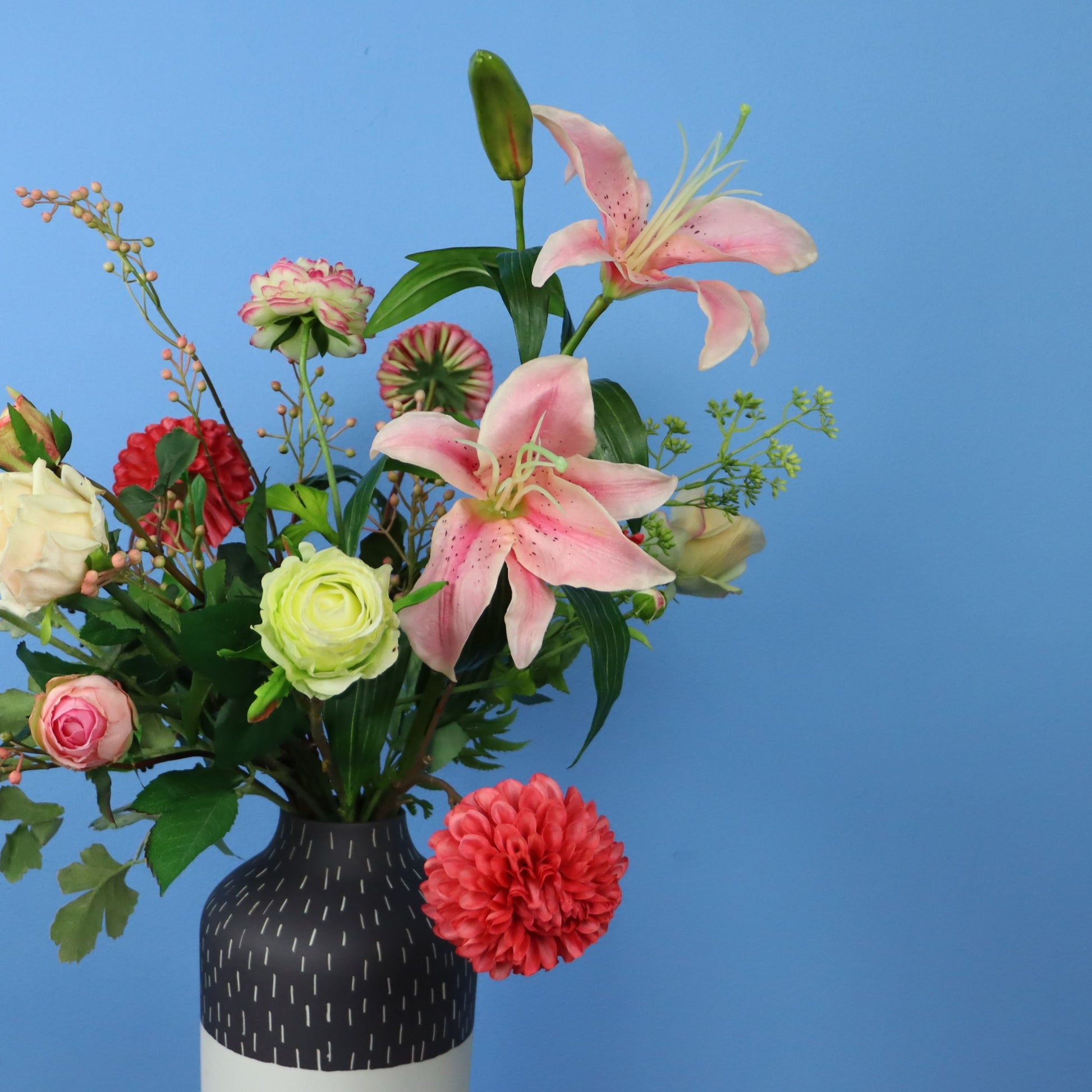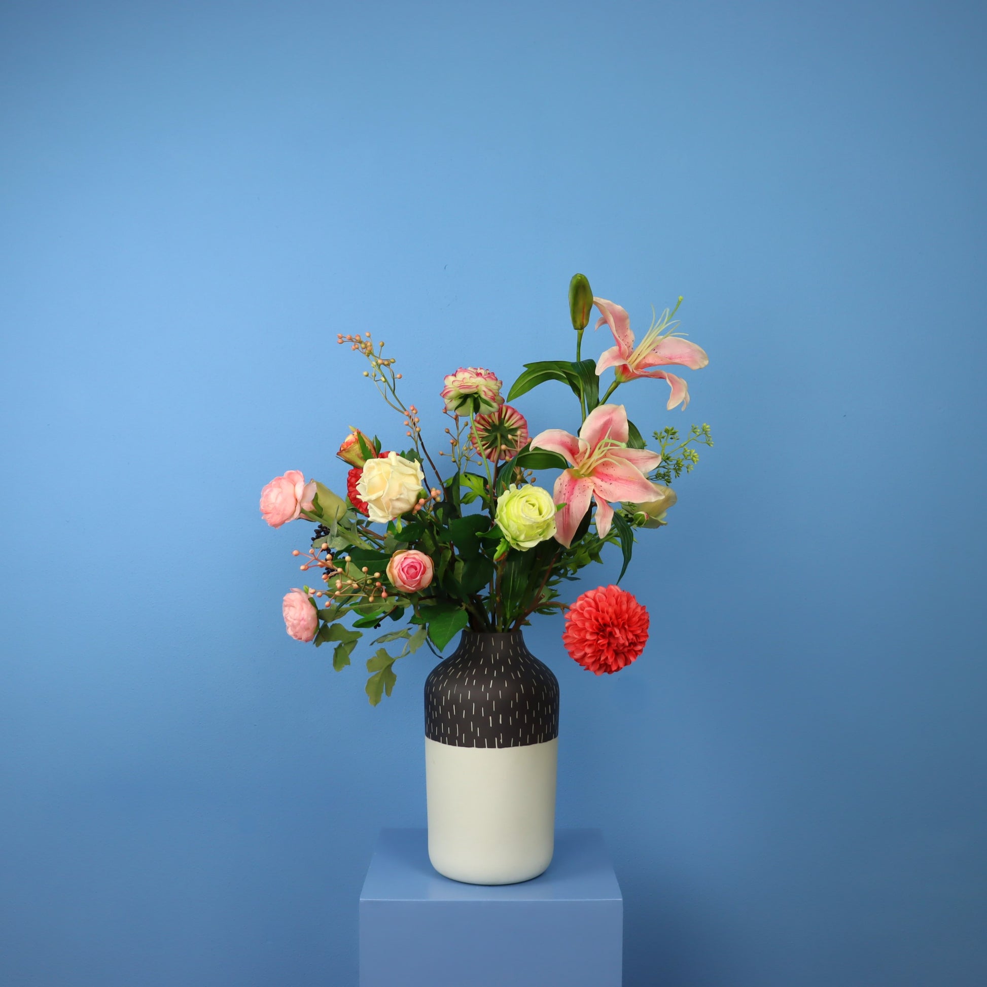 Prachtige handgemaakte vaas van studio Harm & Elke met een kleurrijke bos bloemen waaronder een roze lelie, ranonkels, dahlia's en rozen.