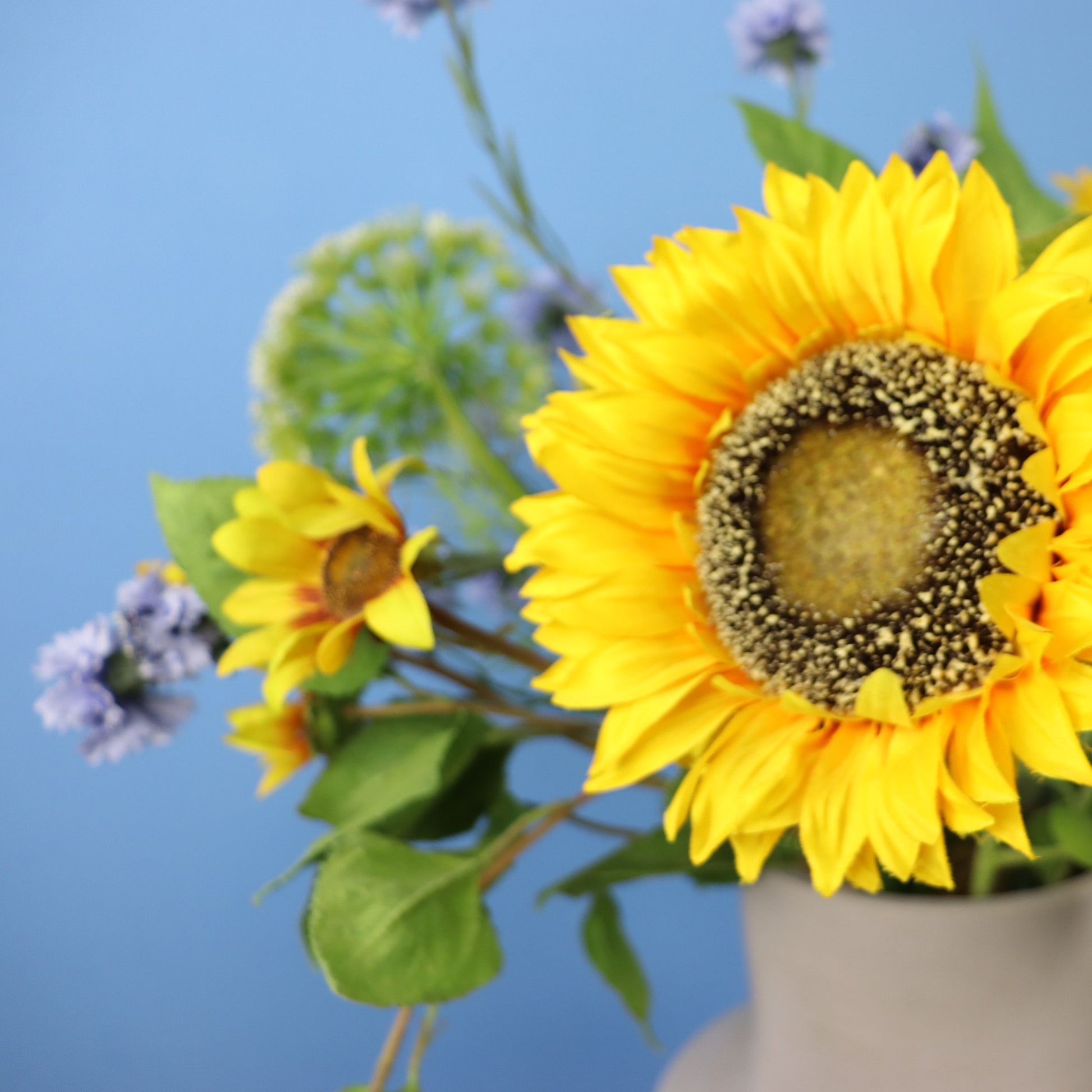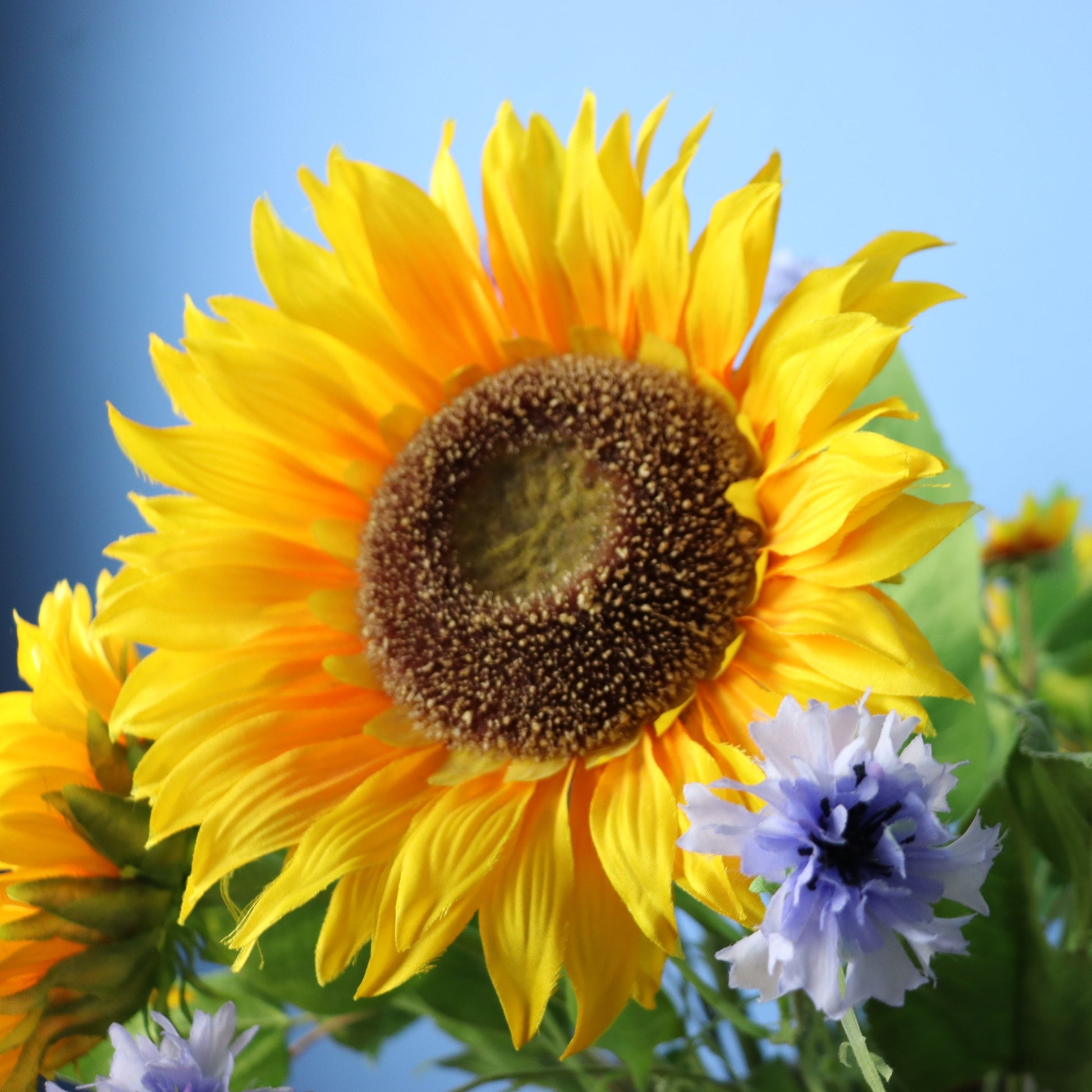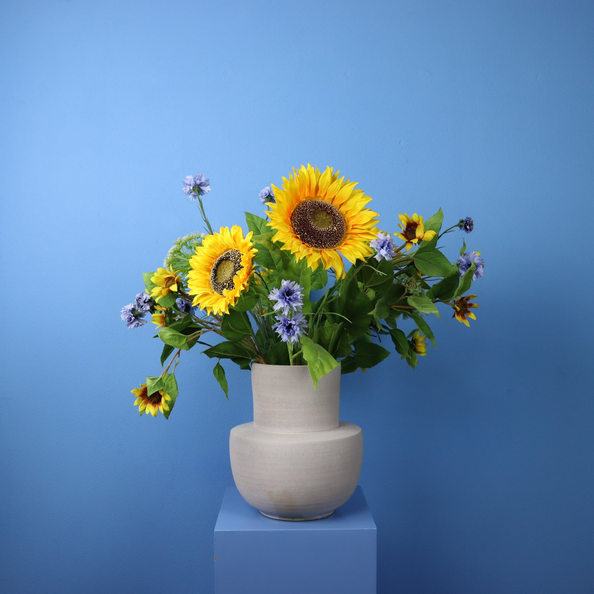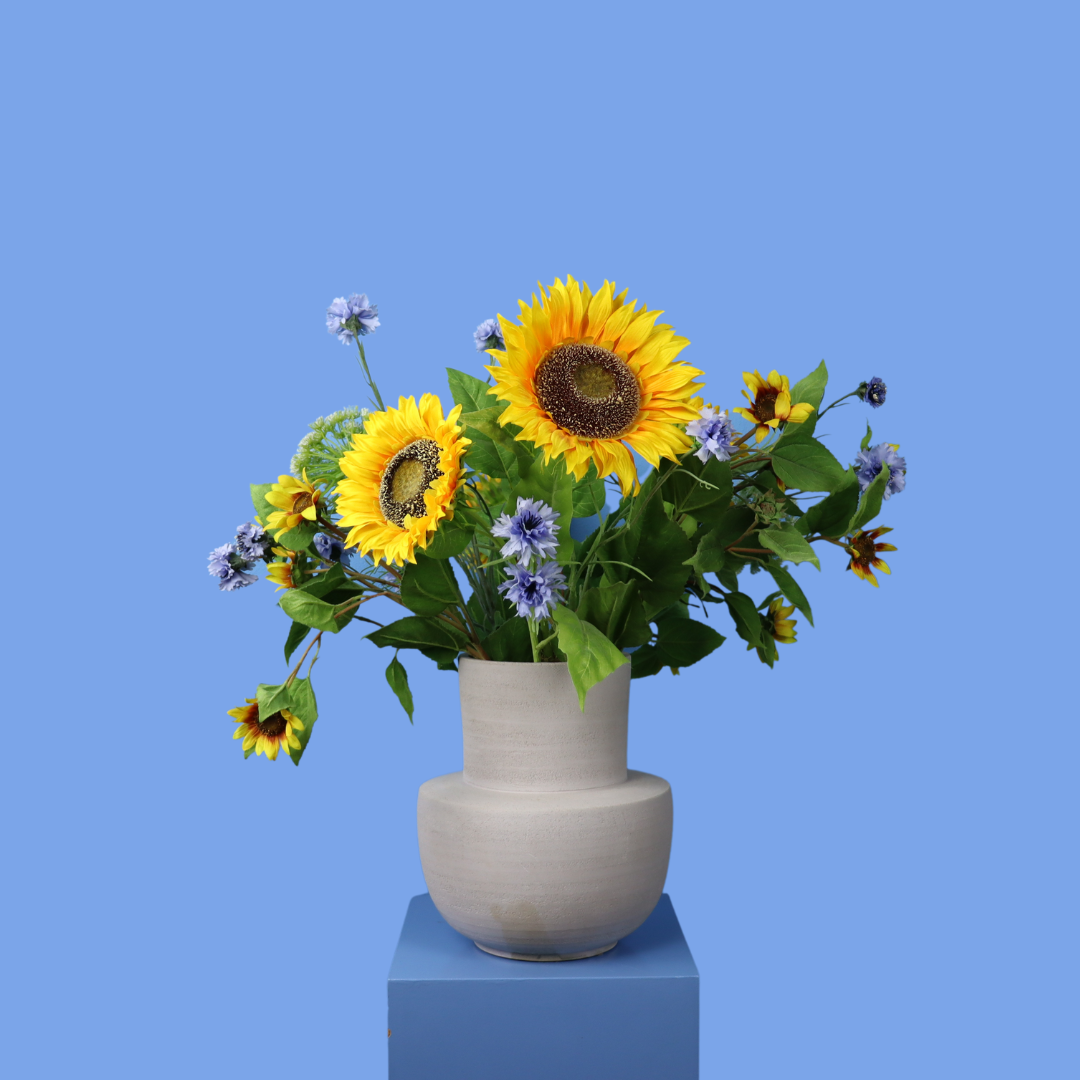 Deze ultra moderne Piet Boon vaas van beton wordt geleverd met zonnige zonnebloemen en korenbloemen.
