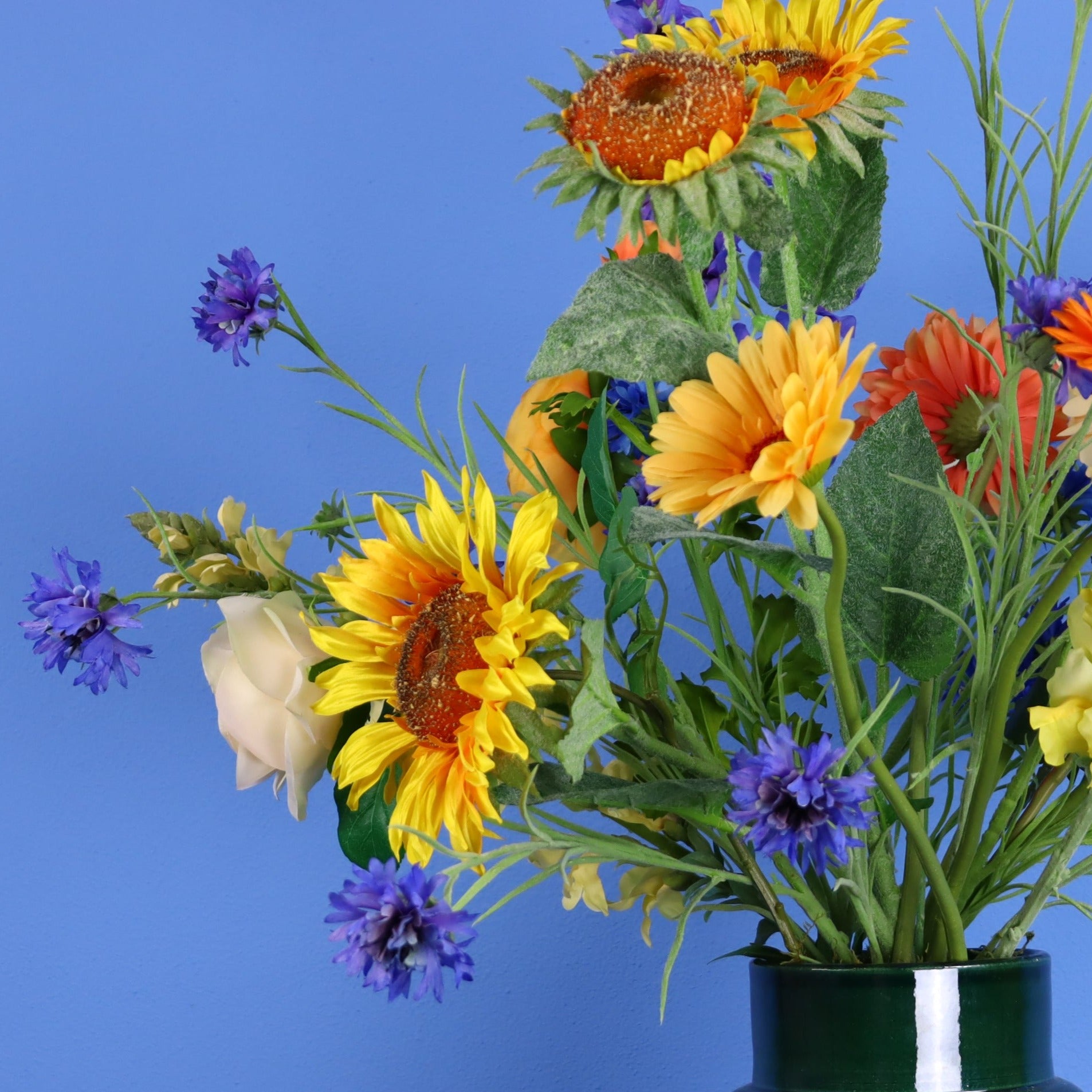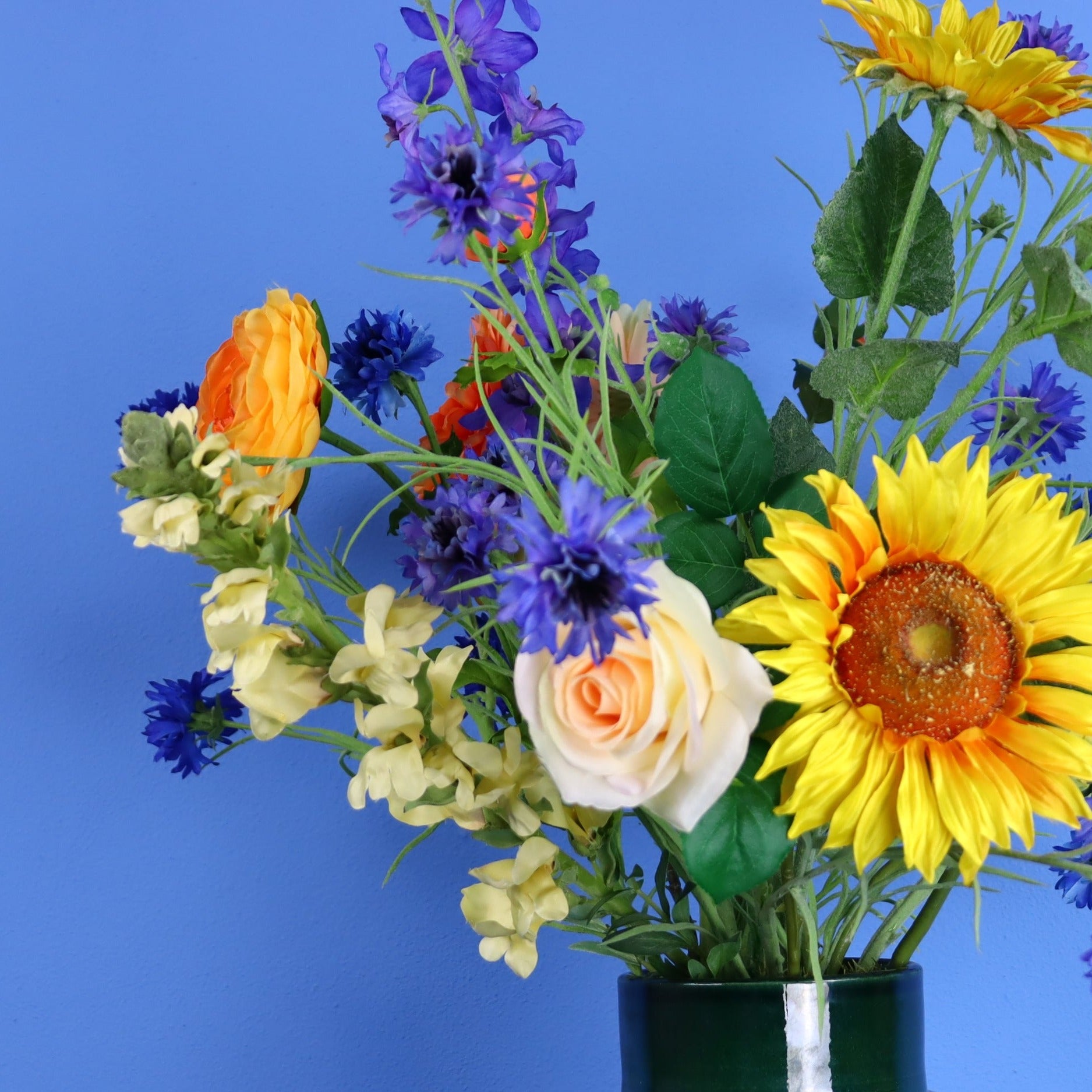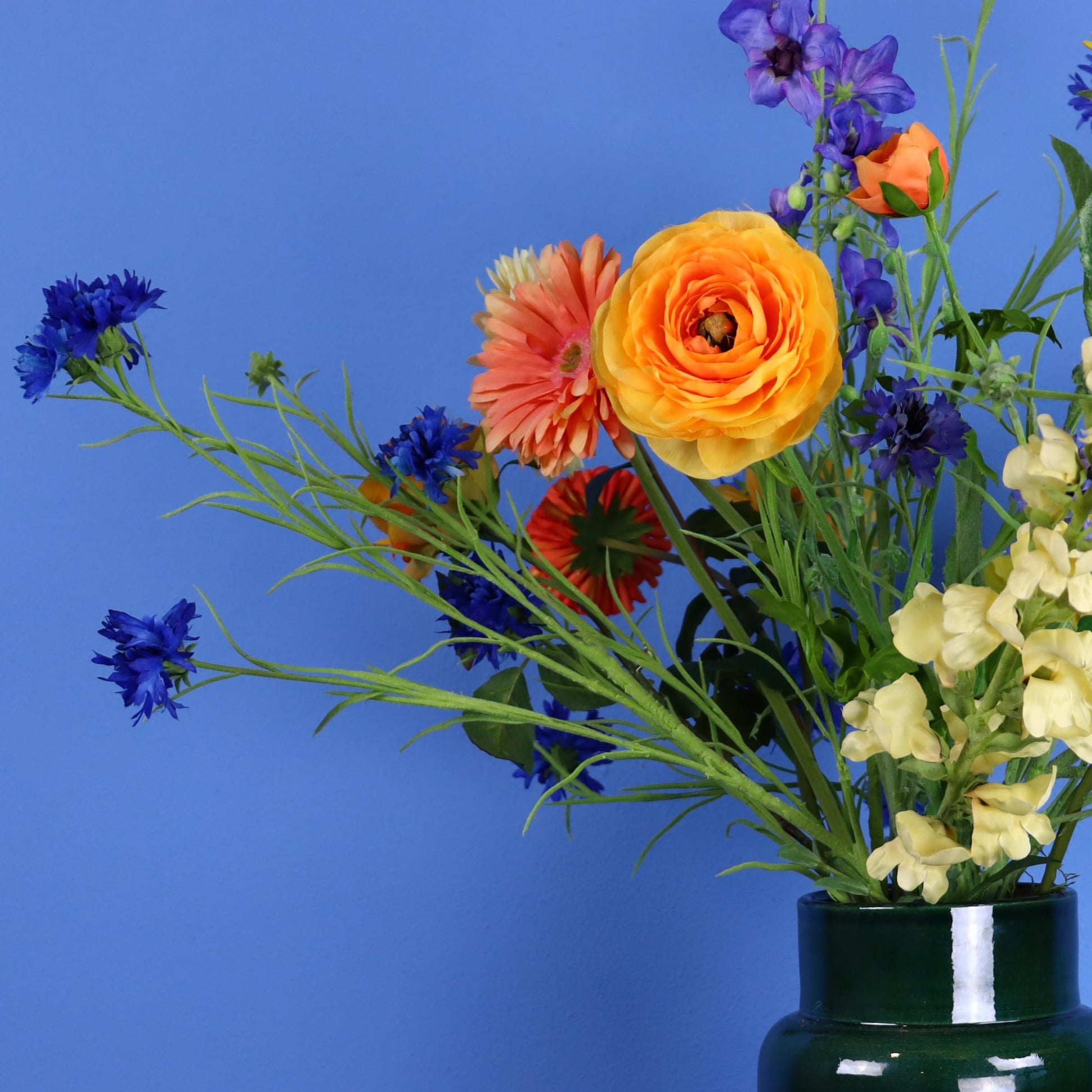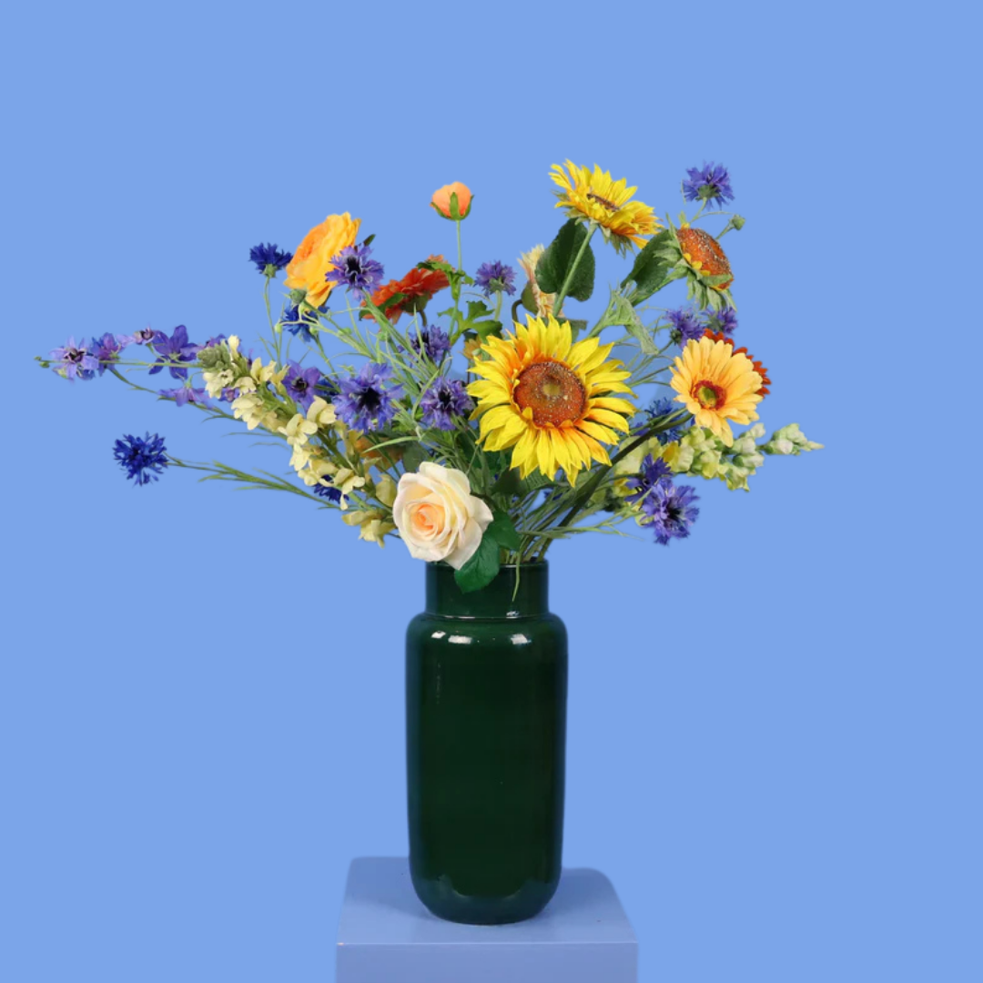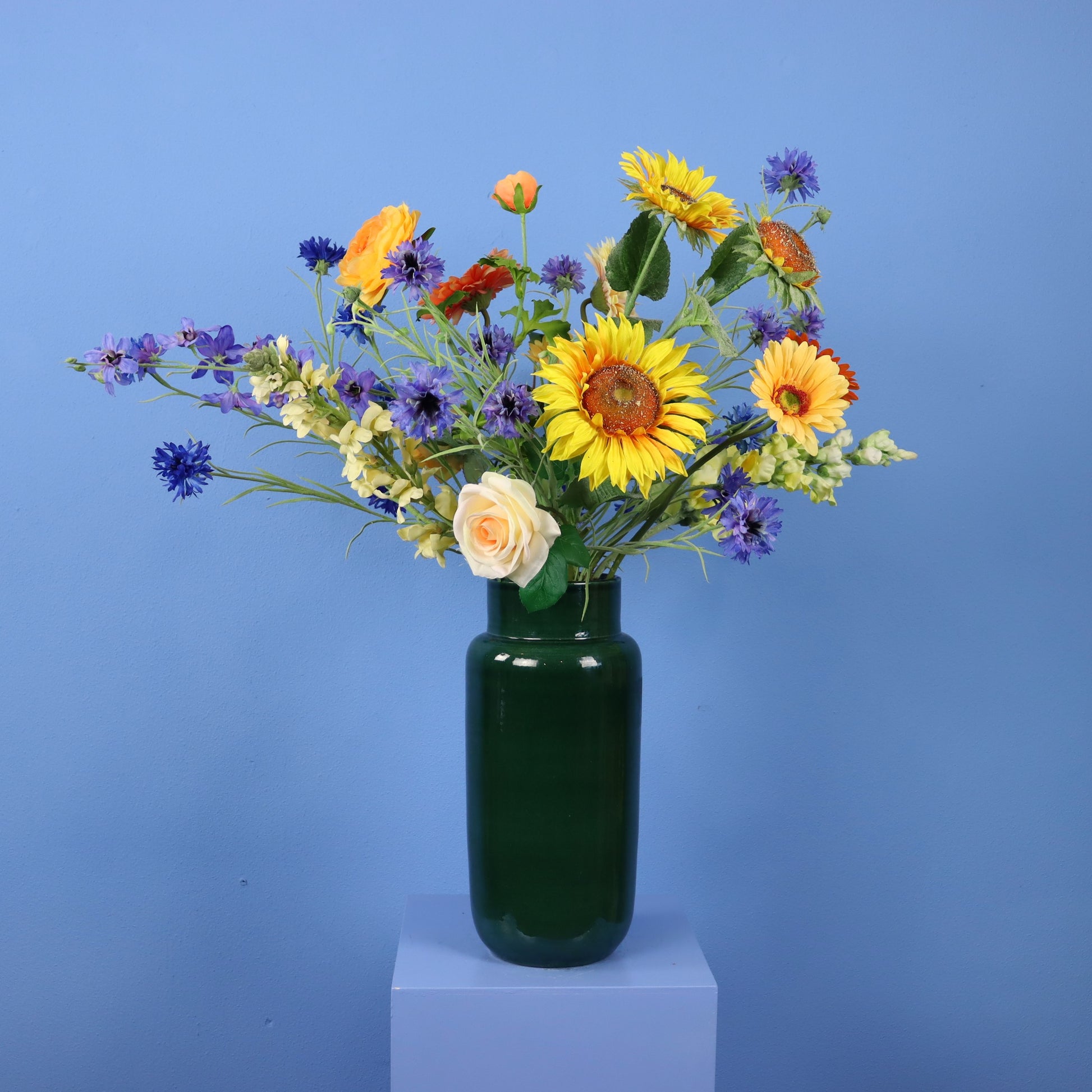 Deze prachtige donkergroene designvaas van Serax komt met een verscheidenheid aan de mooiste bloemen zoals rozen, zonnebloemen, korenbloemen en gerbera's.