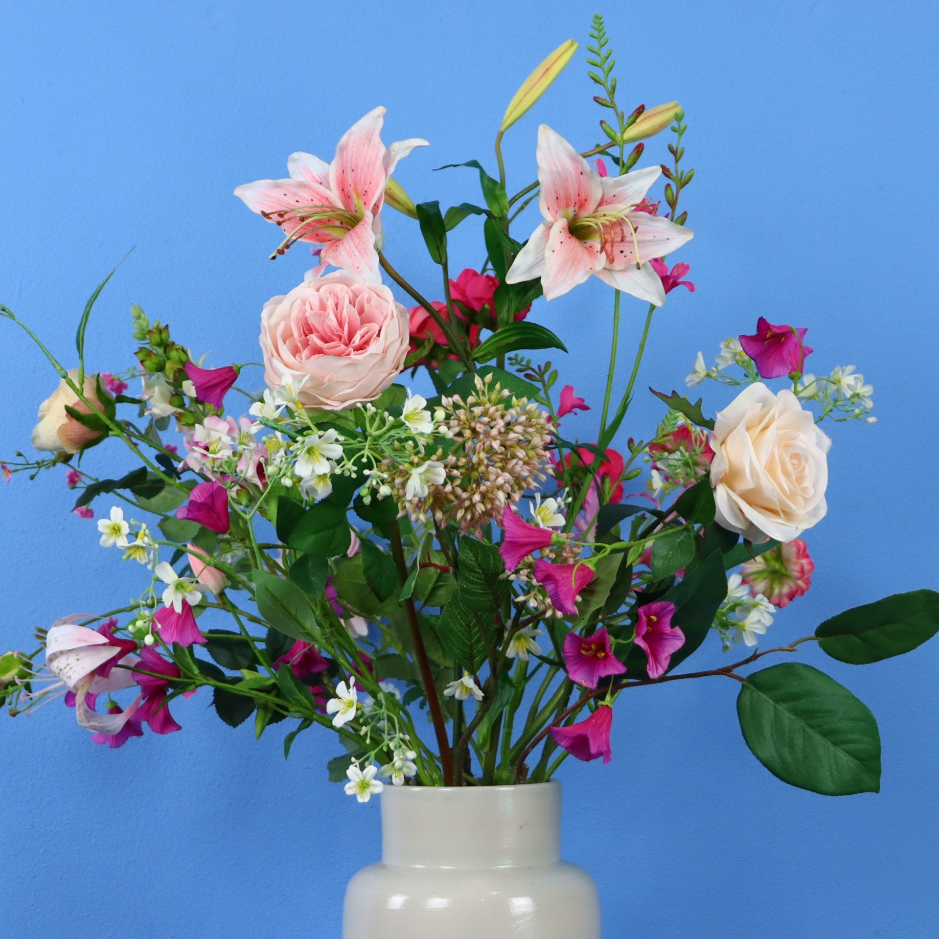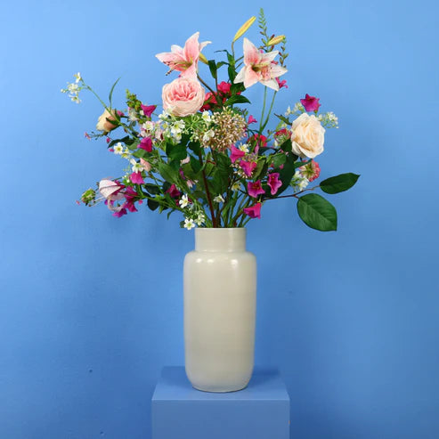 Mooie hoge beige / grijze vaas van designerbrand Serax met een combinatie van prachtige wit en roze bloemen, waaronder rozen, gerbera´s en lelies.