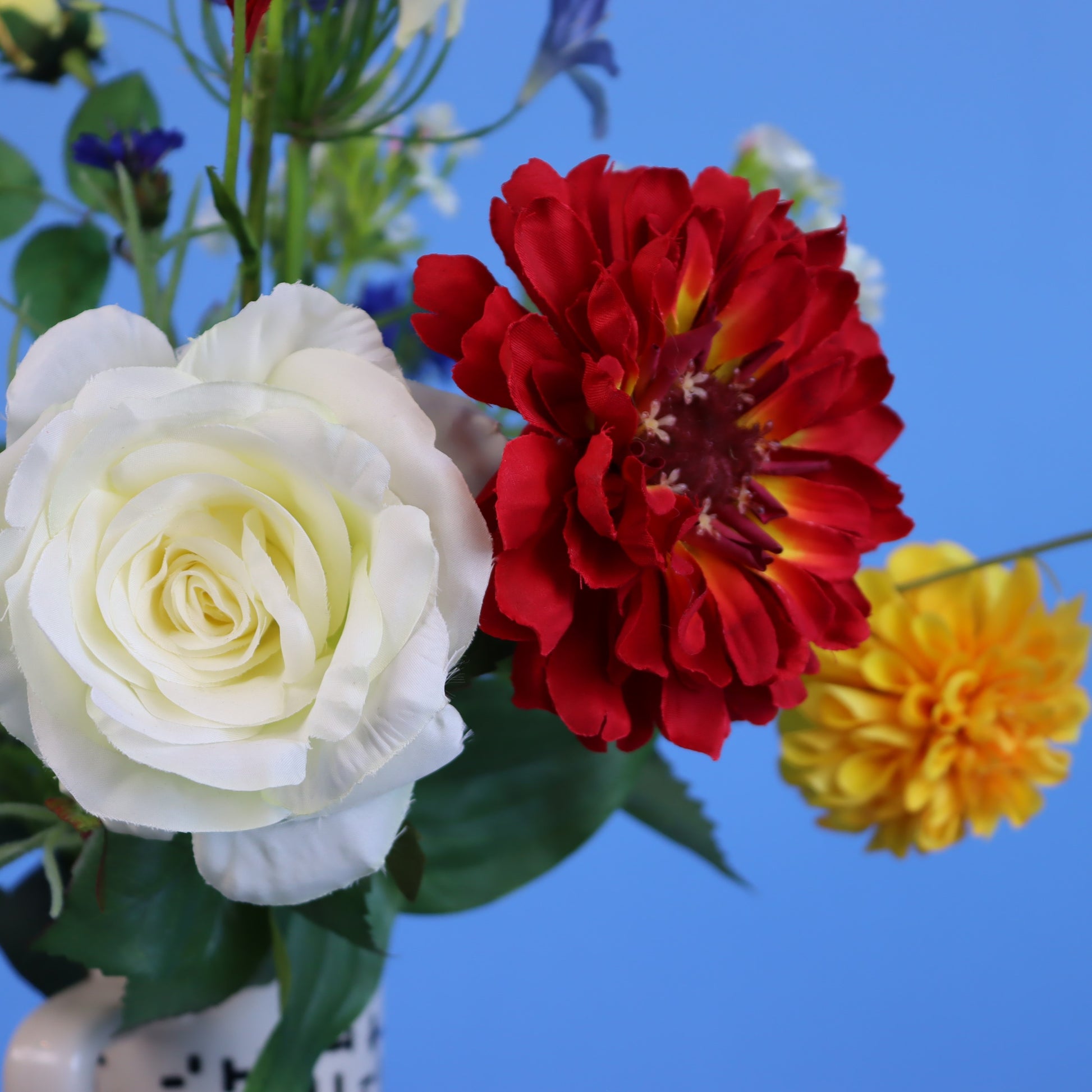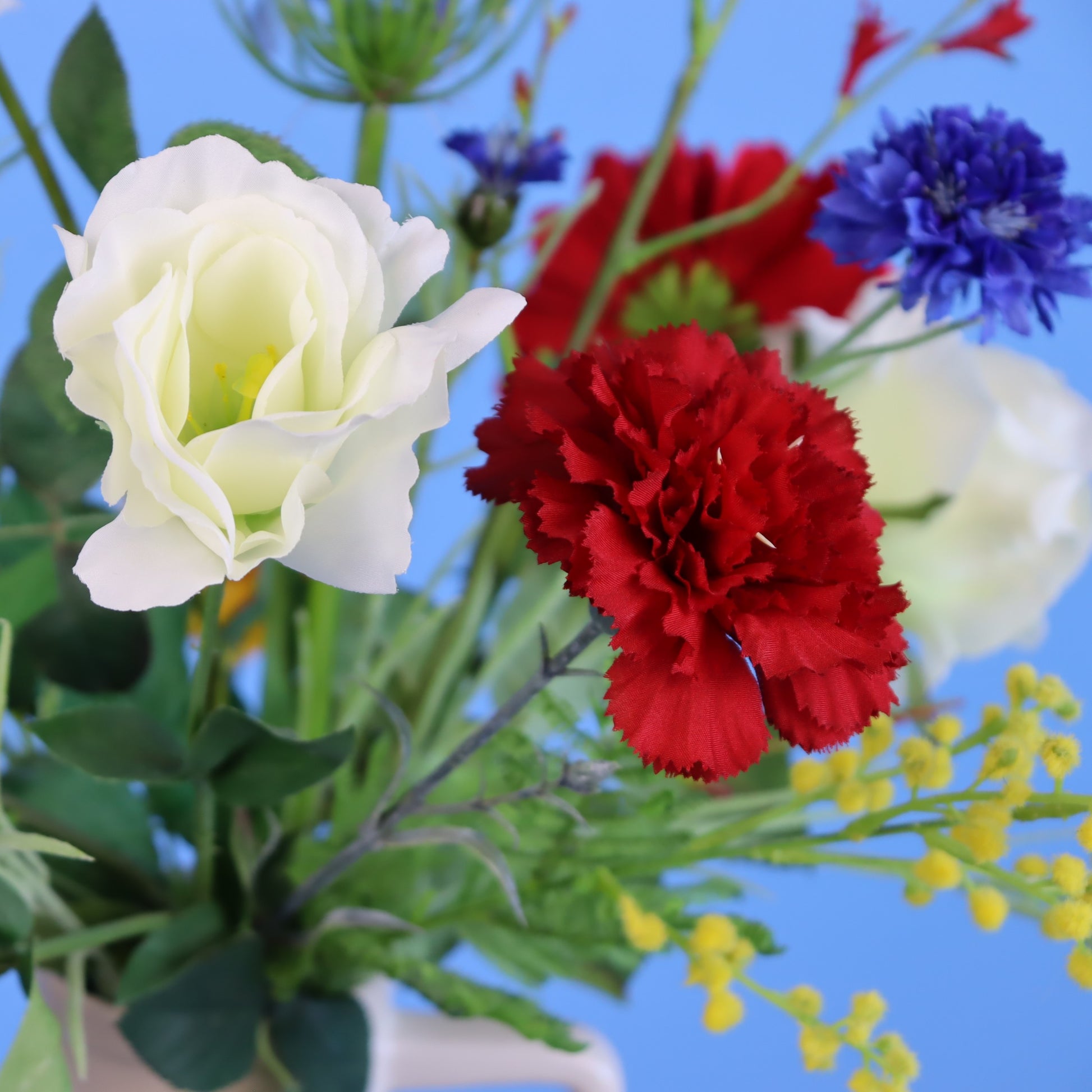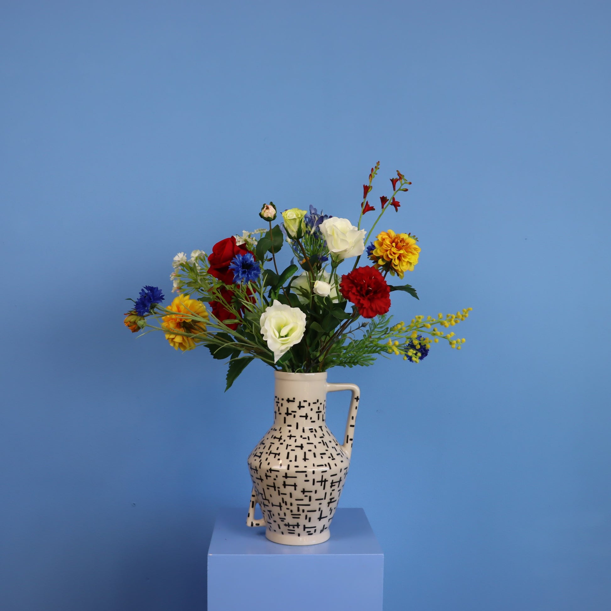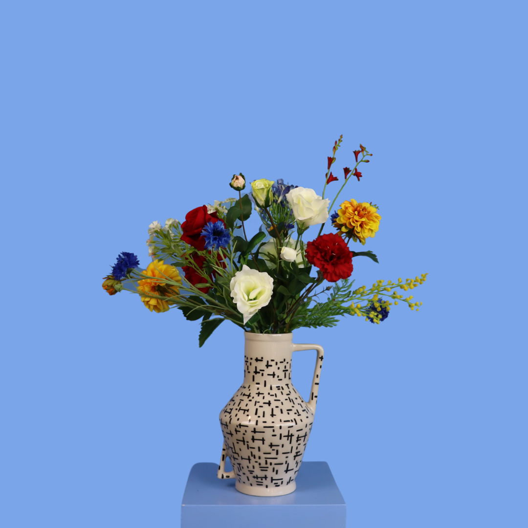 Deze Return to Sender vaas met streepdesign is gevuld met een kleurrijk boeket van rood wit blauw. Een gave mix van blijvende bloemen.