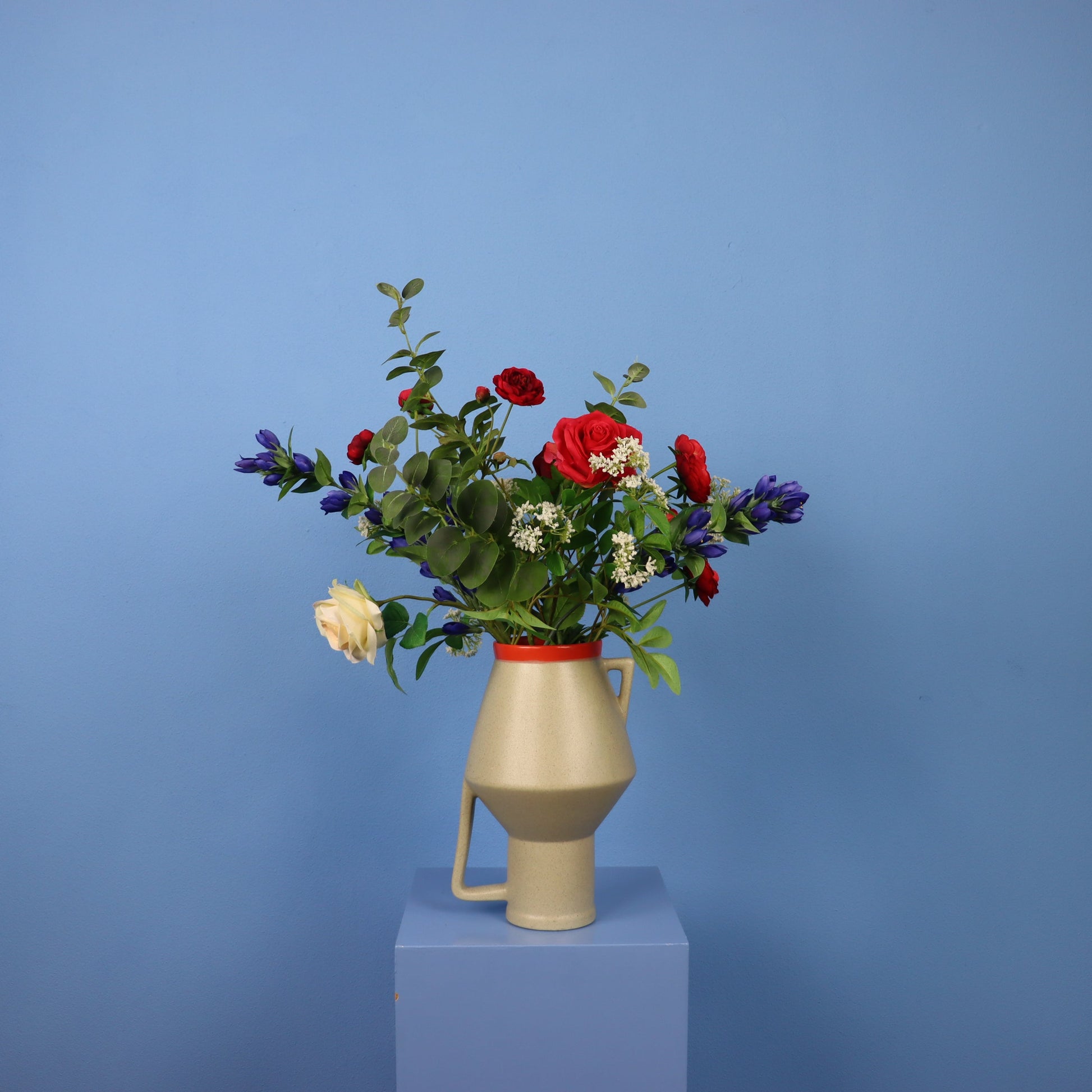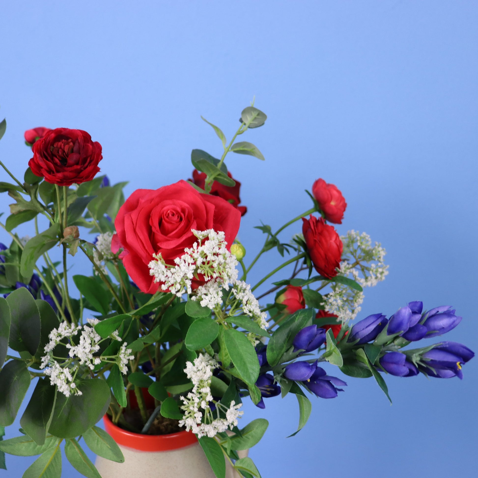 Deze Return to Sender vaas heeft een fel oranje rand en komt met bijpassend boeket.