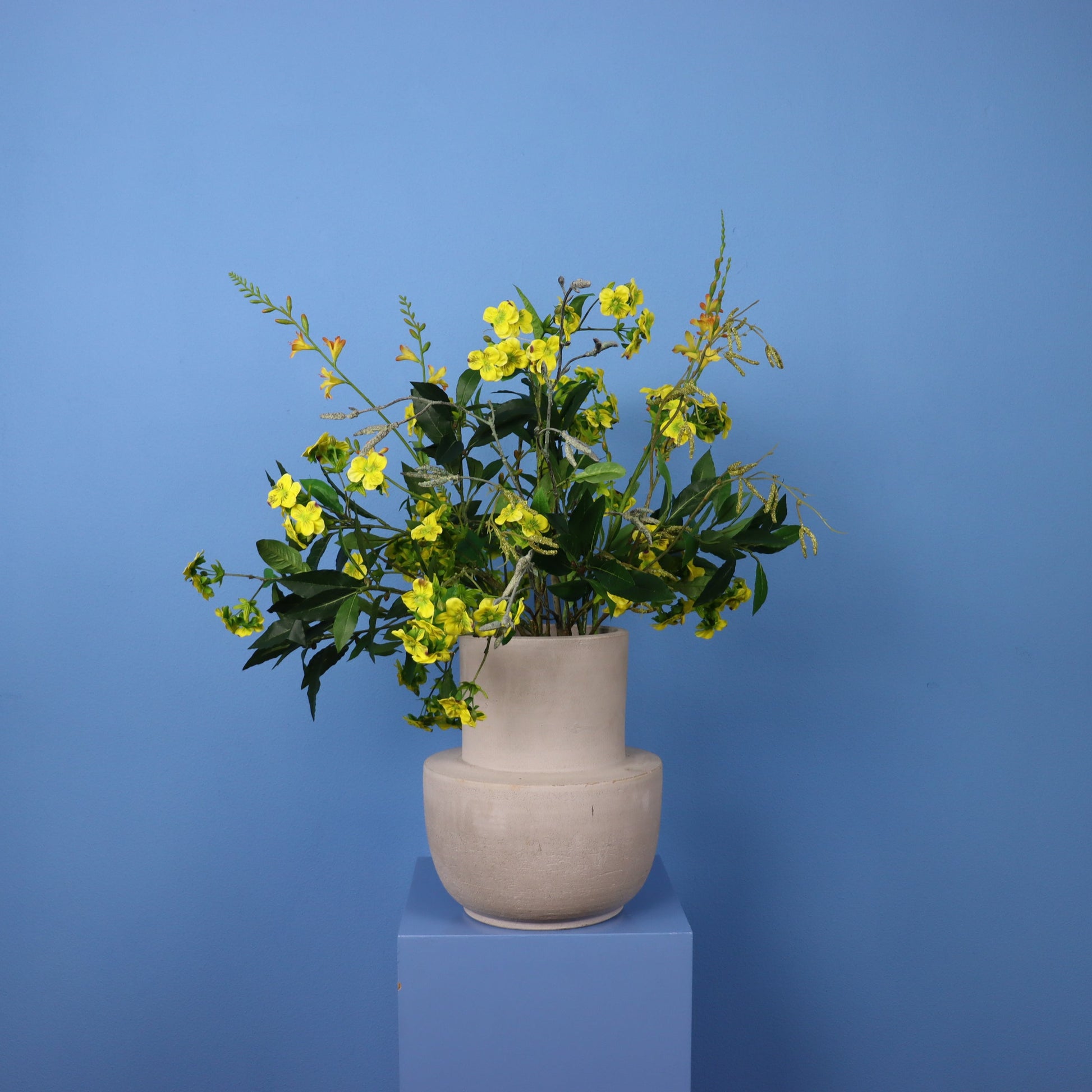 Deze prachtige betonnen piet boon vaas met vrolijk geel boeket.