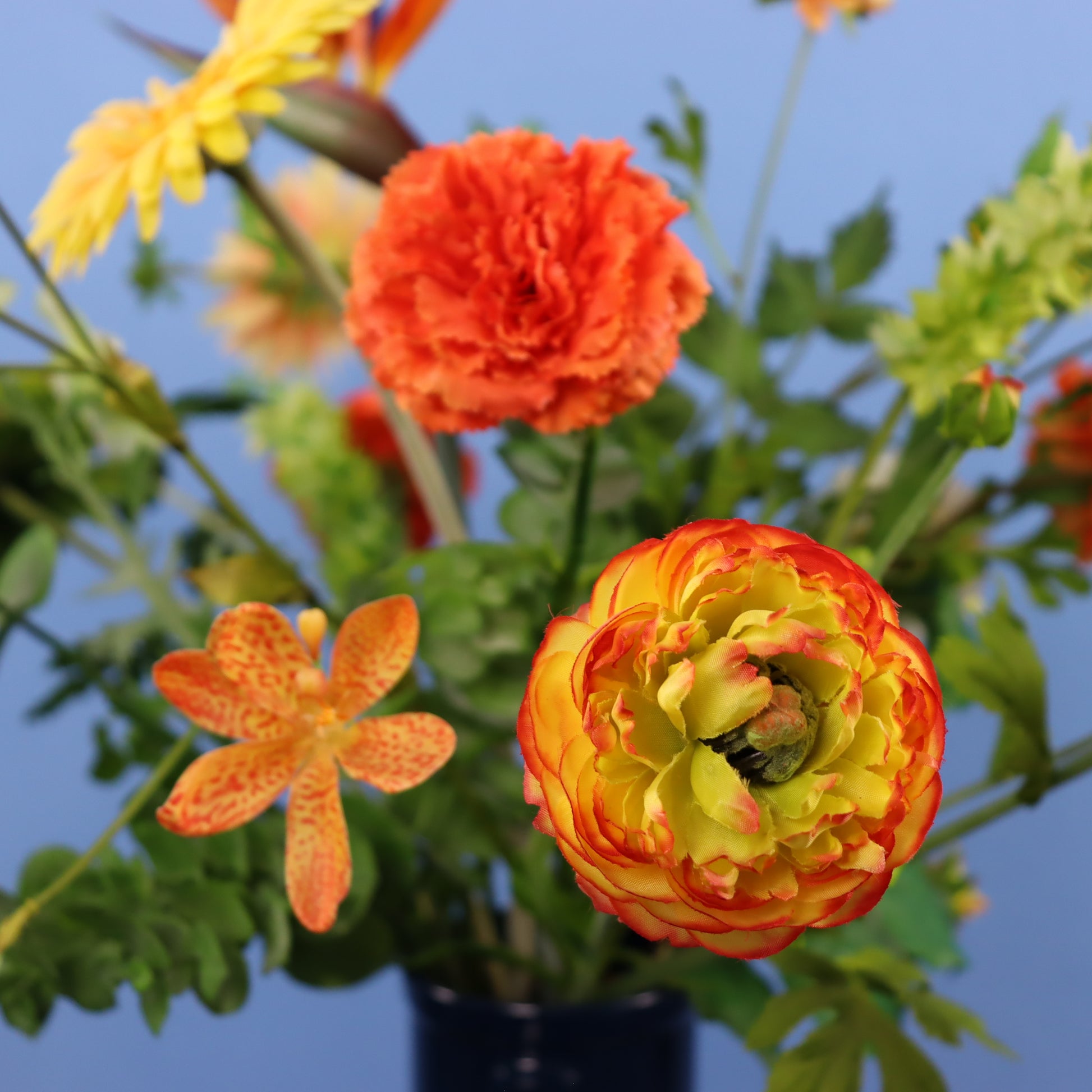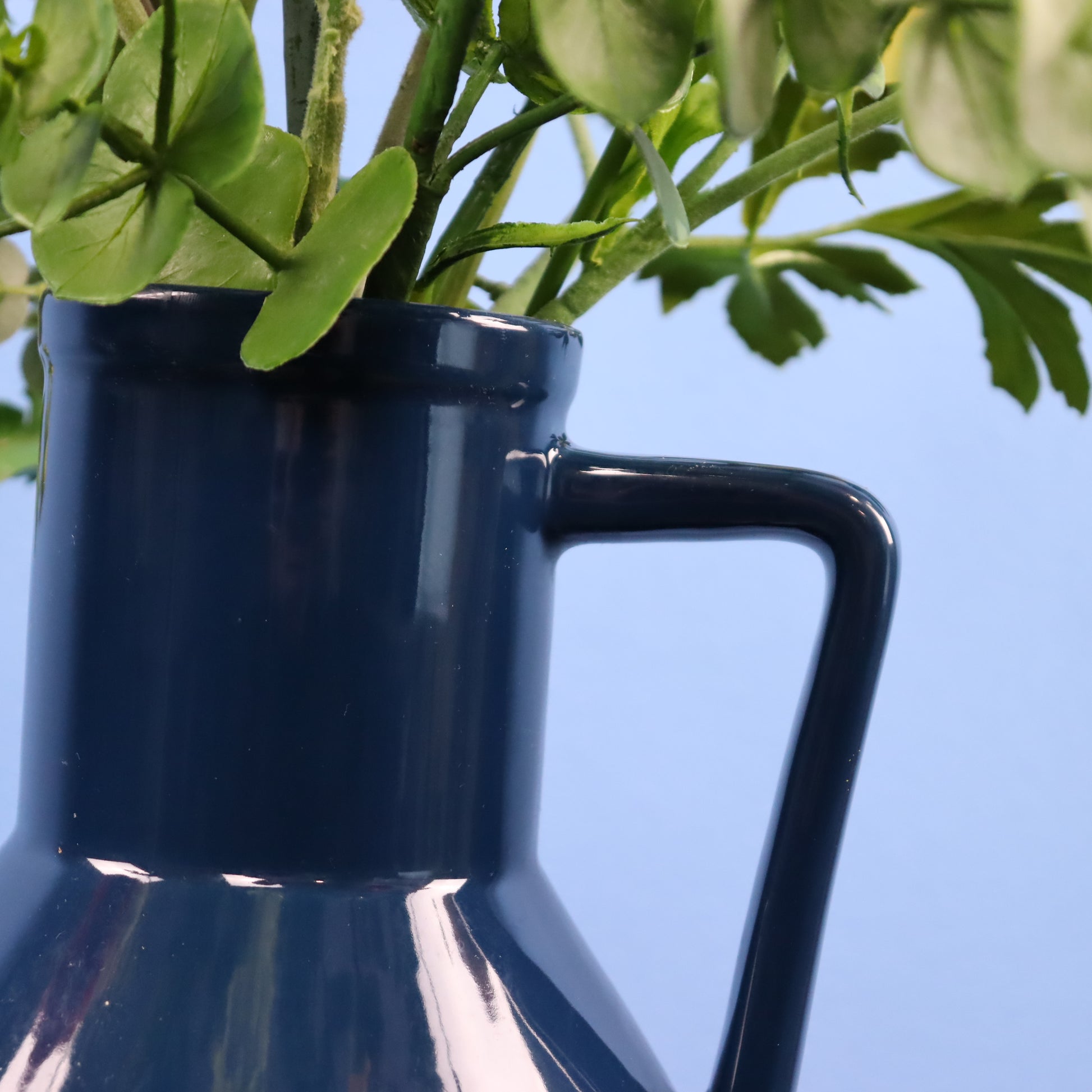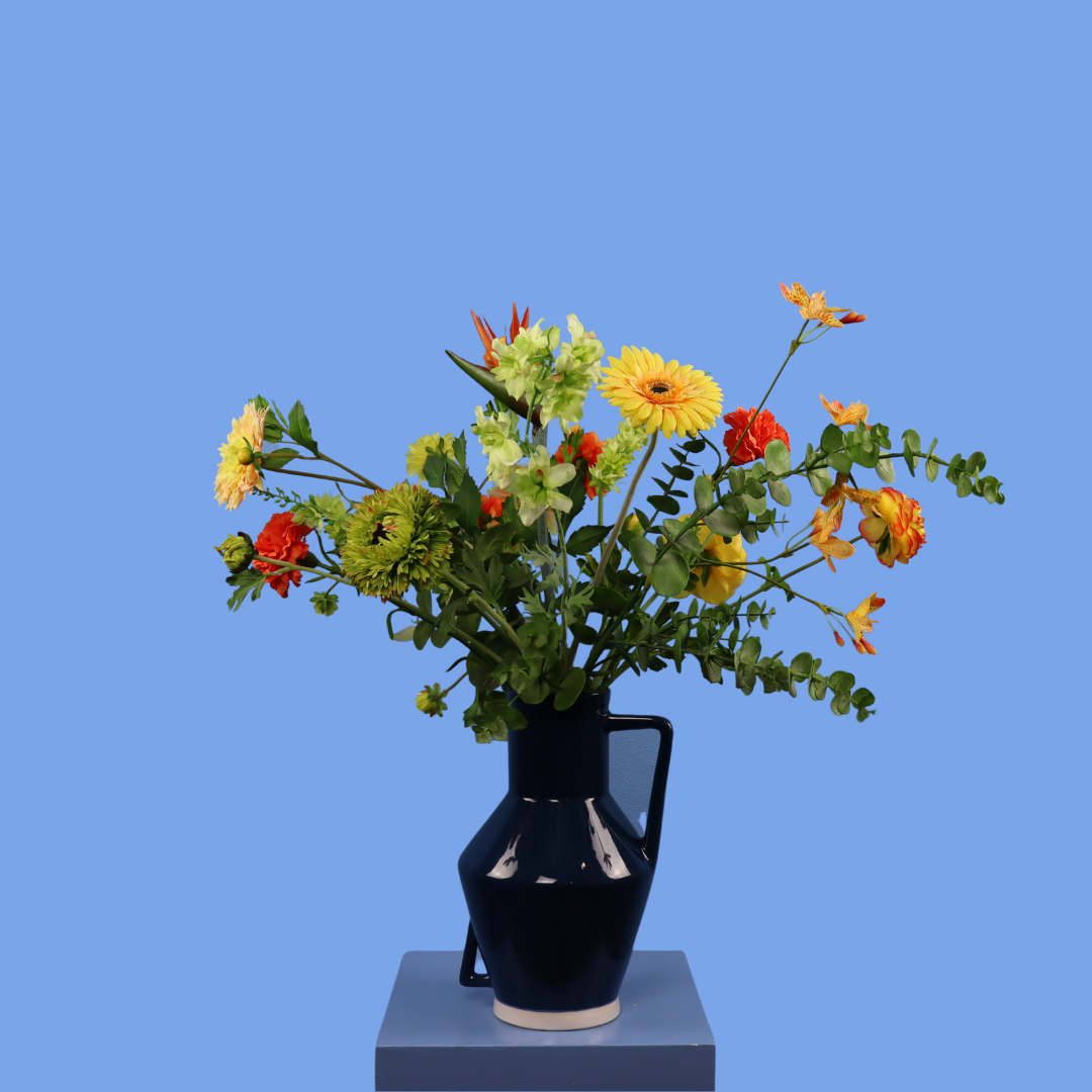 Deze donkerblauwe Return to Sender vaas komt met een herfstboeket.