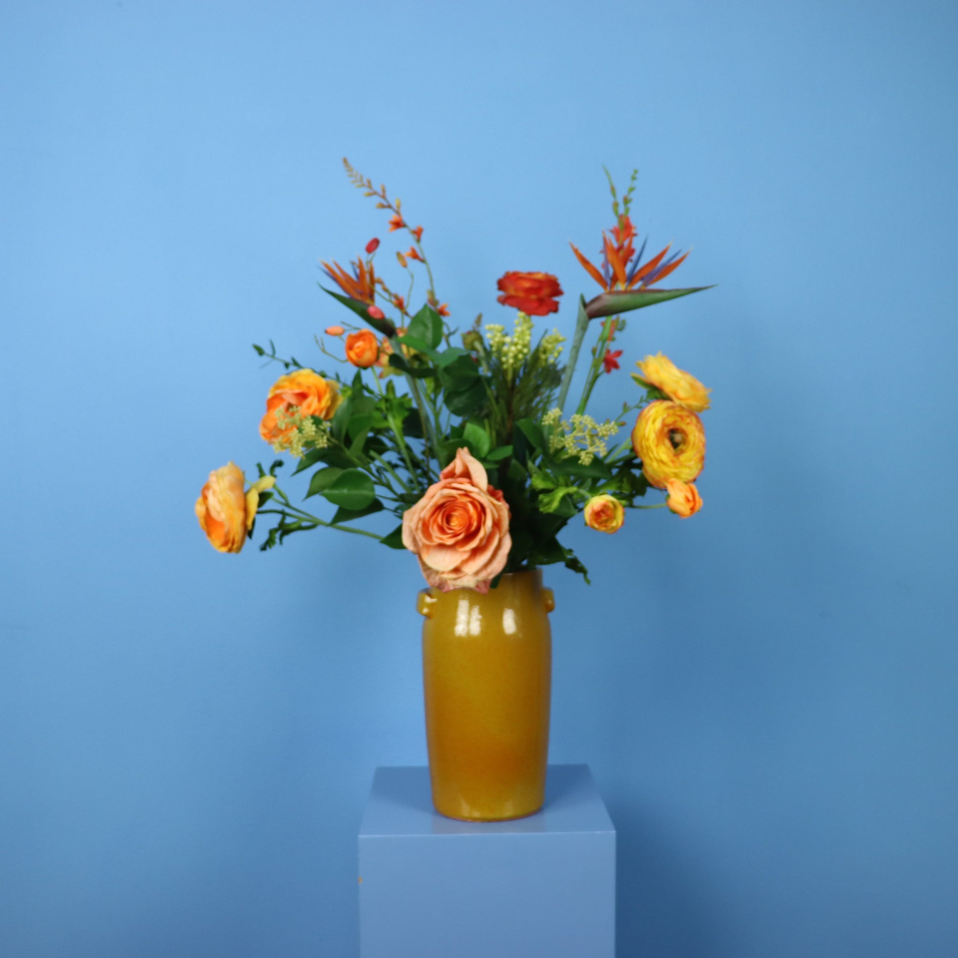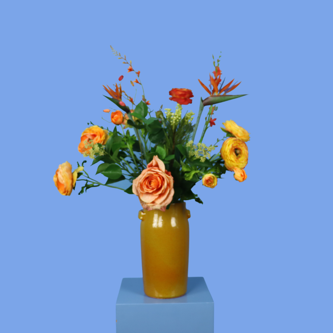 Mosterd-kleurige designvaas van Serax vaas met een oranje boeket.