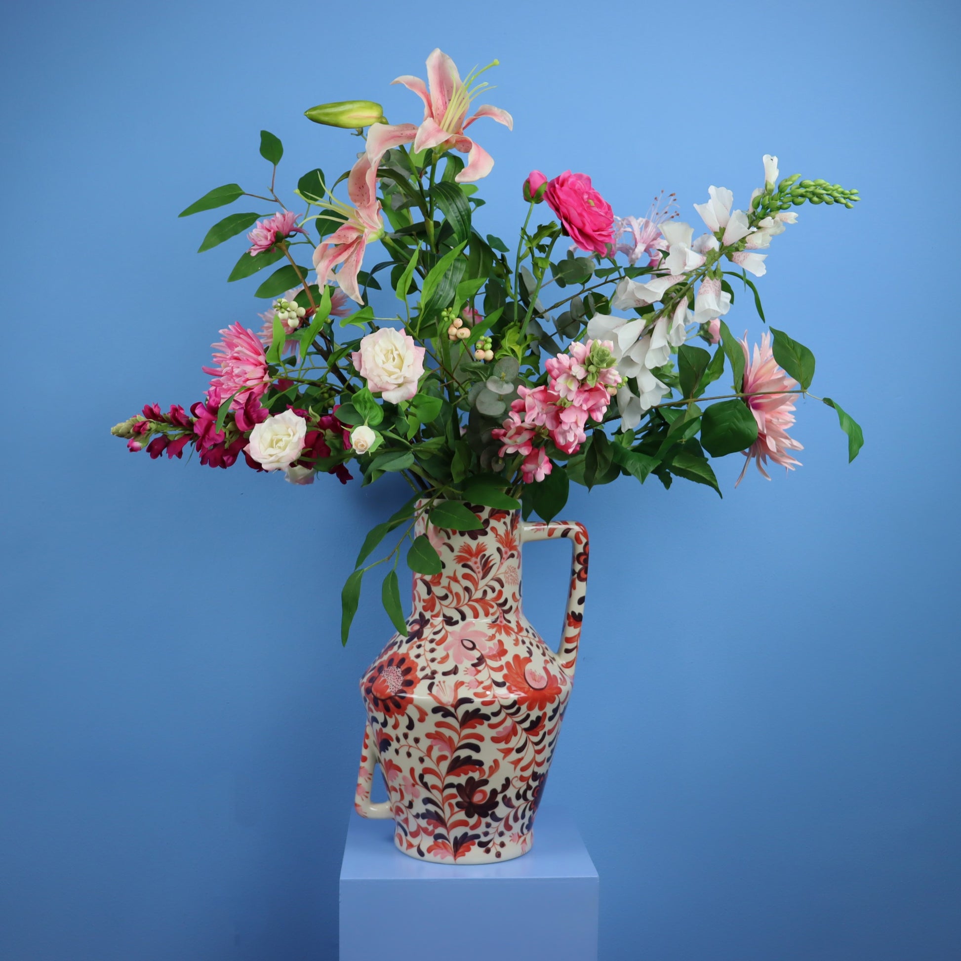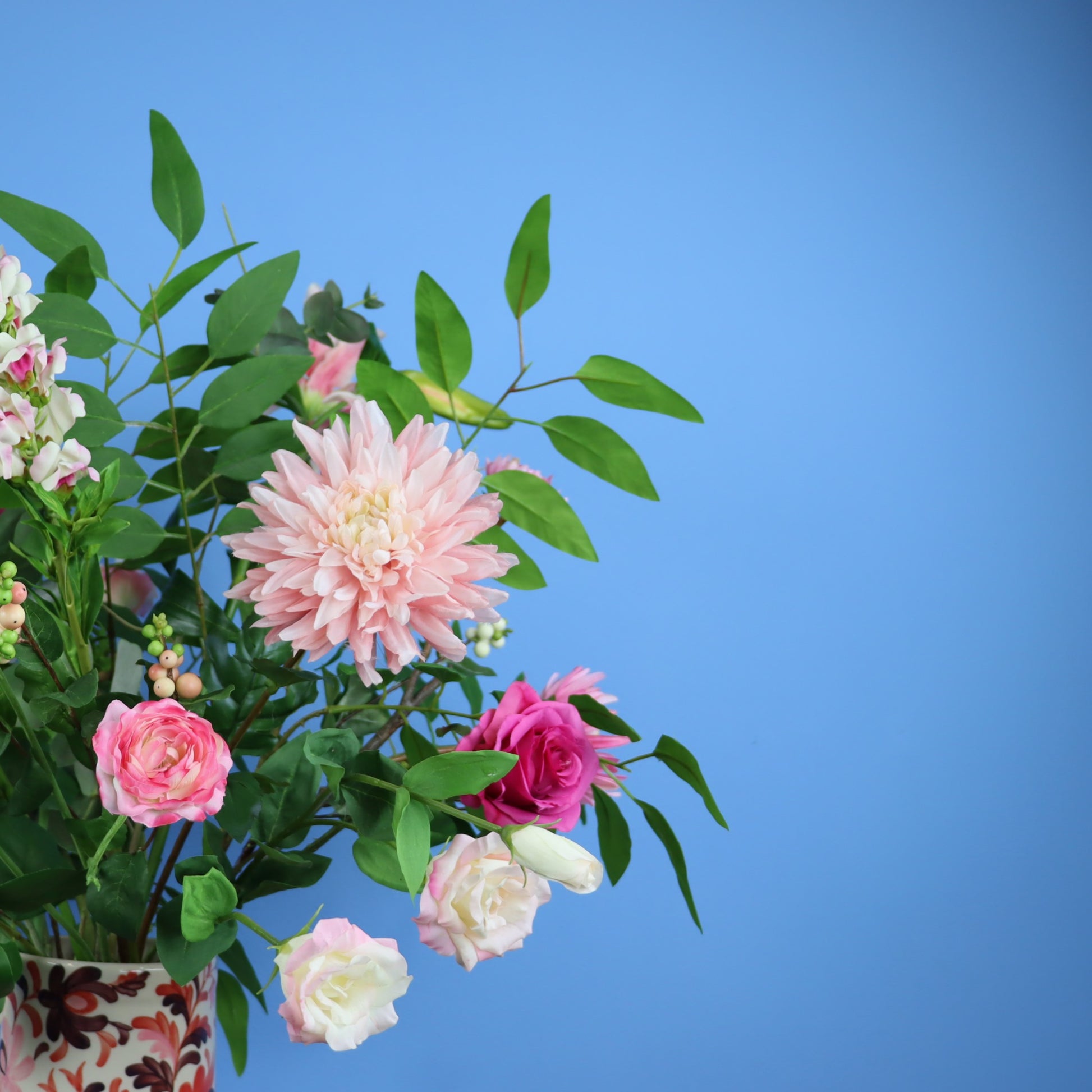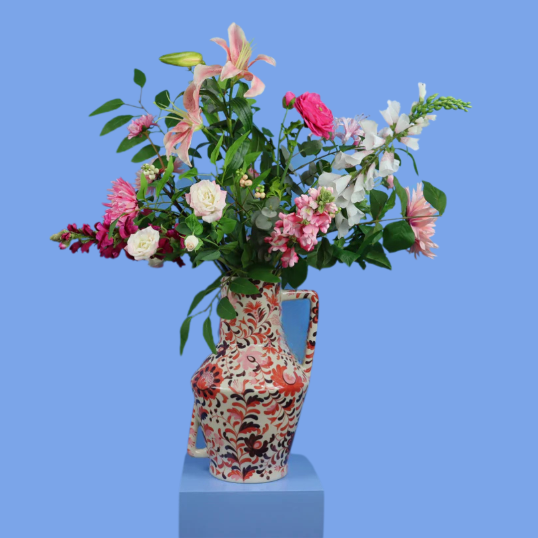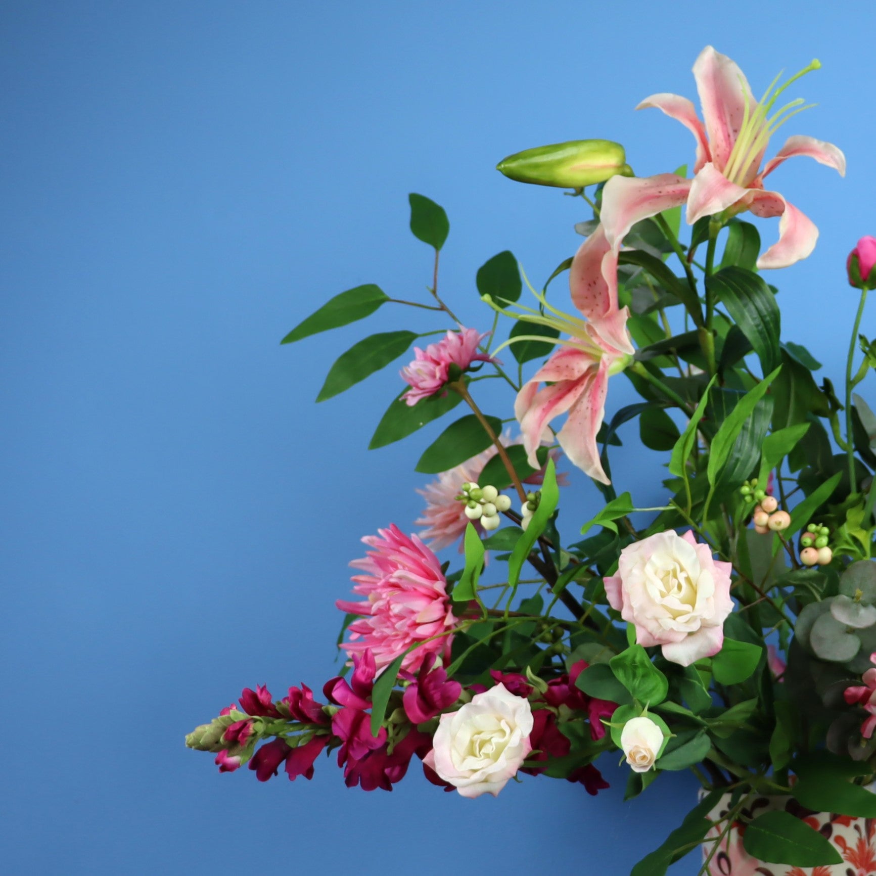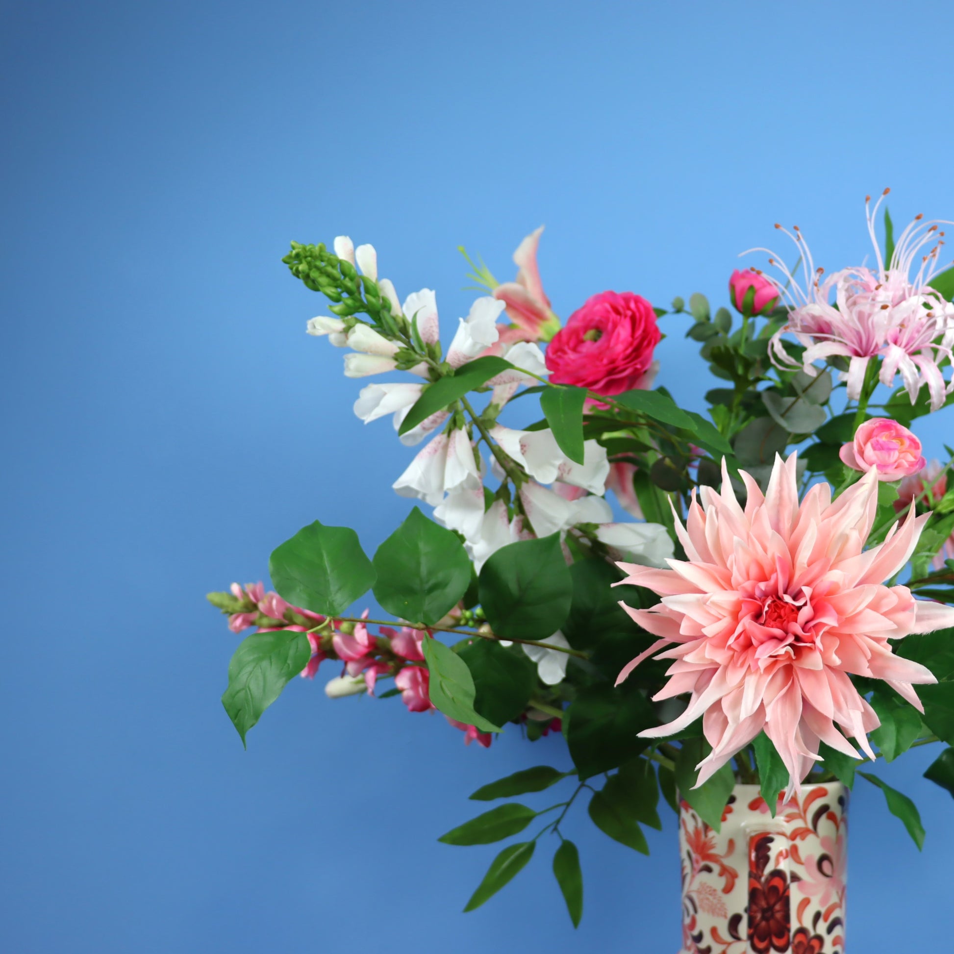 Return to Sender vaas met diverse soorten roze en witte bloemen, zoals ranonkels, dahlia's en lelies.