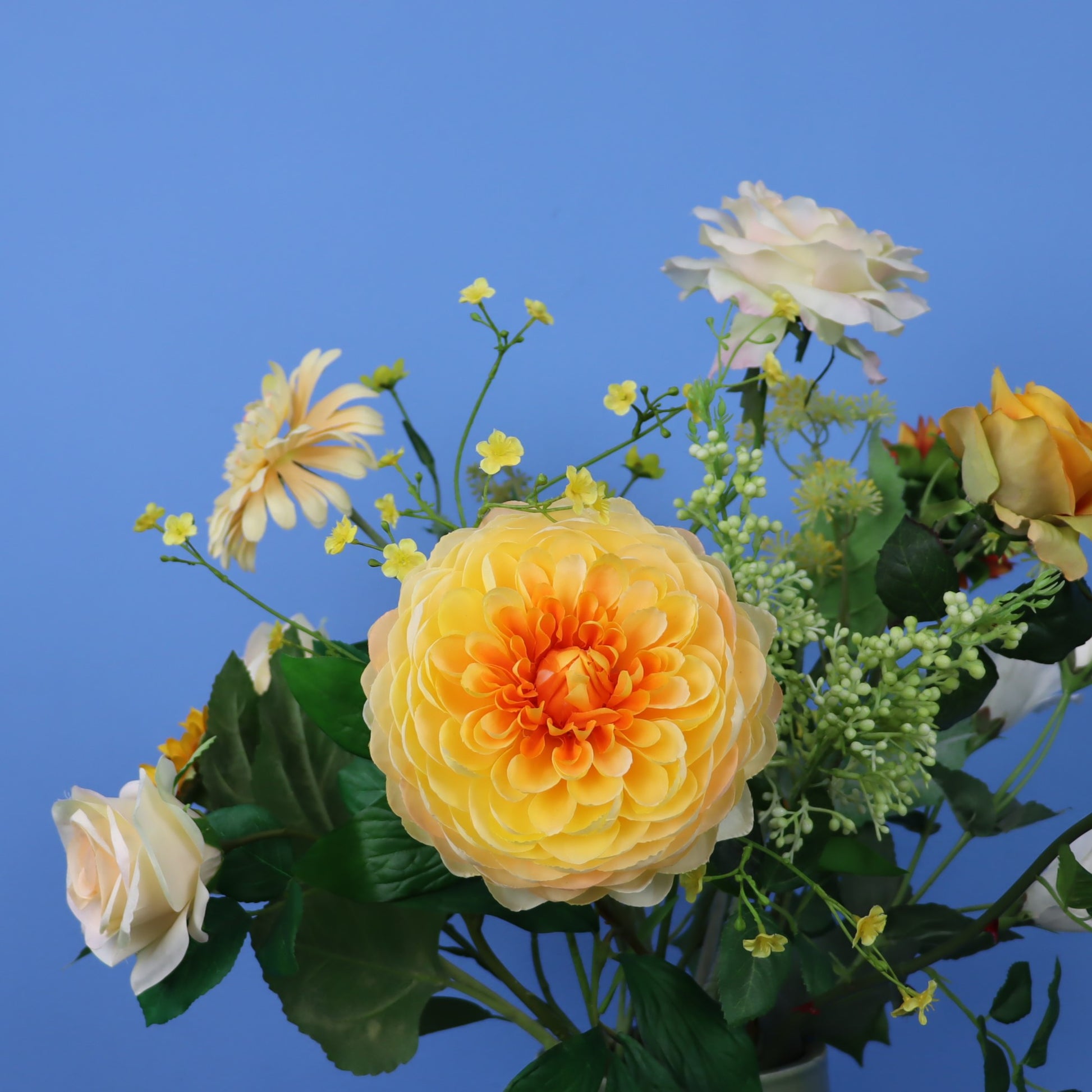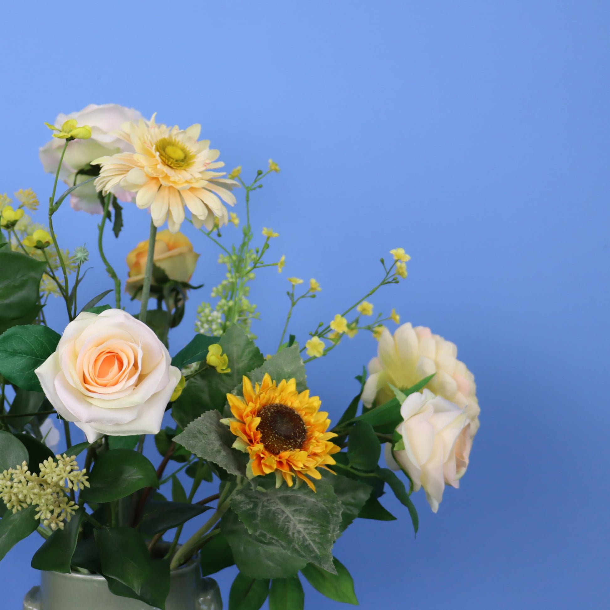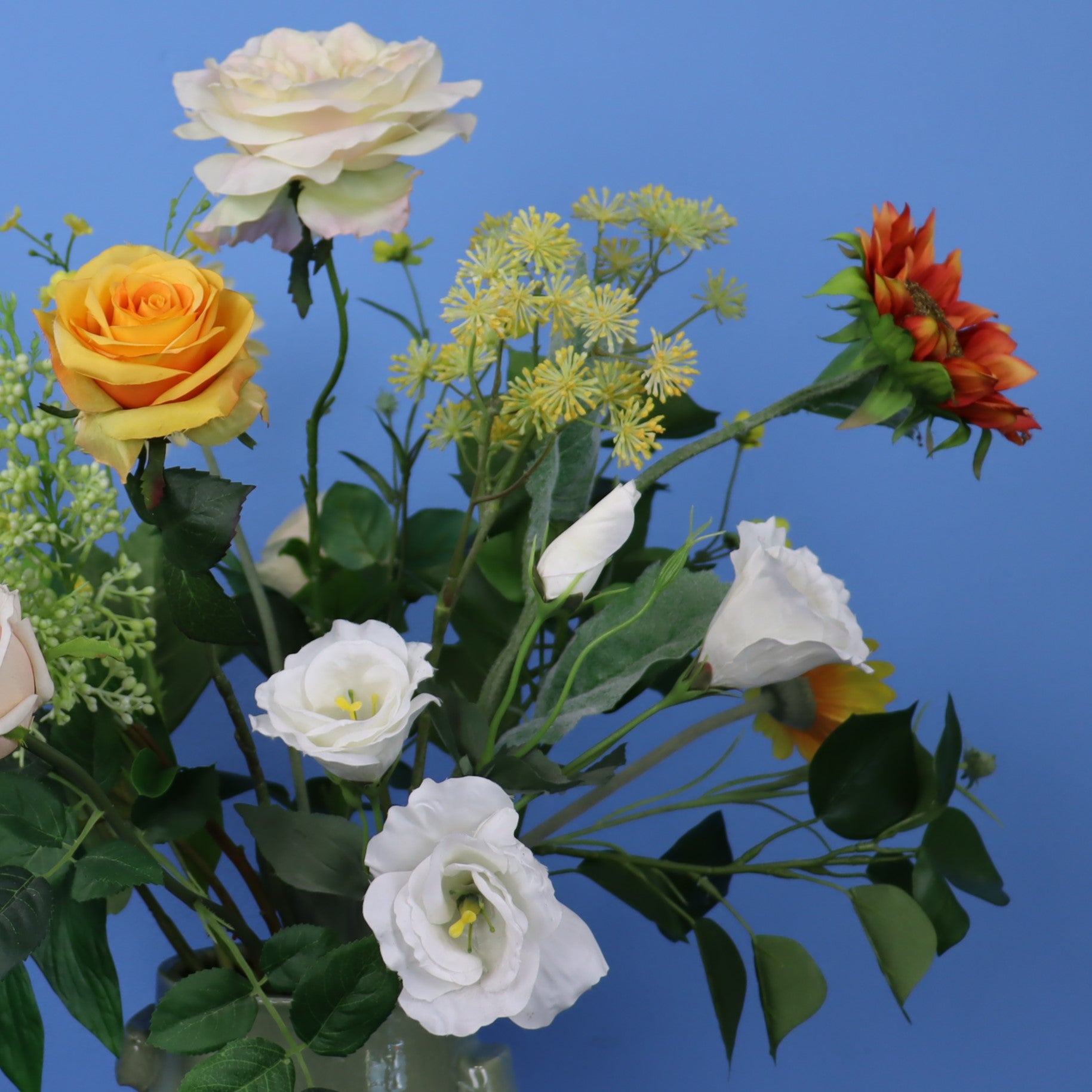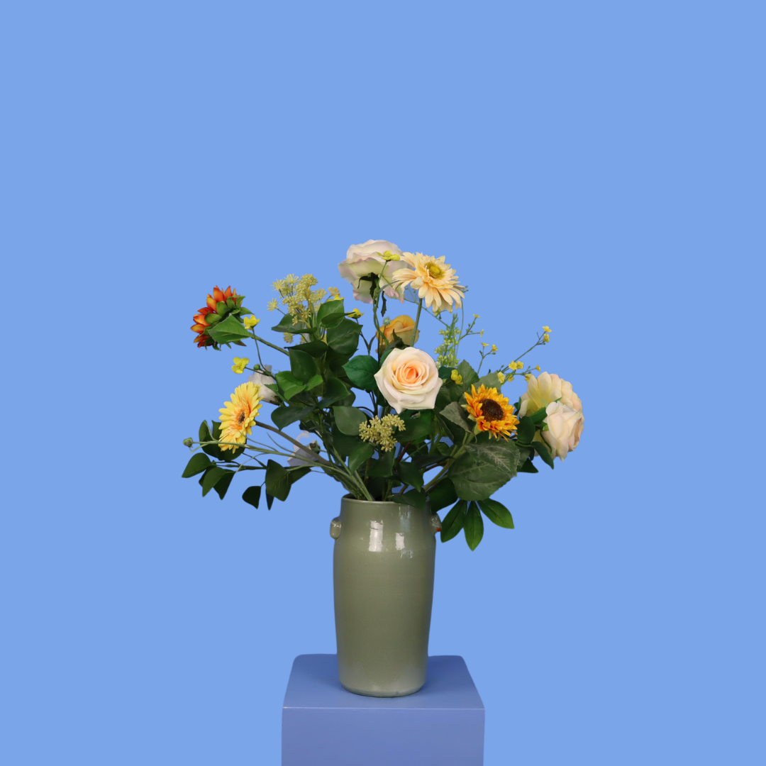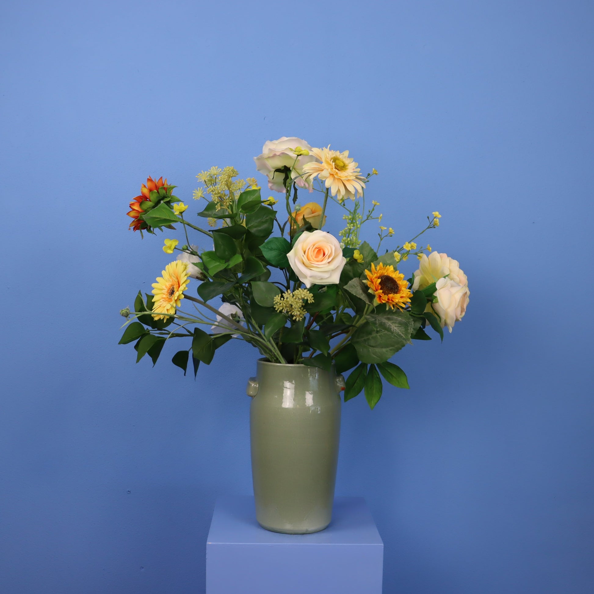 Prachtige designvaas van Serax met een wilde mix van zonnebloemen, rozen, gerbera's en dahlia's aangevuld met groenblad.