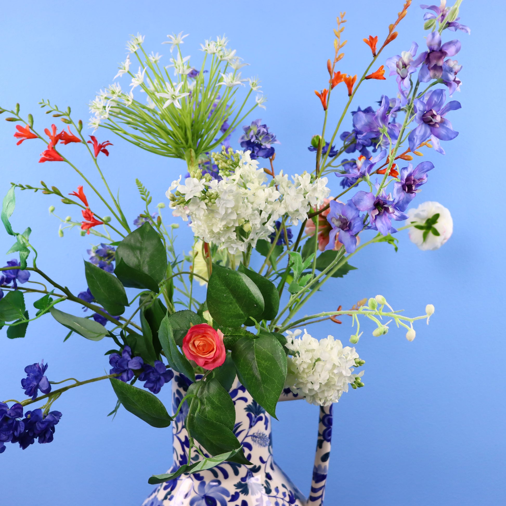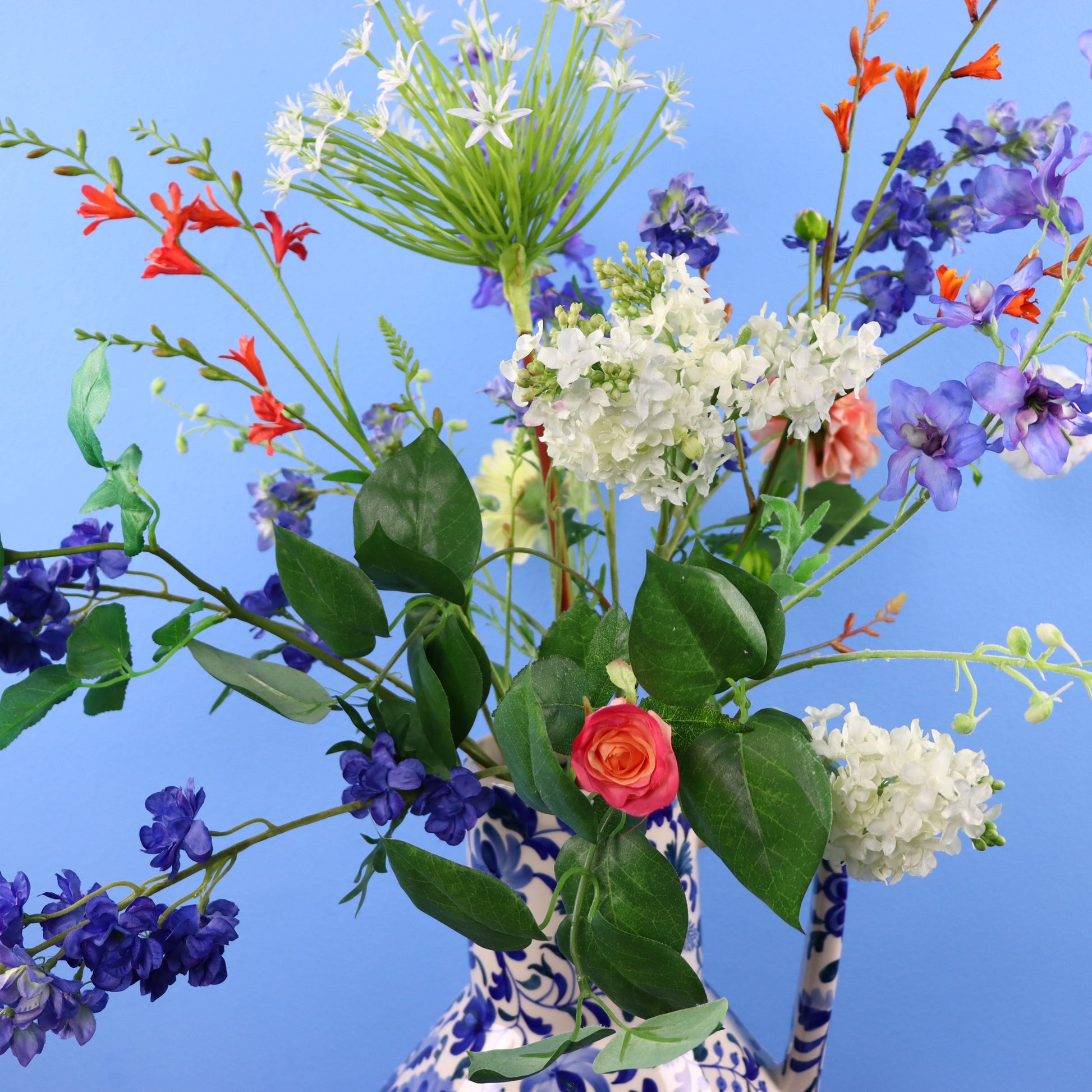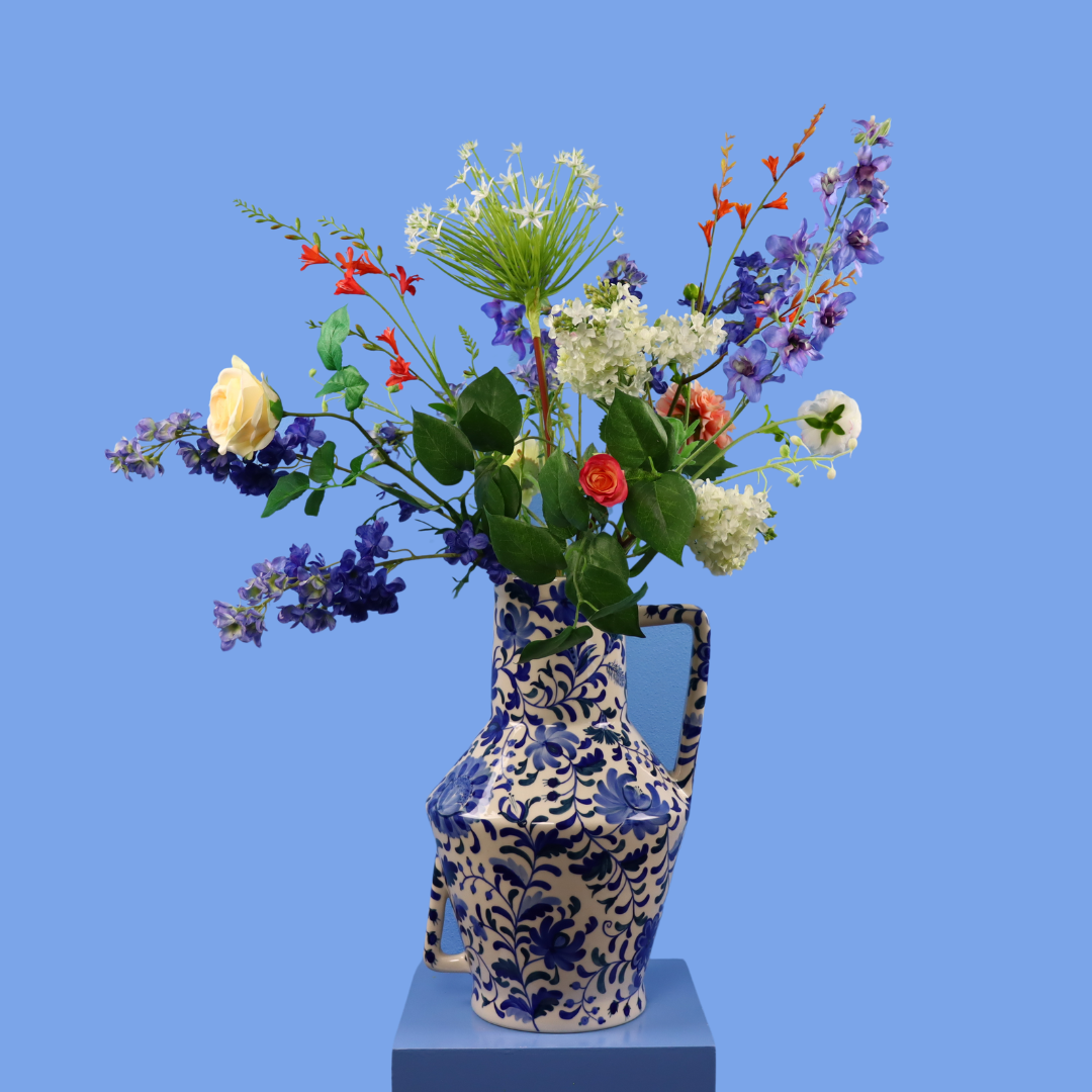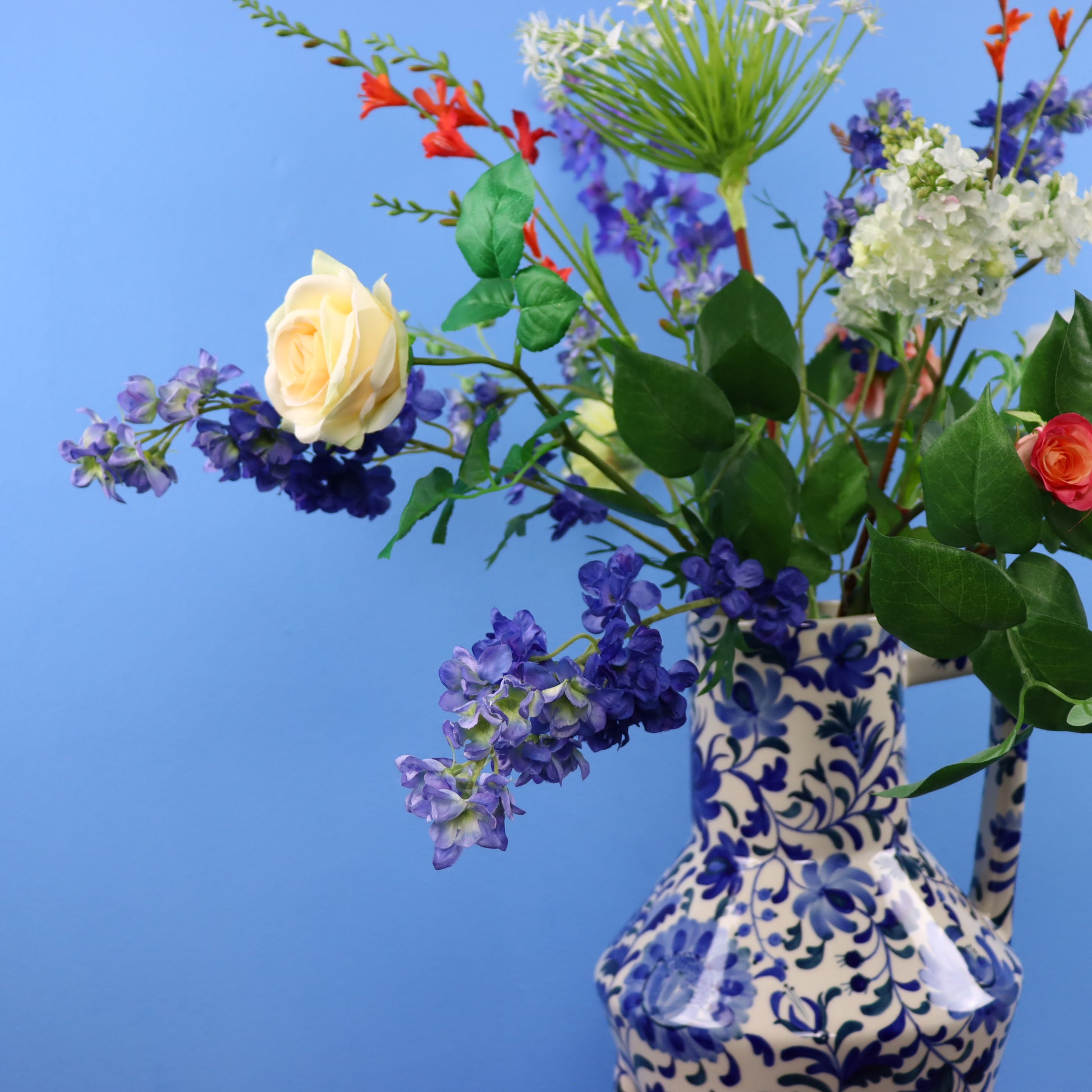 Handbeschilderde Return to Sender vaas in Delftsblauwe stijl, gevuld met een vrolijk gemengd boeket.