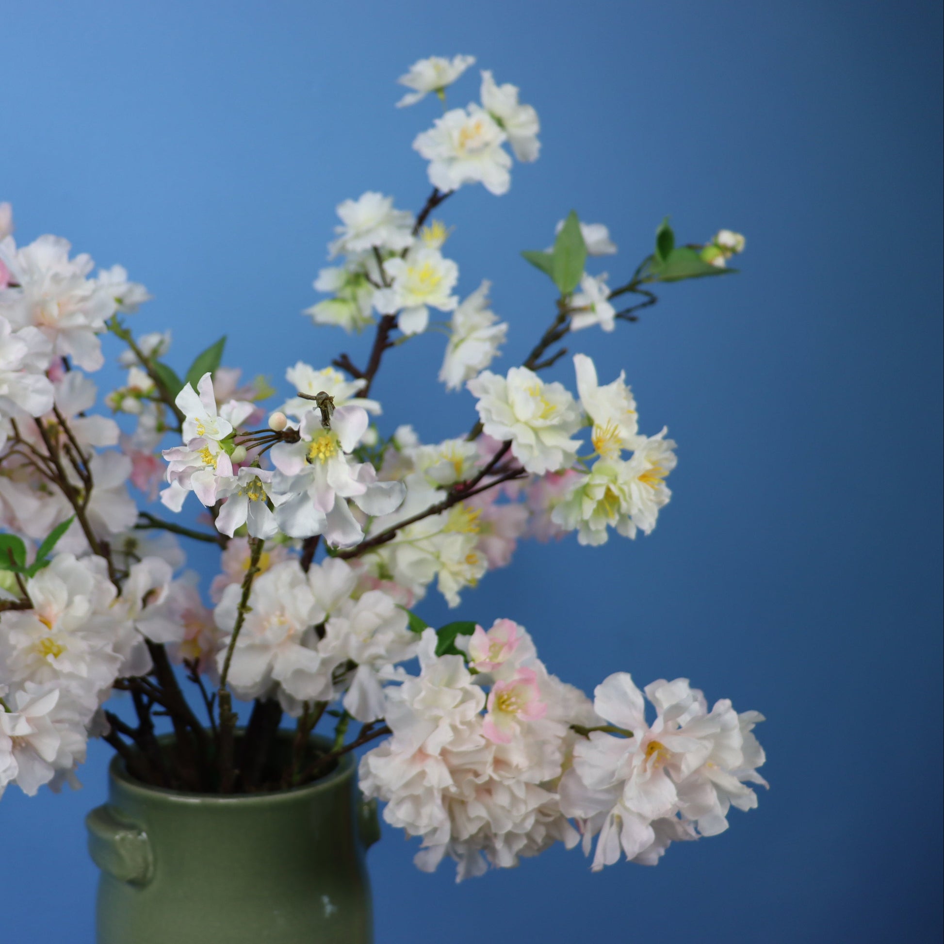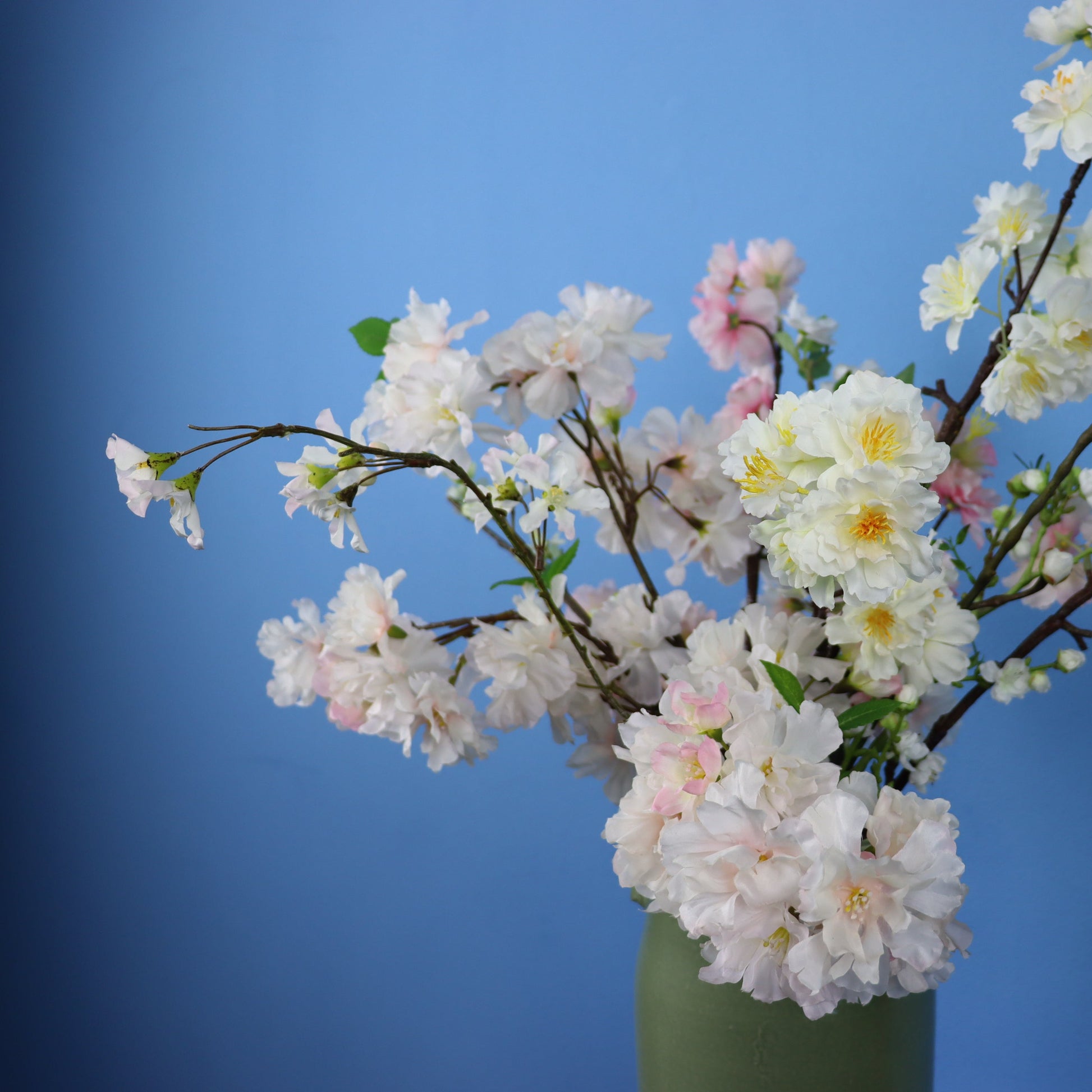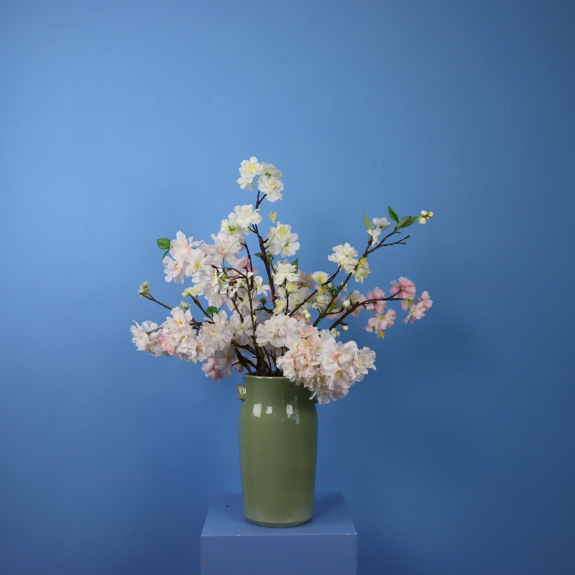 Deze groene design vaas van Serax is gevuld met blijvende bloesem.