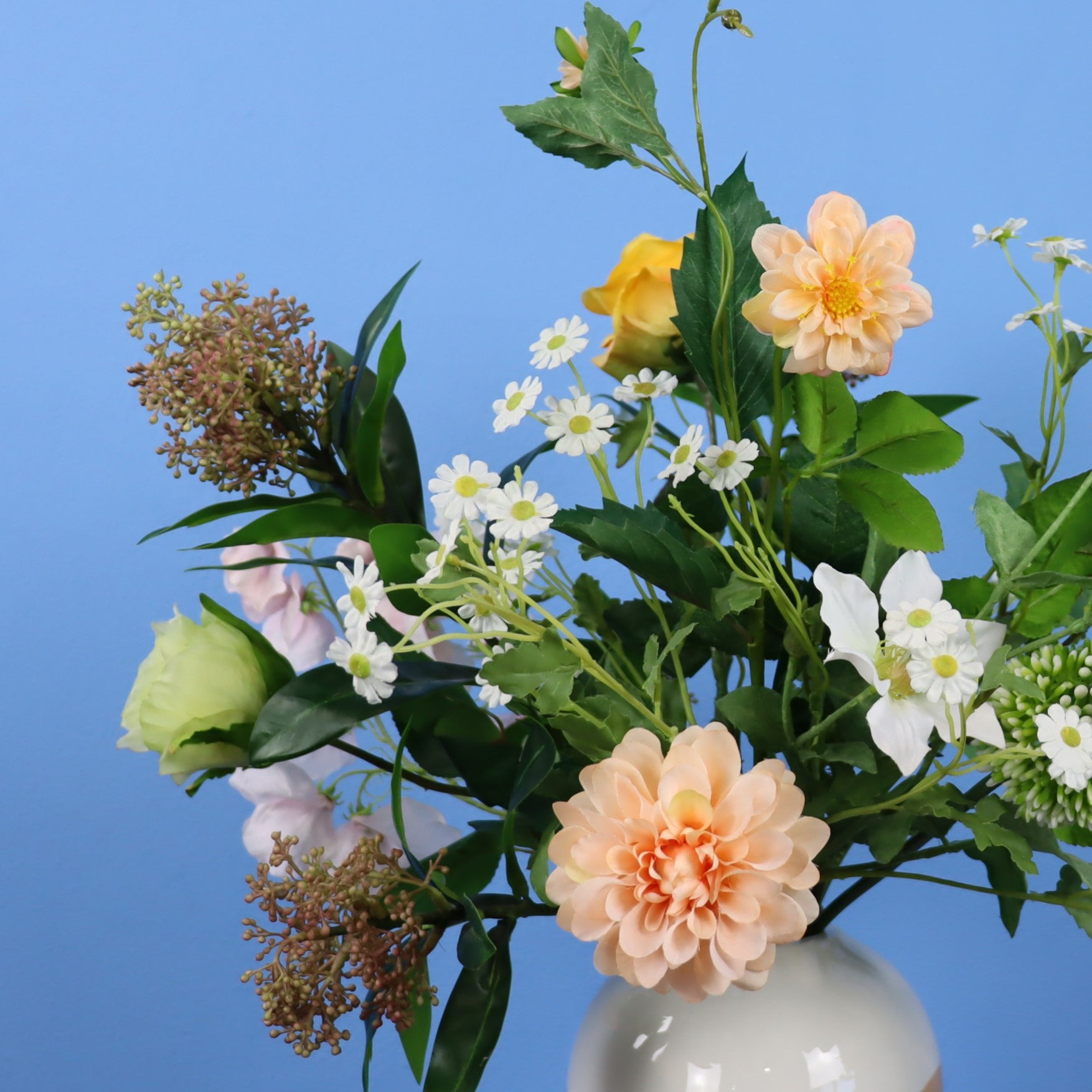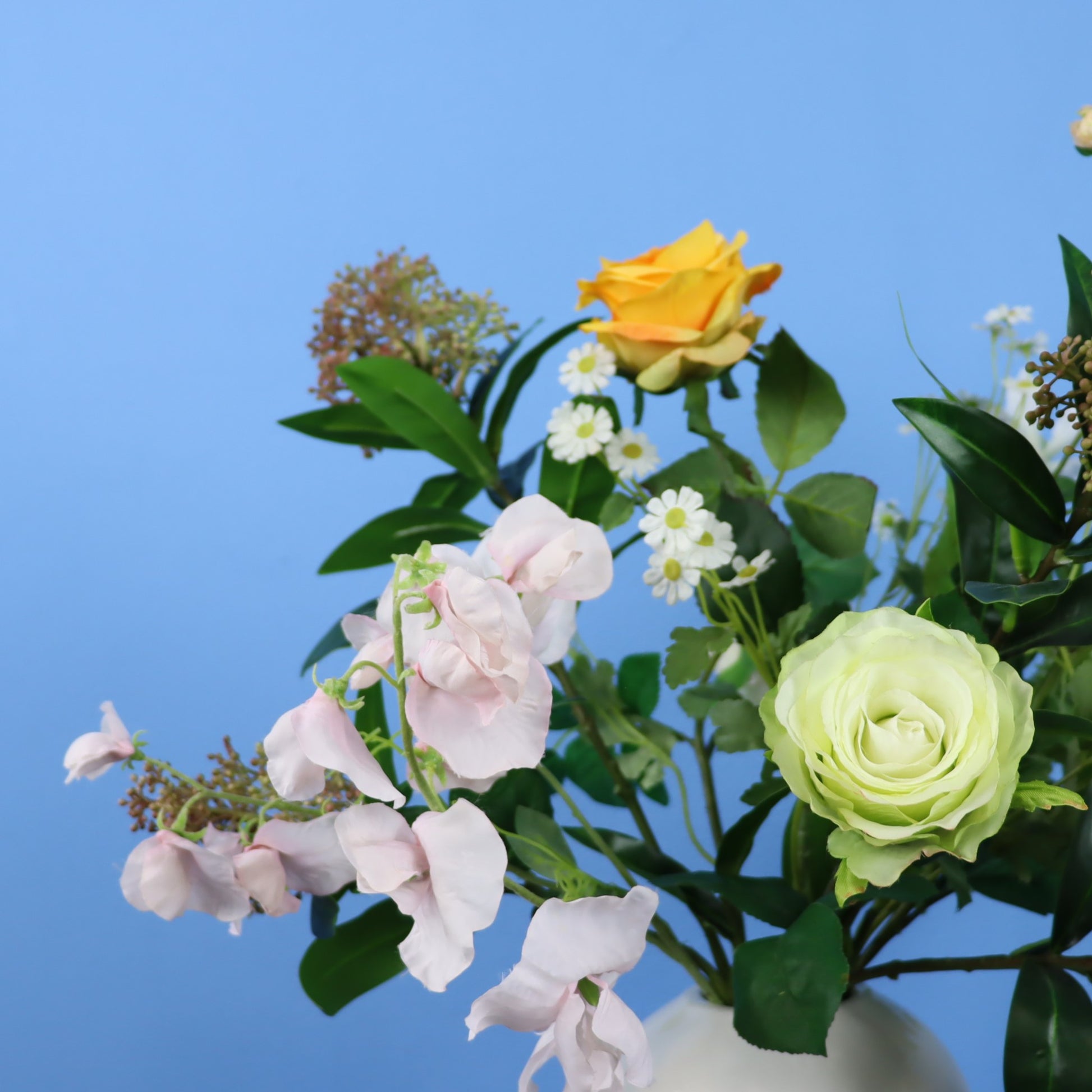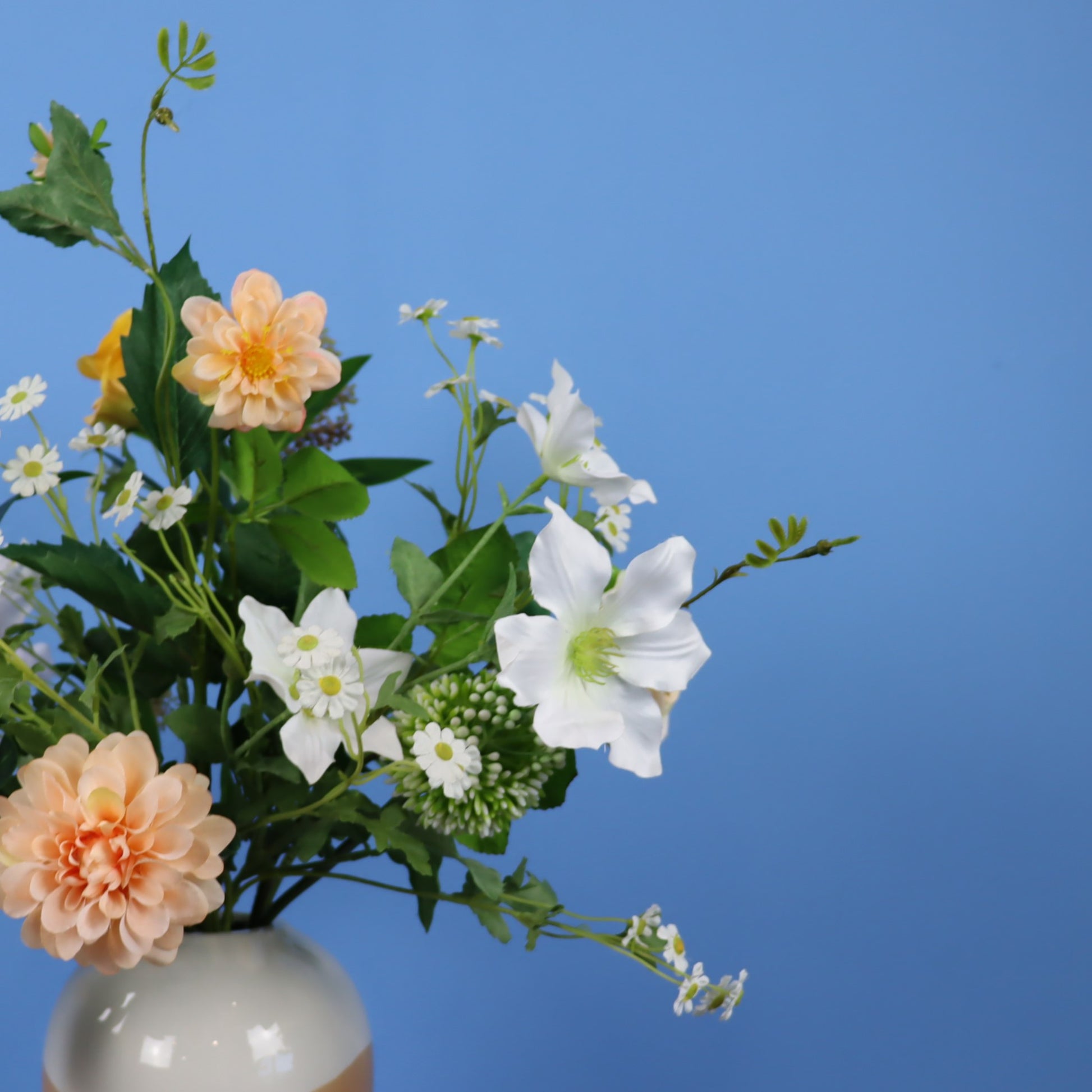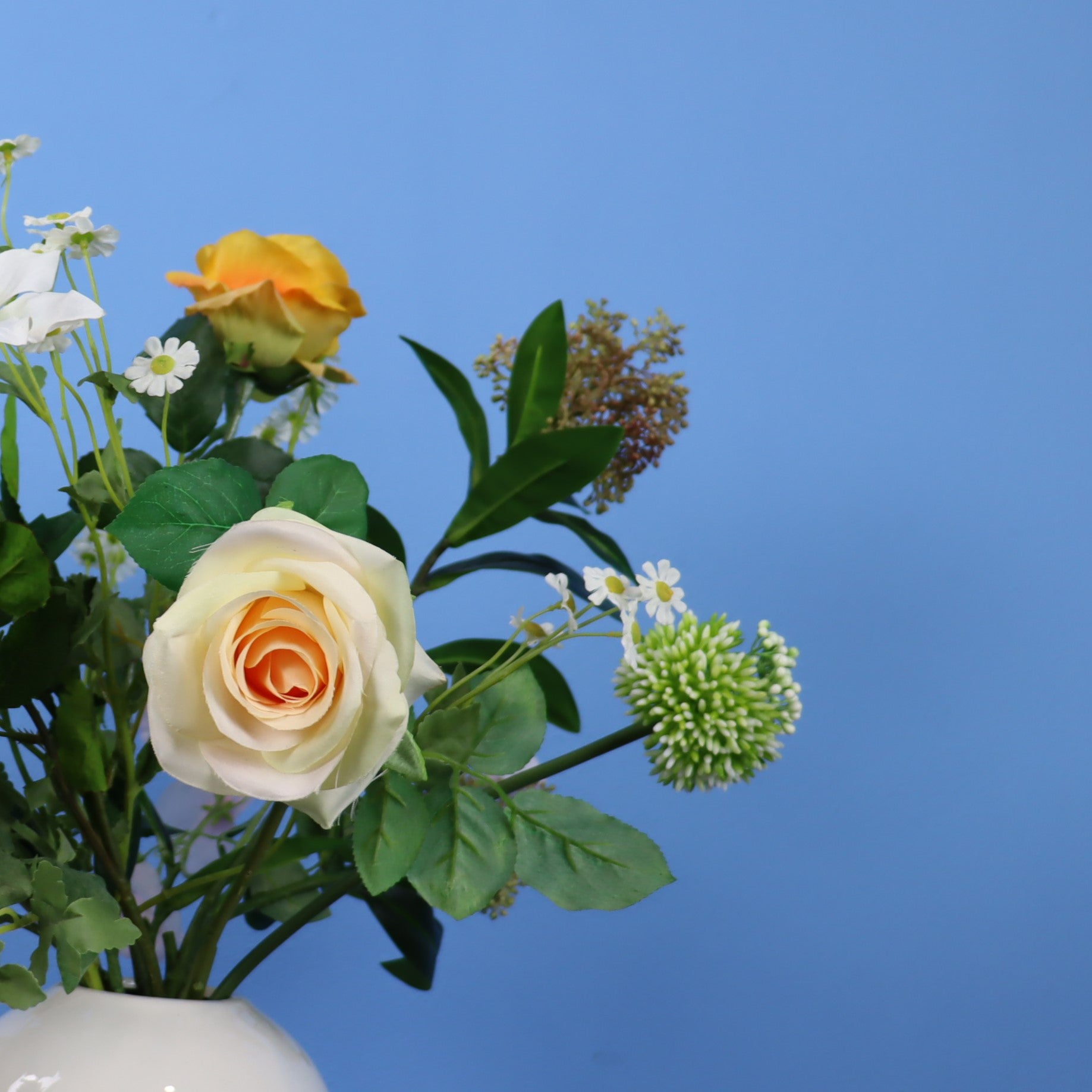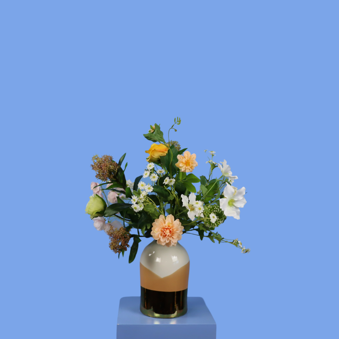 Een wit met oranje vaas met gouden onderrand, gevuld met wit en oranje boeket met blijvende bloemen.
