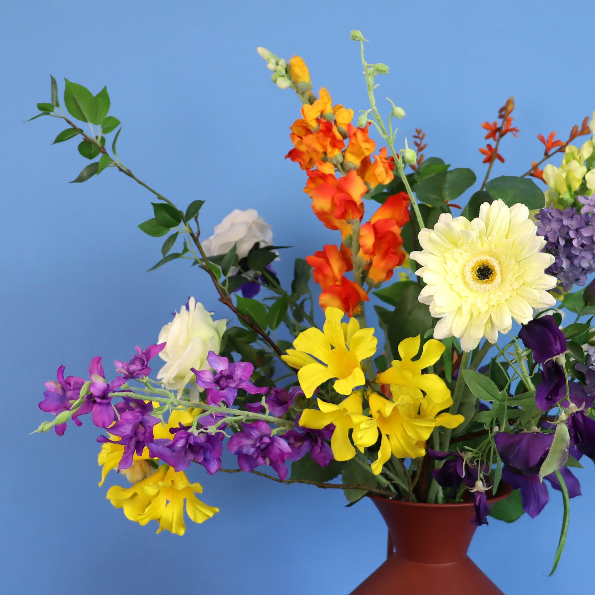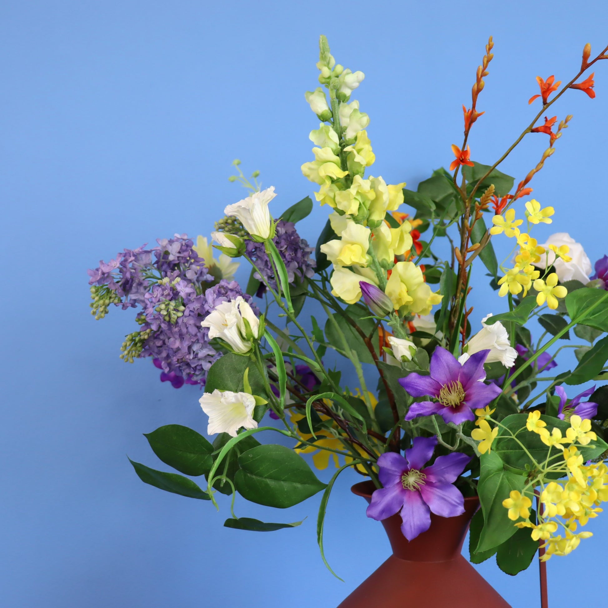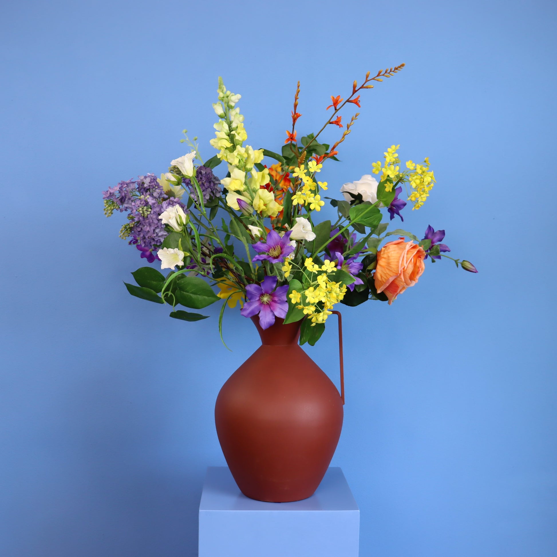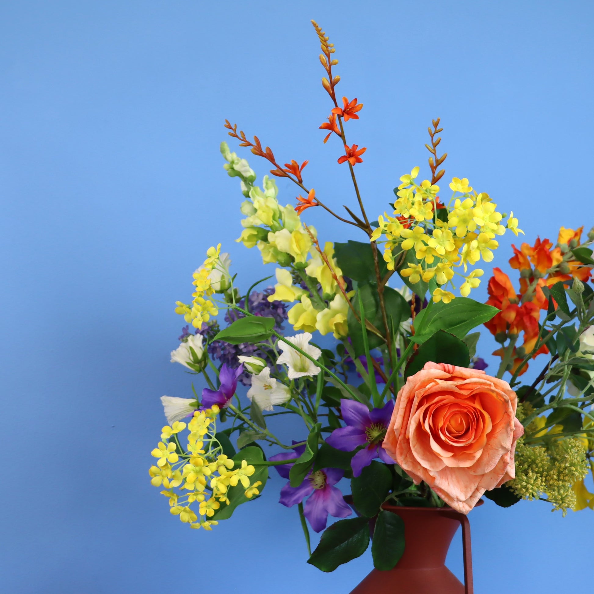 Deze prachtige polspotten vaas in bruinrood is gevuld met een kleurrijke en levendige mix van oranje roos, en gele Chinese klokjes, samen met paarse bloemen.