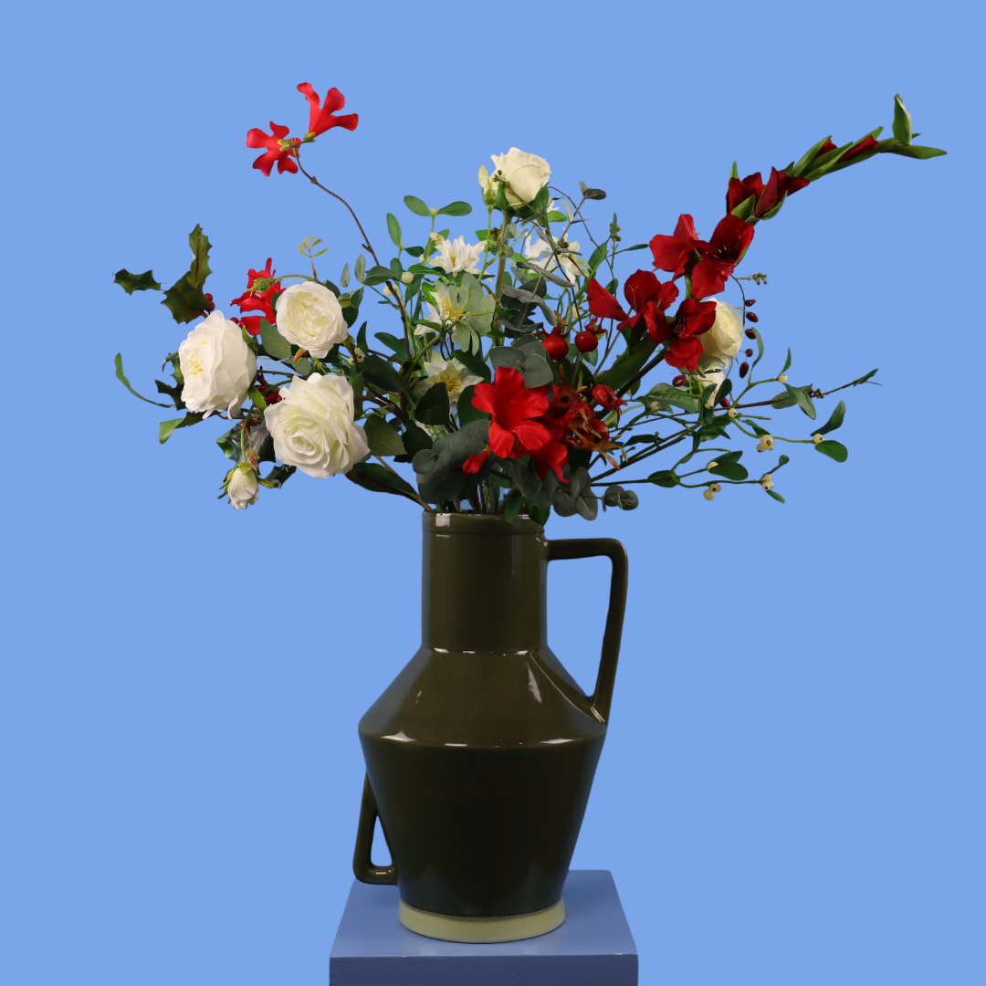 Prachtige donker groene Return to Sender vaas met blijvende bloemen.
