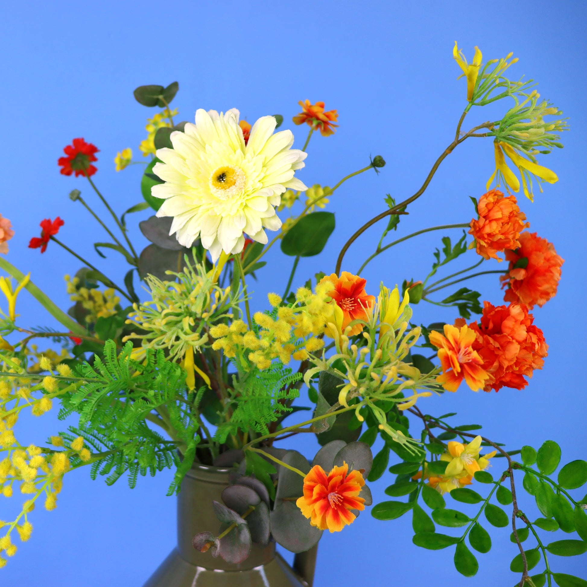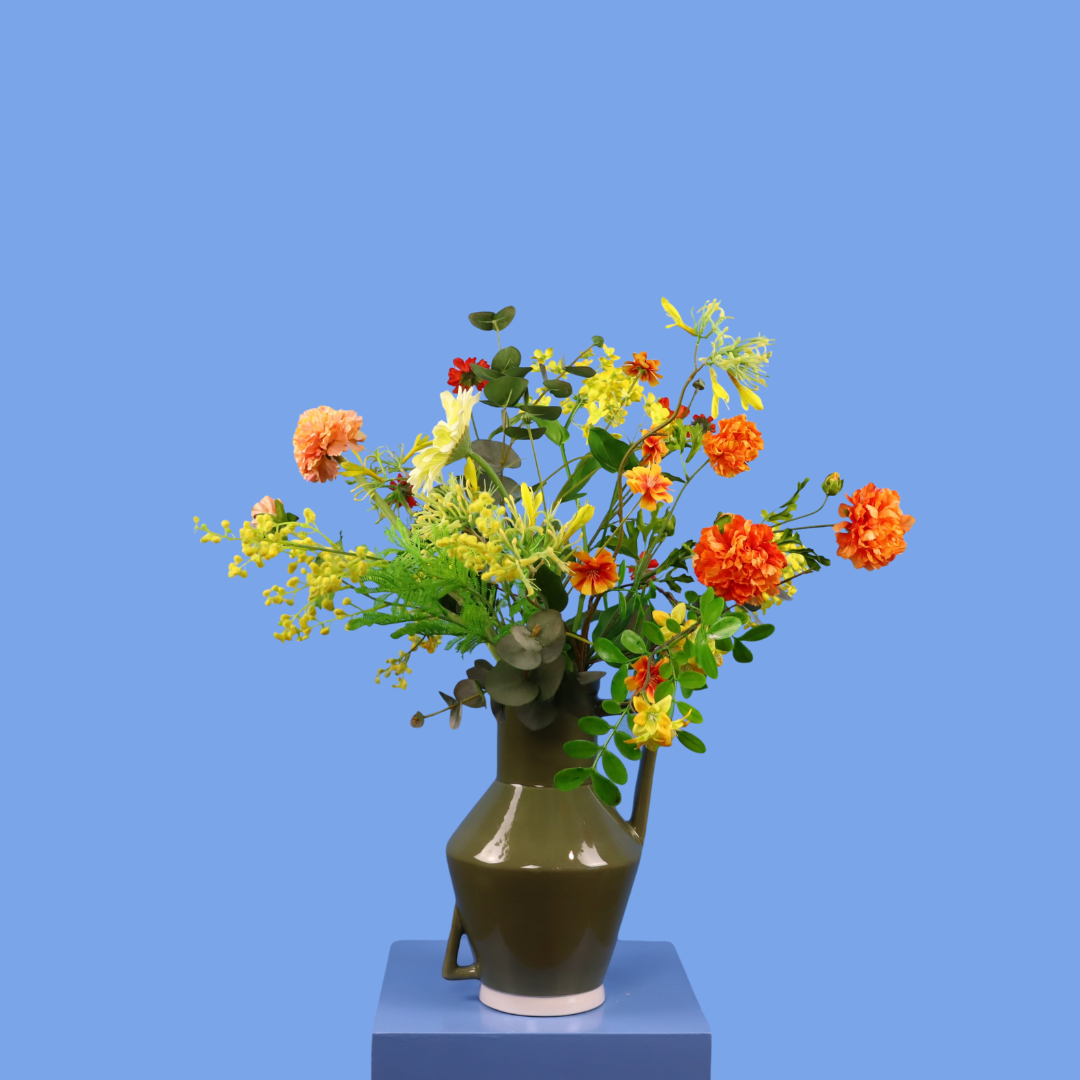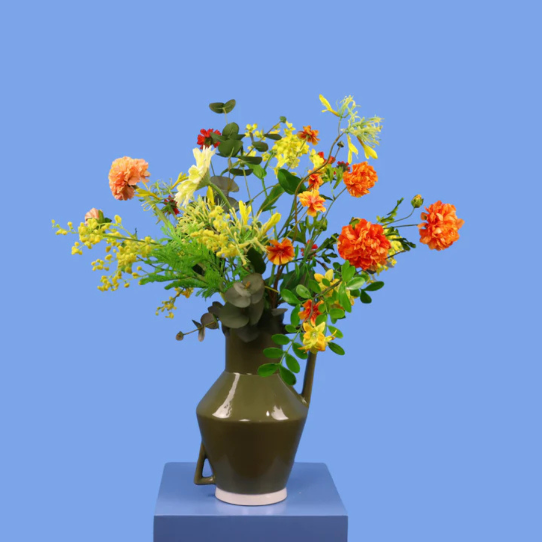 Gezellige groene Return to Sender vaas met een geel en oranje boeket met blijvende bloemen.
