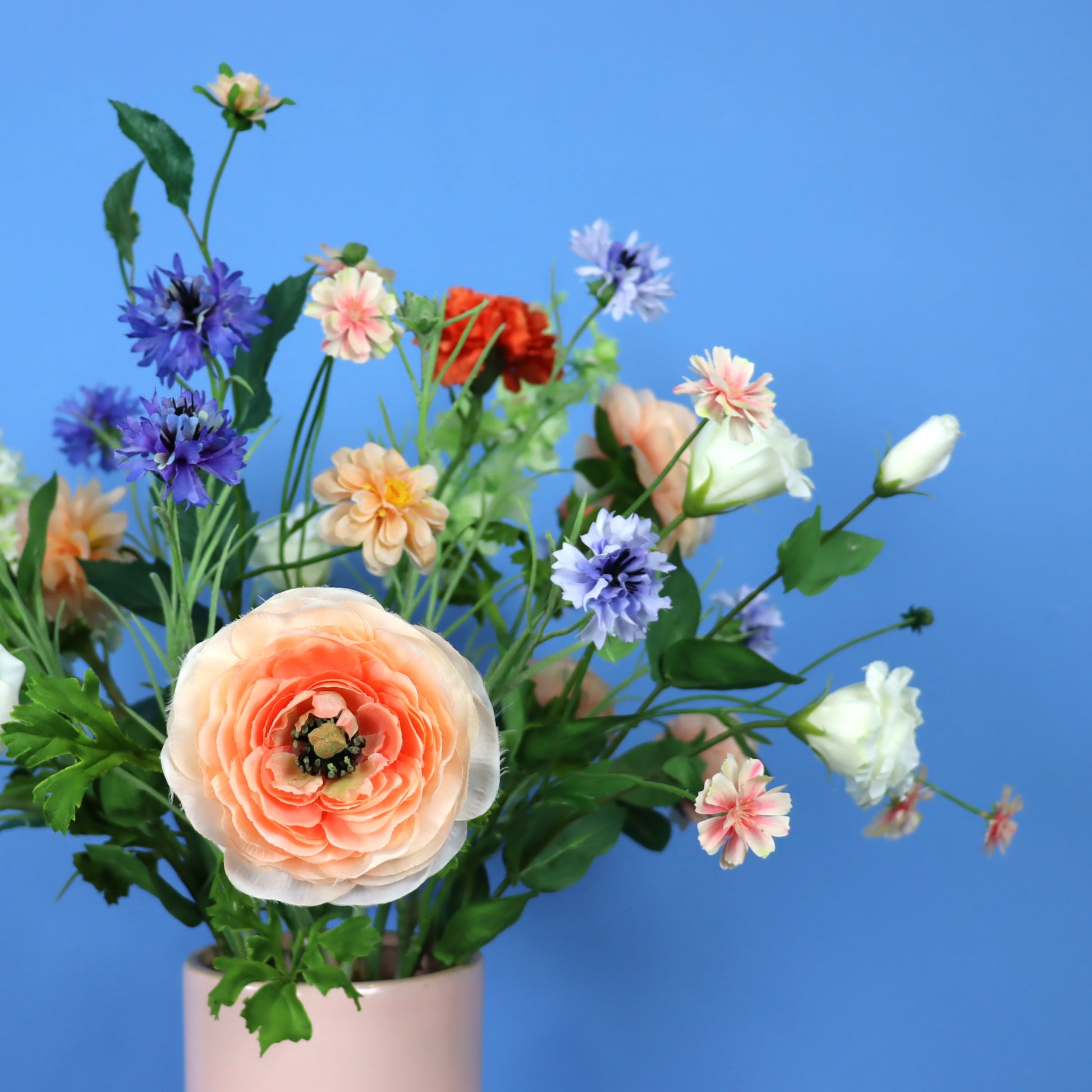 Hoge Pols Potten vaas in roze met bijkleurende blijvende bloemen.