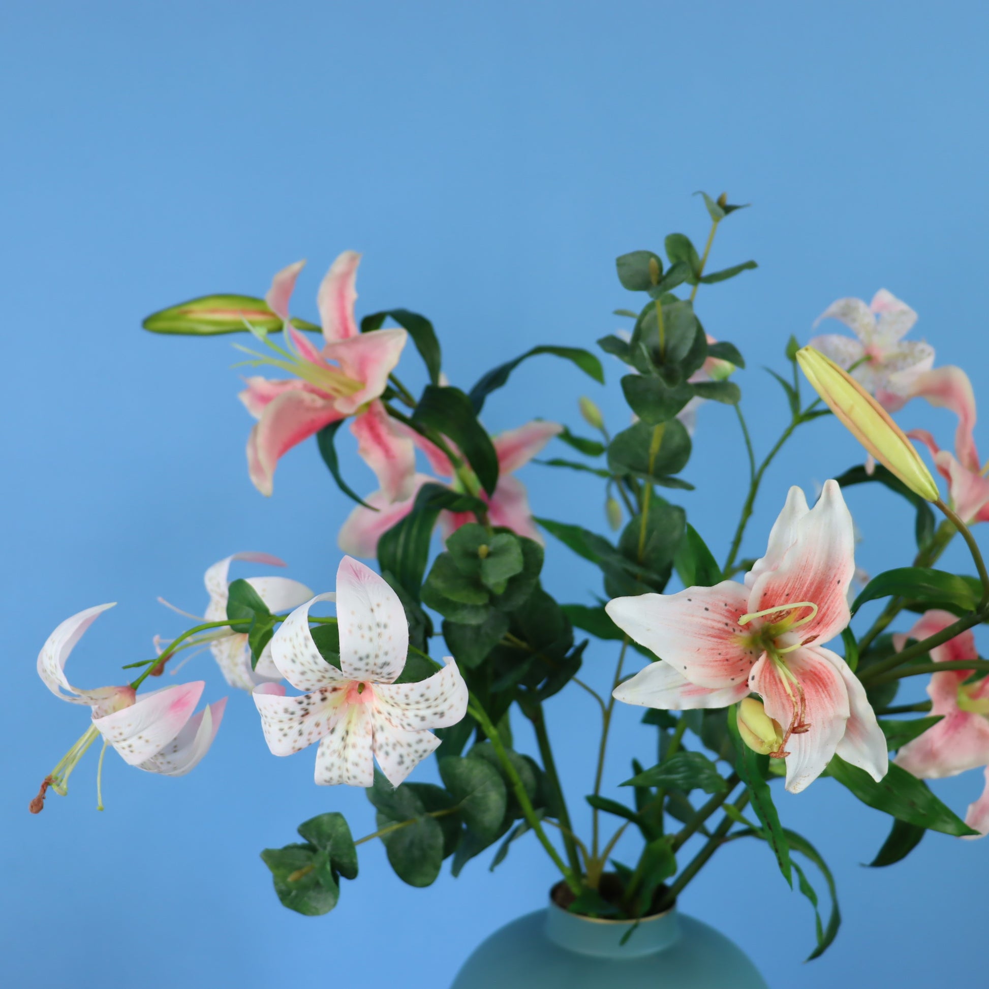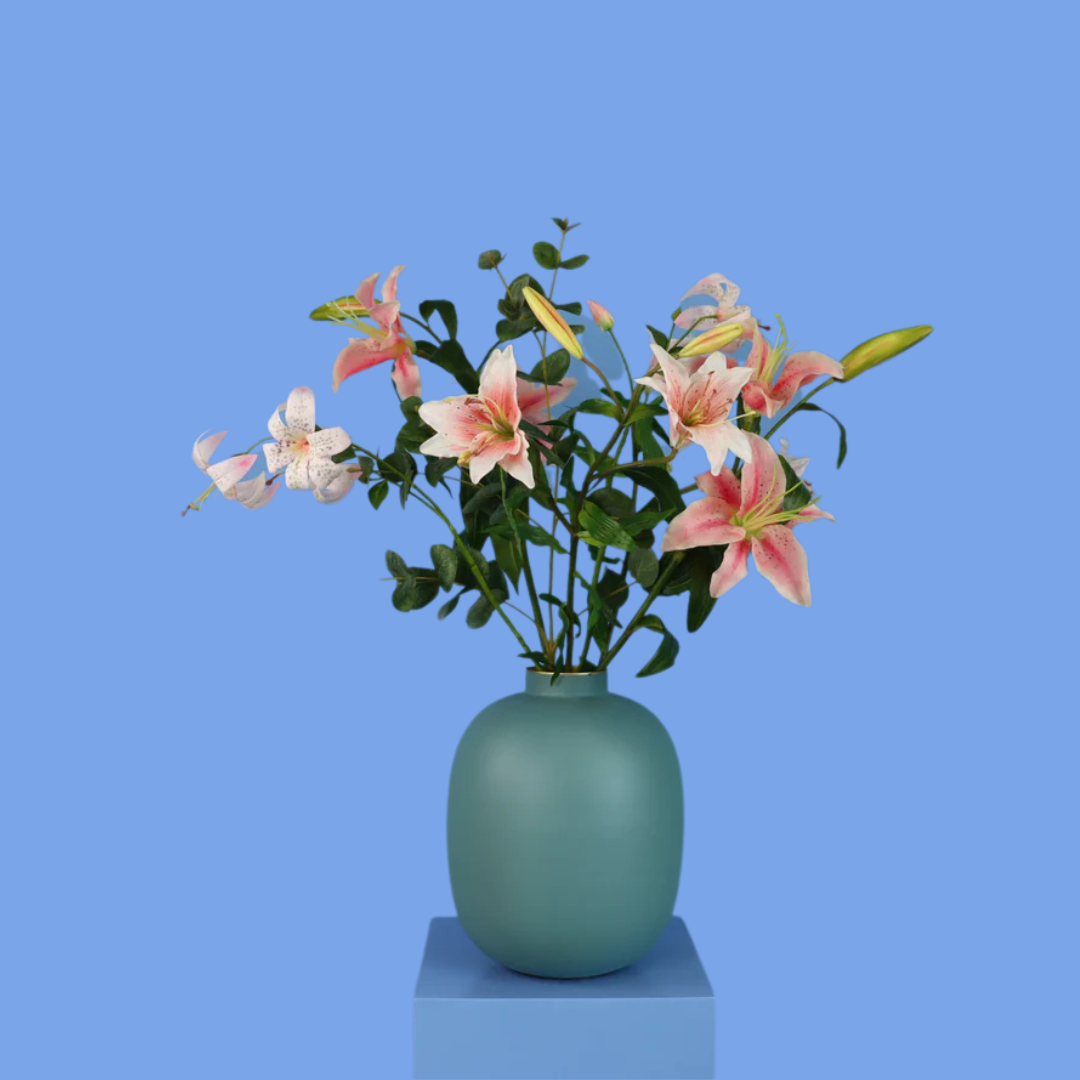 Pip Studio vaas met lelie's. Dit is een leuke kleuren combinatie, turquoise vaas met lichtroze bloemen.