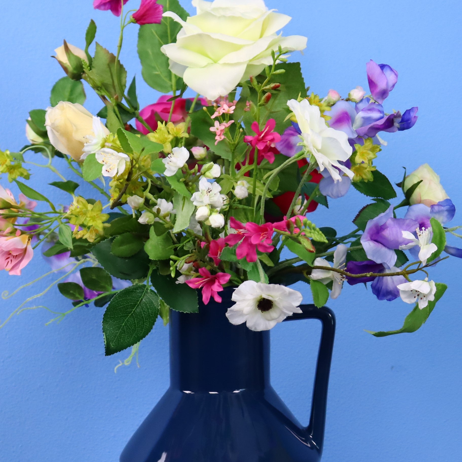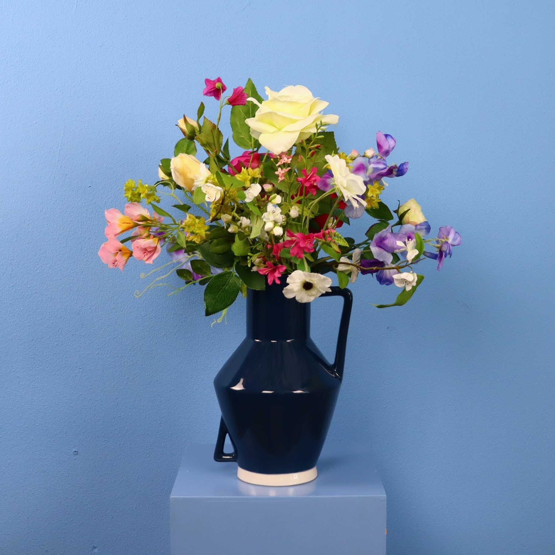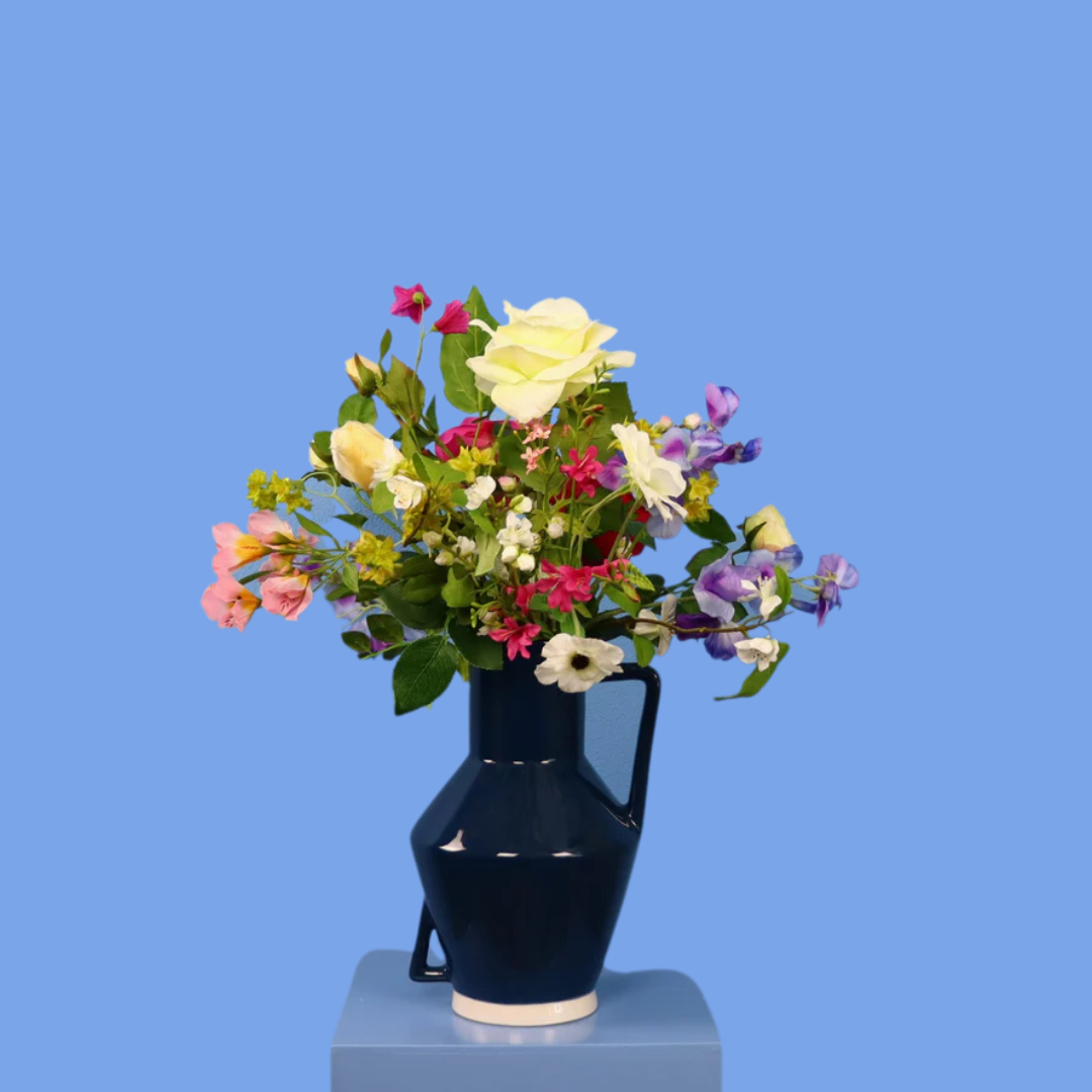 Donkerblauwe Return to Sender vaas met een vrolijk boeket.