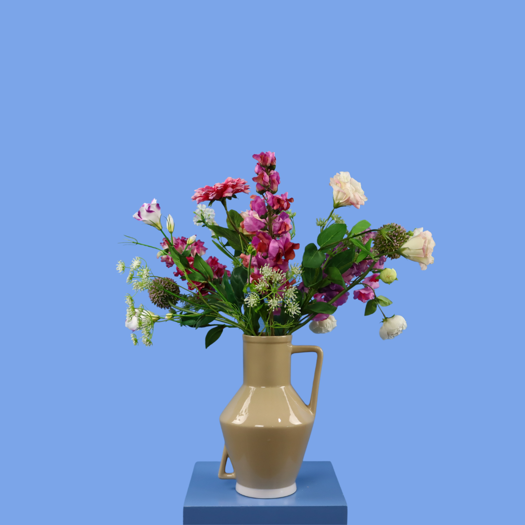 Onze lichte beige Return to Sender vaas met een roze en paars boeket met blijvende bloemen.
