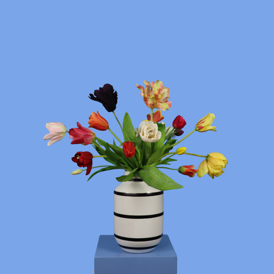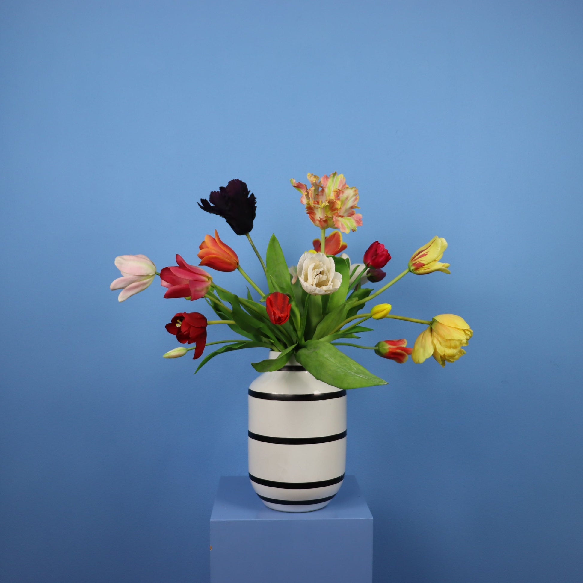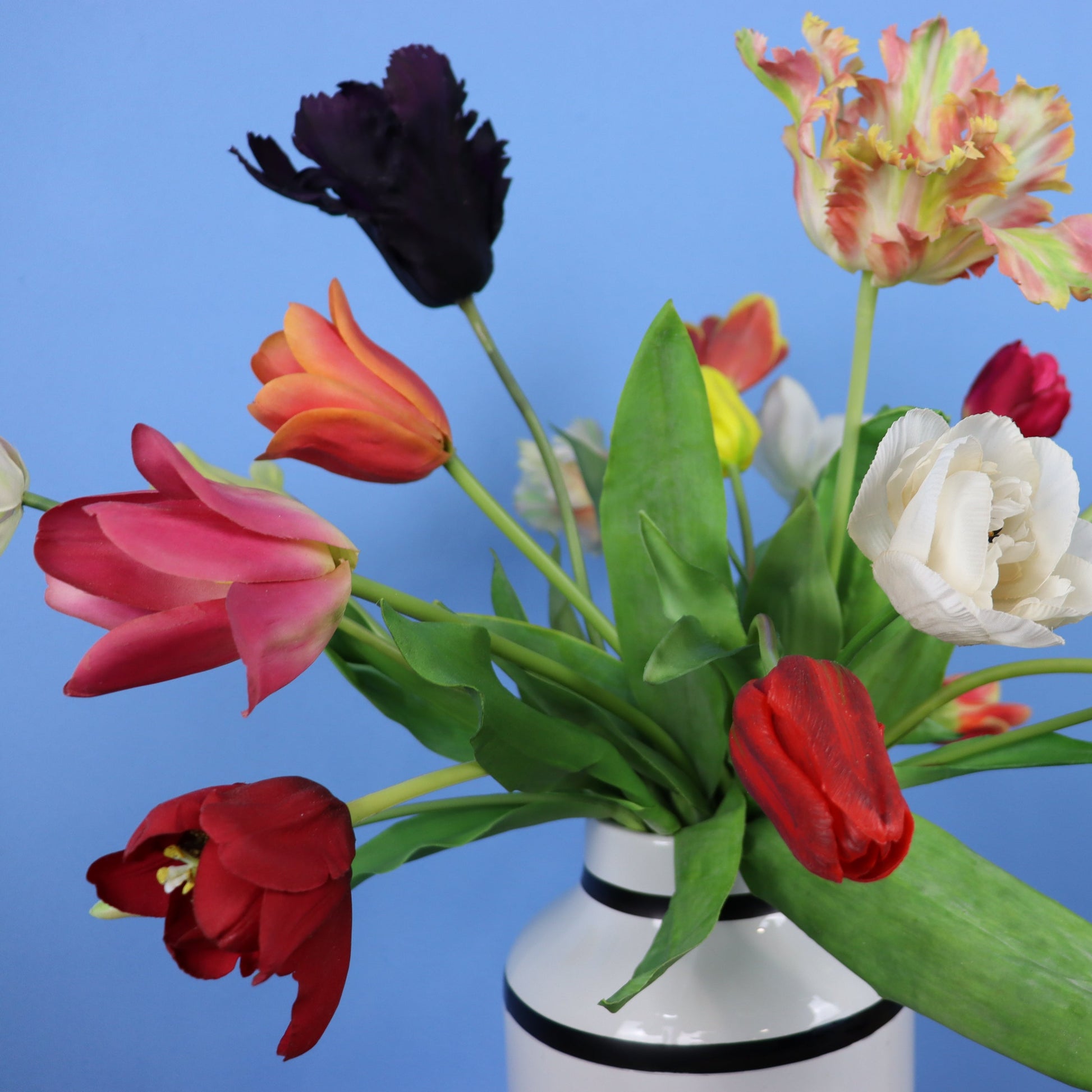 Zwart witte vaas met blijvende tulpen in de kleuren wit, geel, rood en oranje.
