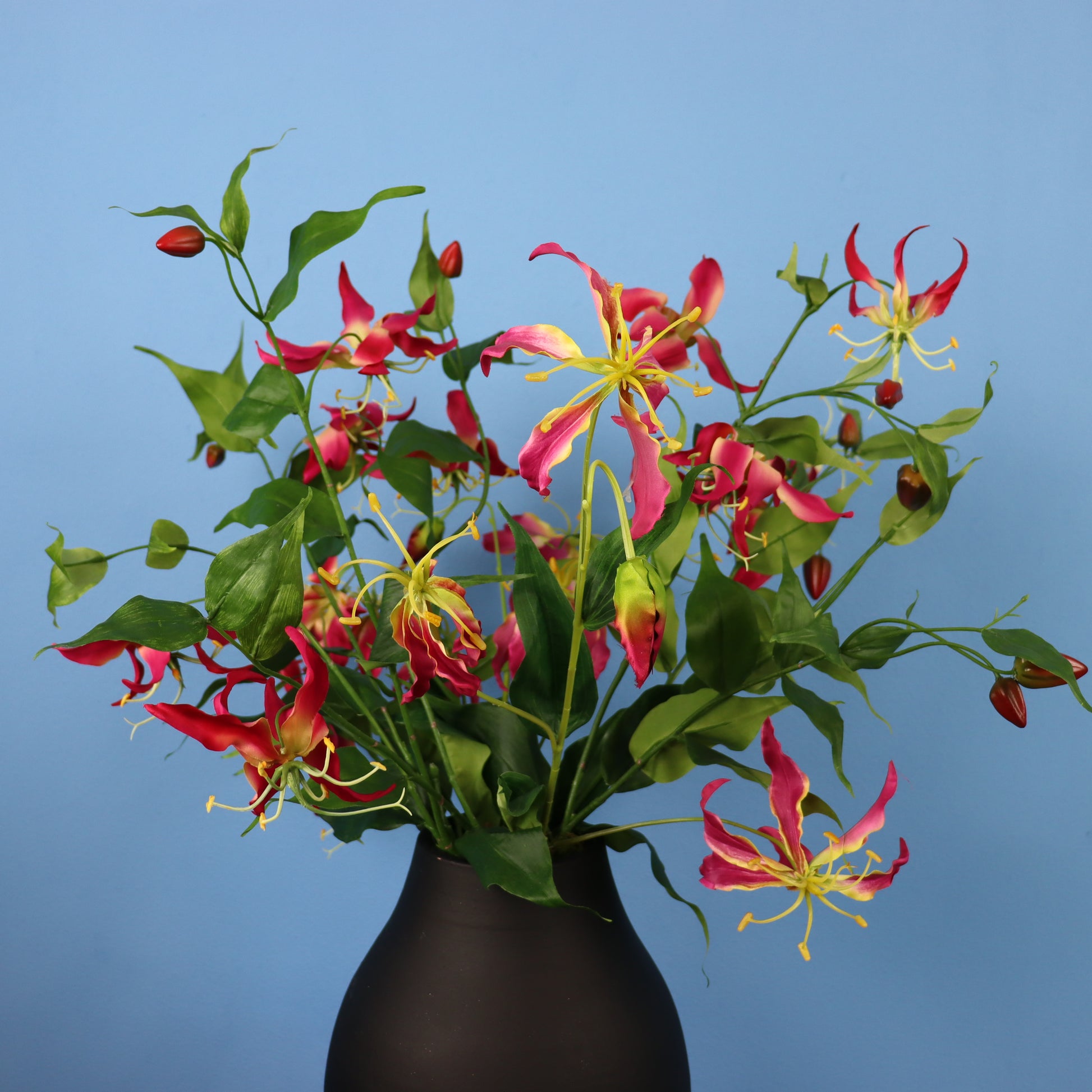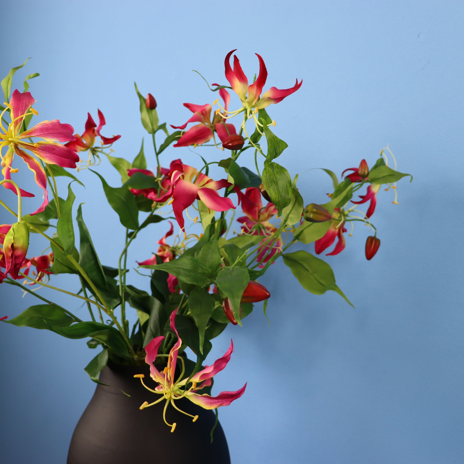 Deze leuke zwarte vaas is opgemaakt met een beeldige straelitzia.