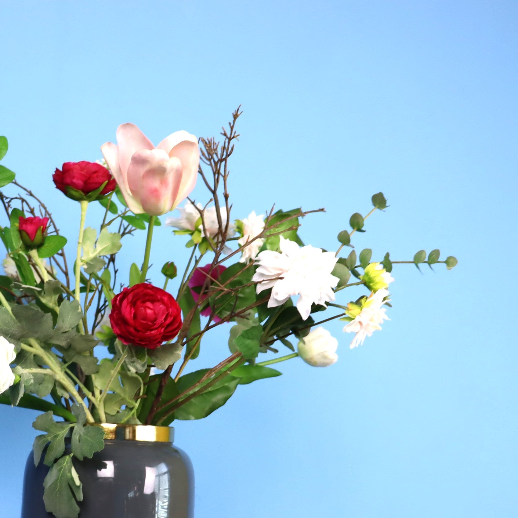 Leuke lichtgrijze Light & Living vaas met tulpen en vrolijke bloemen.