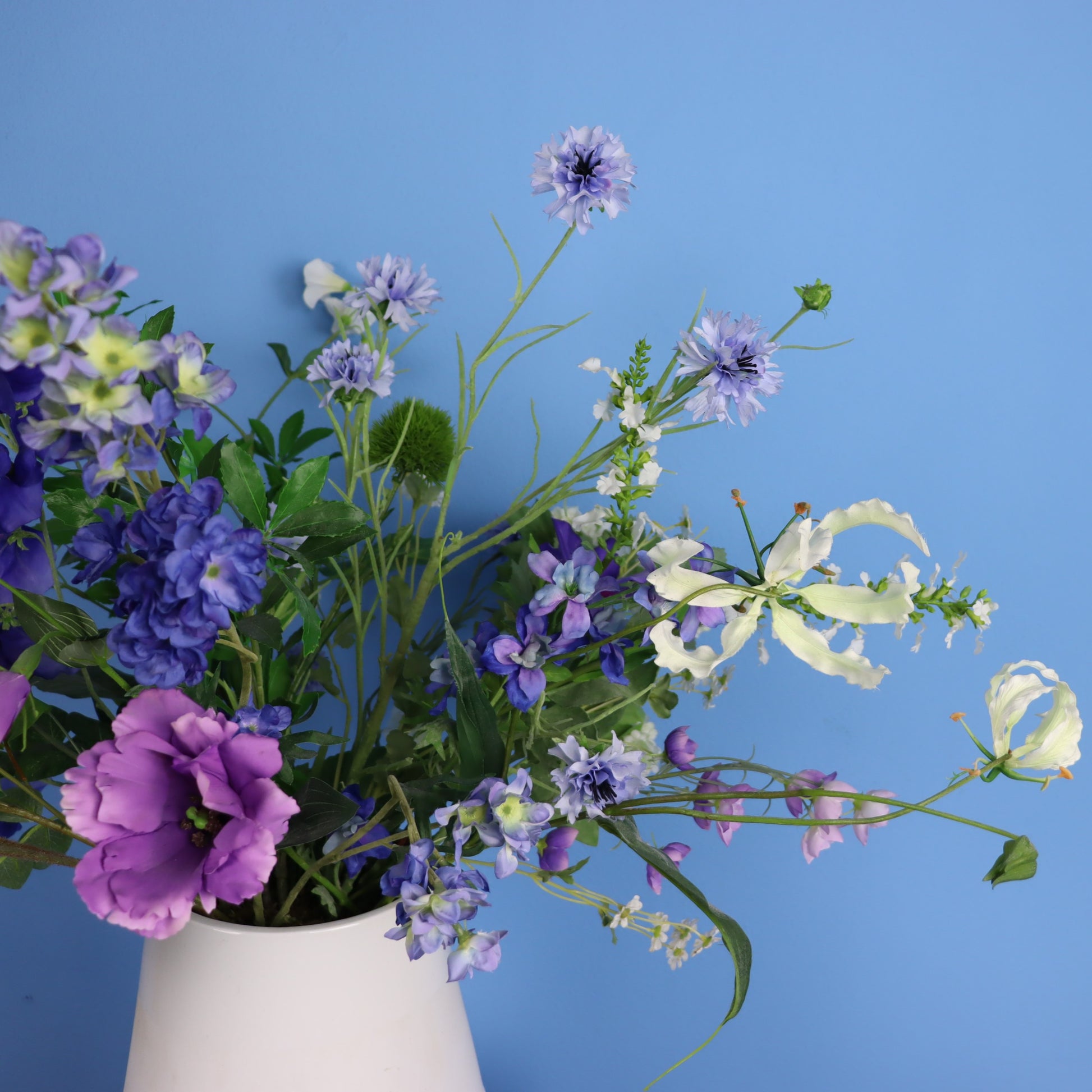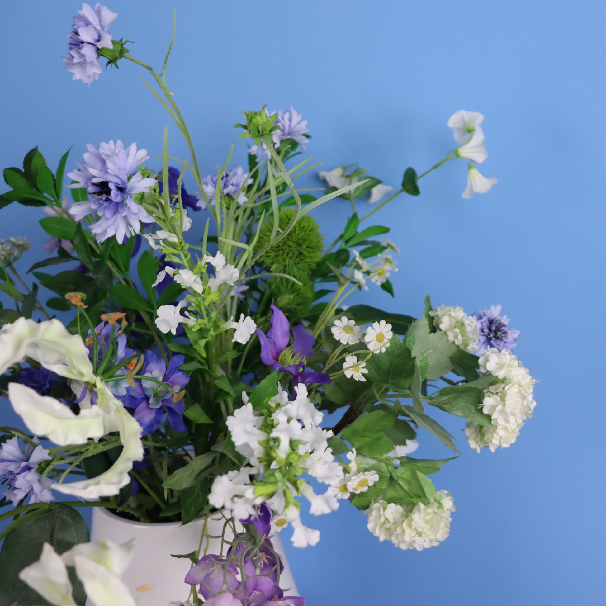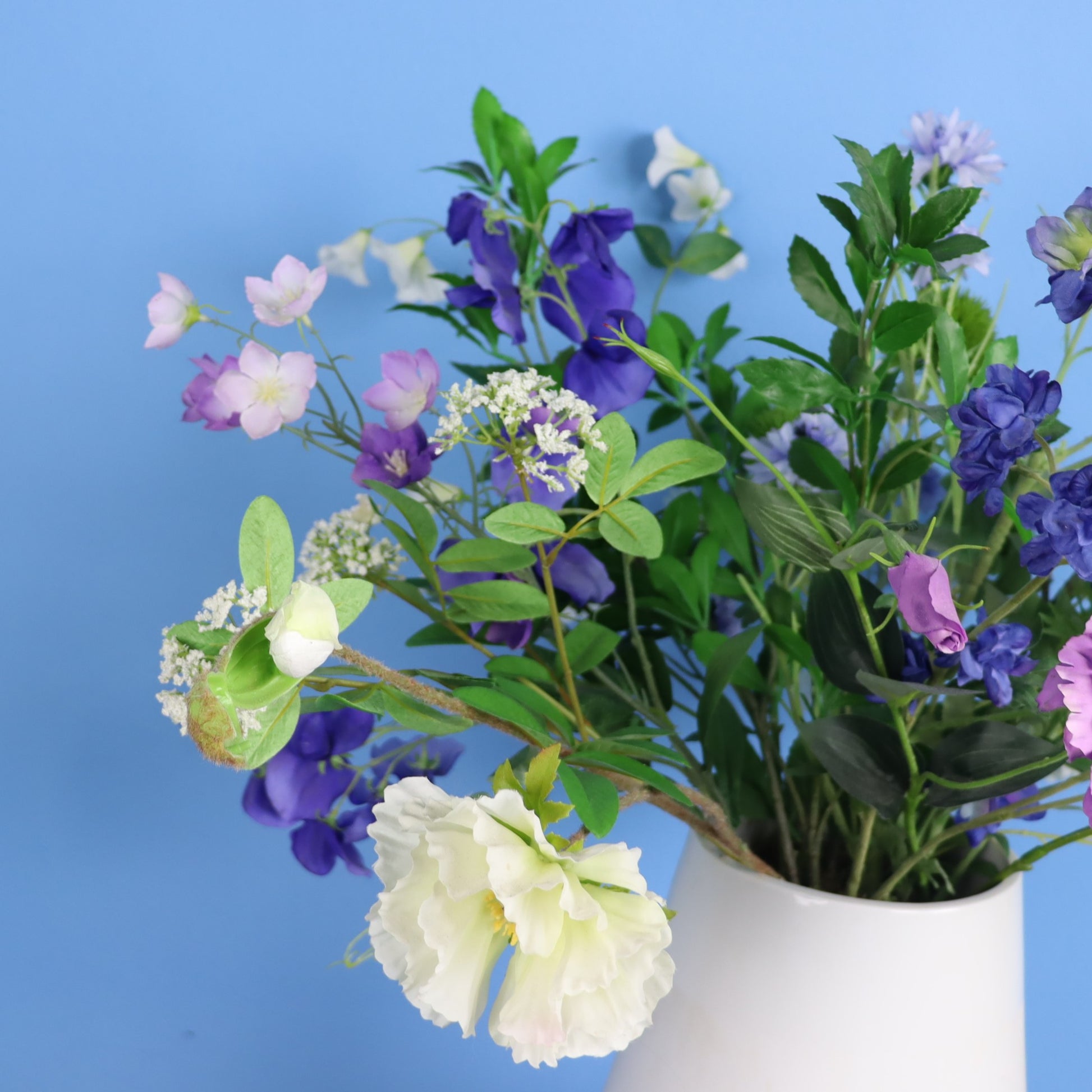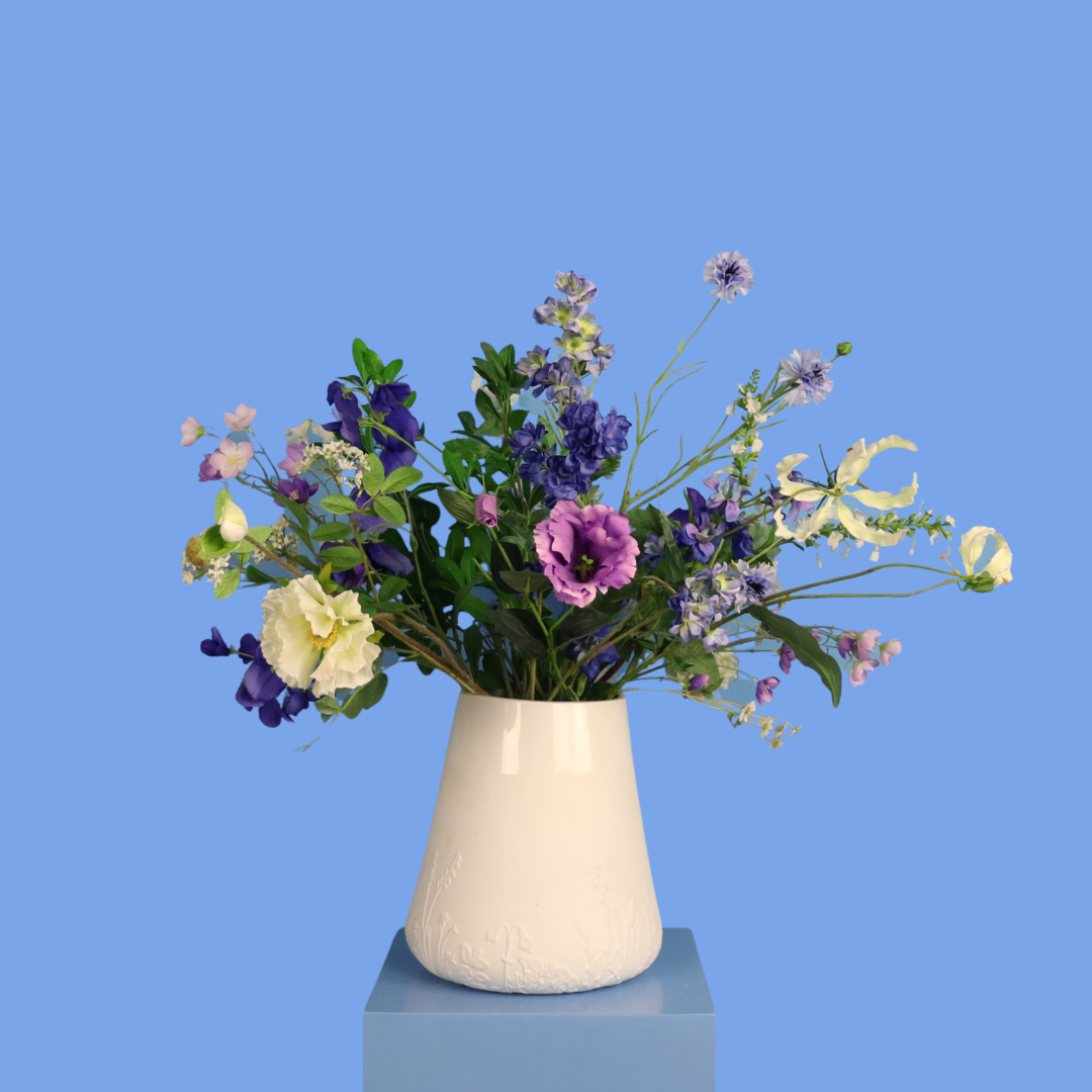 Deze prachtige witte vaas met bloem reliëf komt met een wit paars boeket.