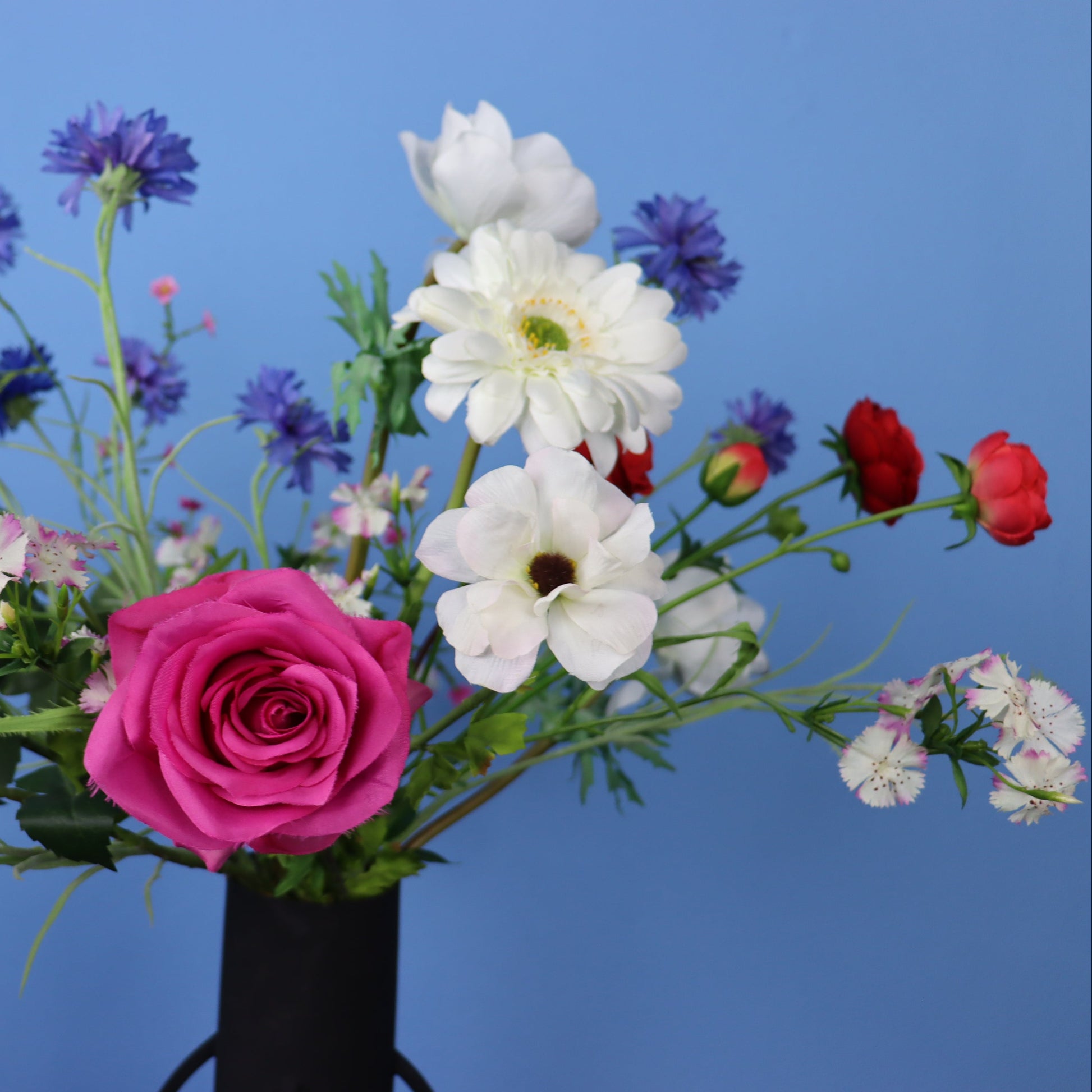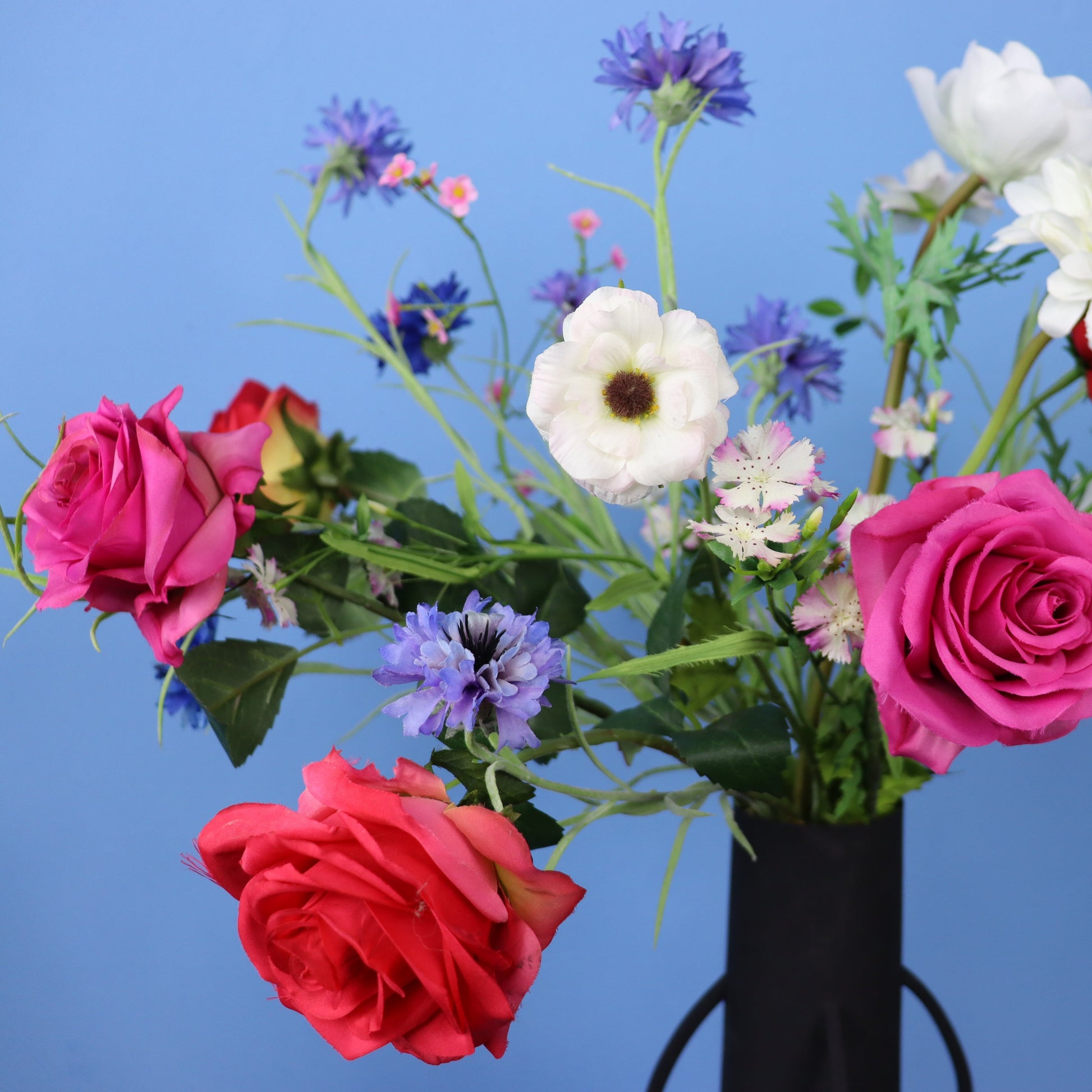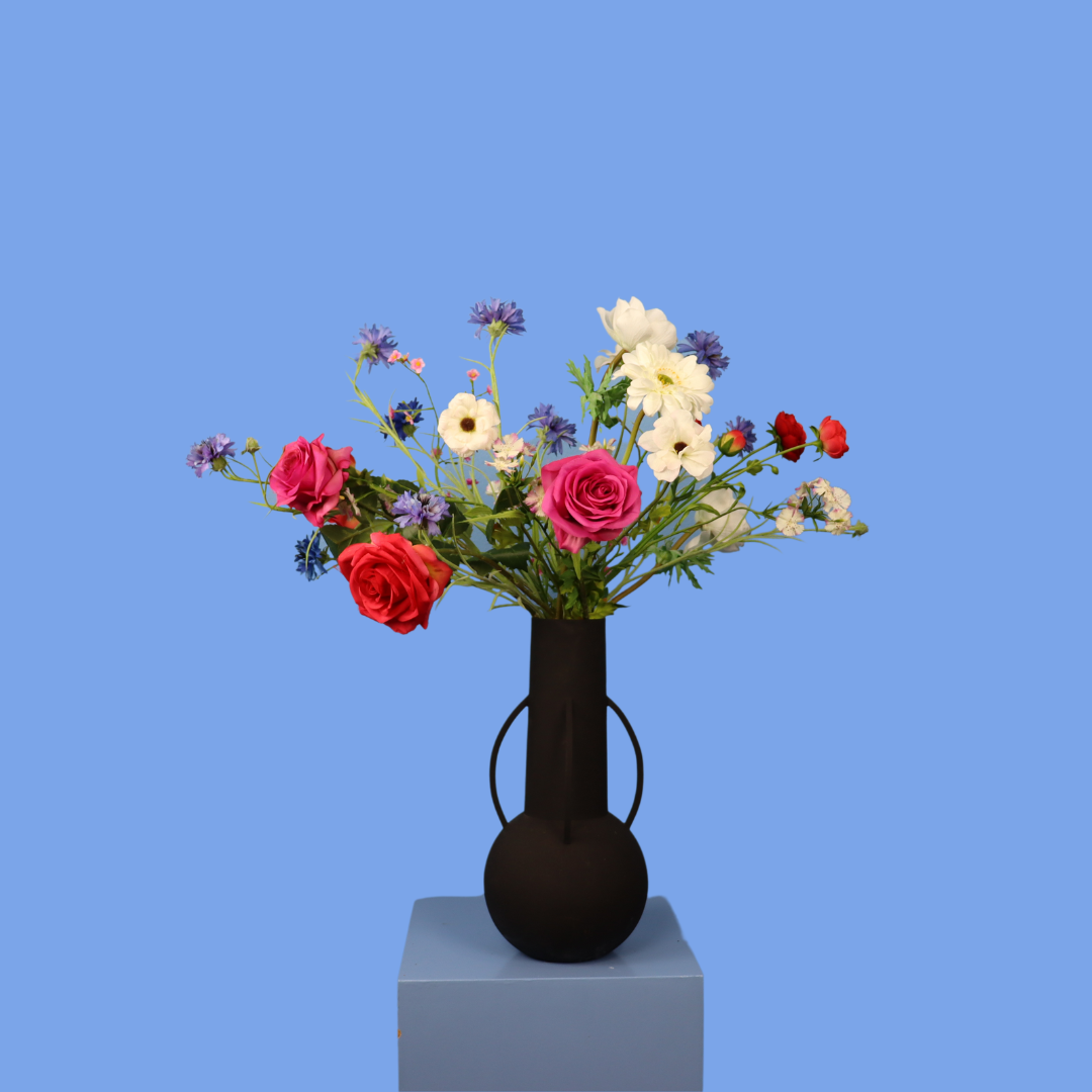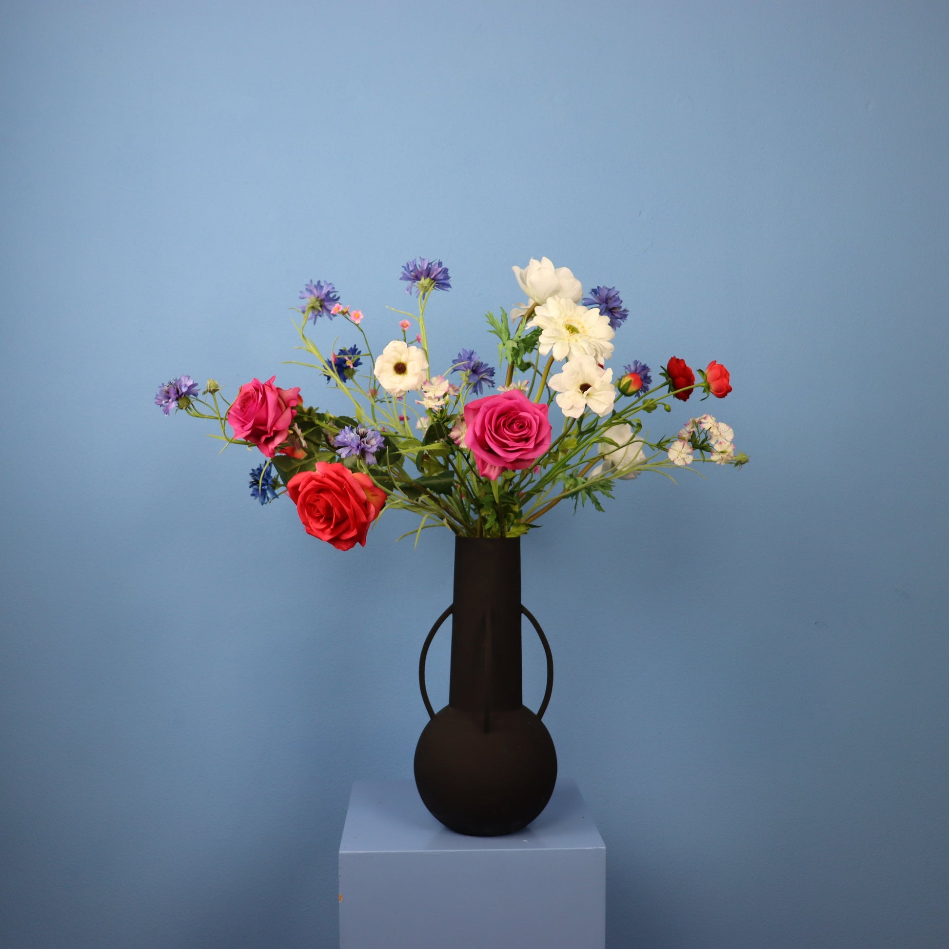 Deze zwarte Pols Potten vaas bevat een prachtige combinatie van (tuin)rozen en korenbloemen.
