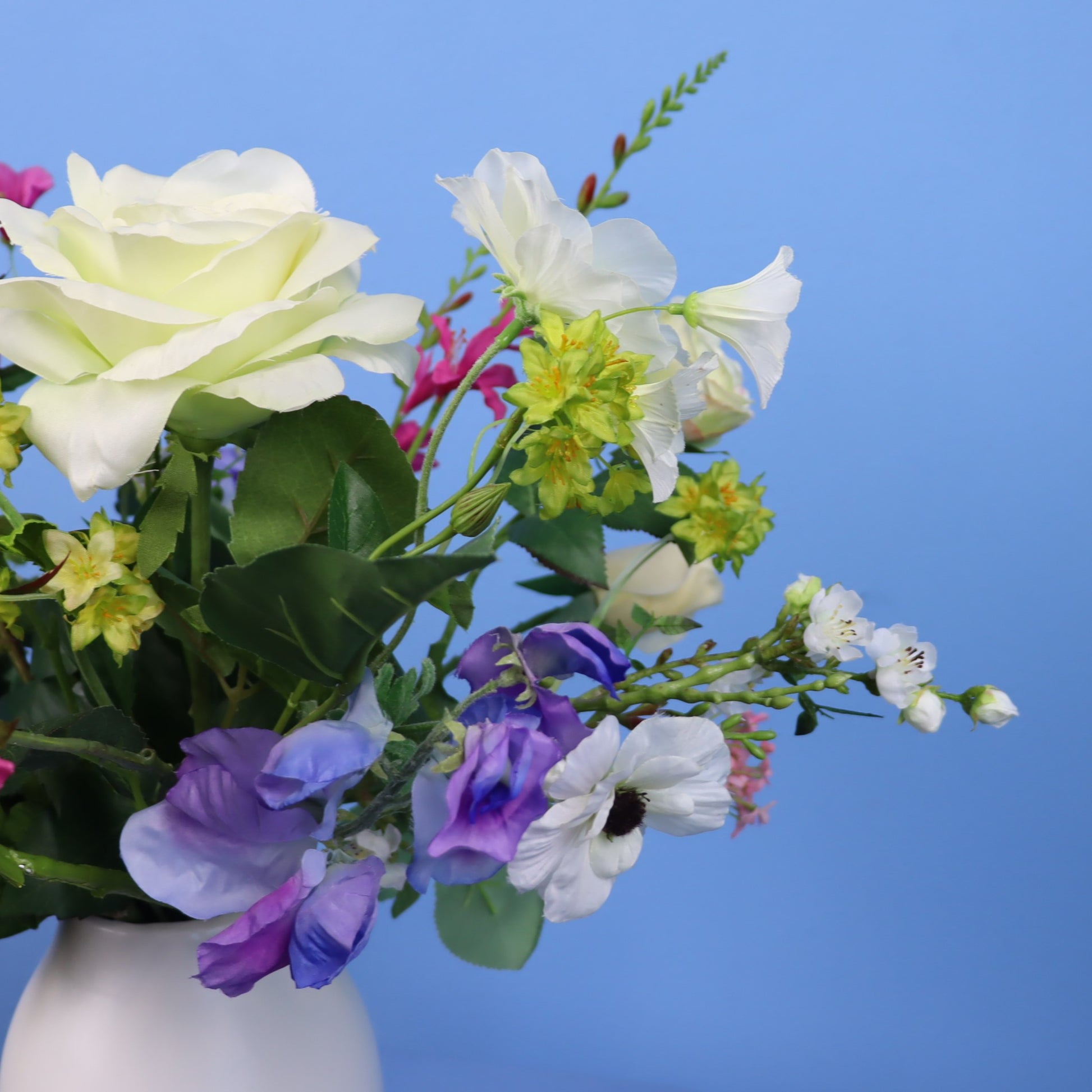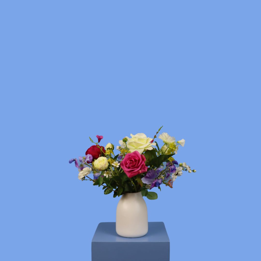 Witte vaas met een boeket in de kleuren roze, wit en groen.