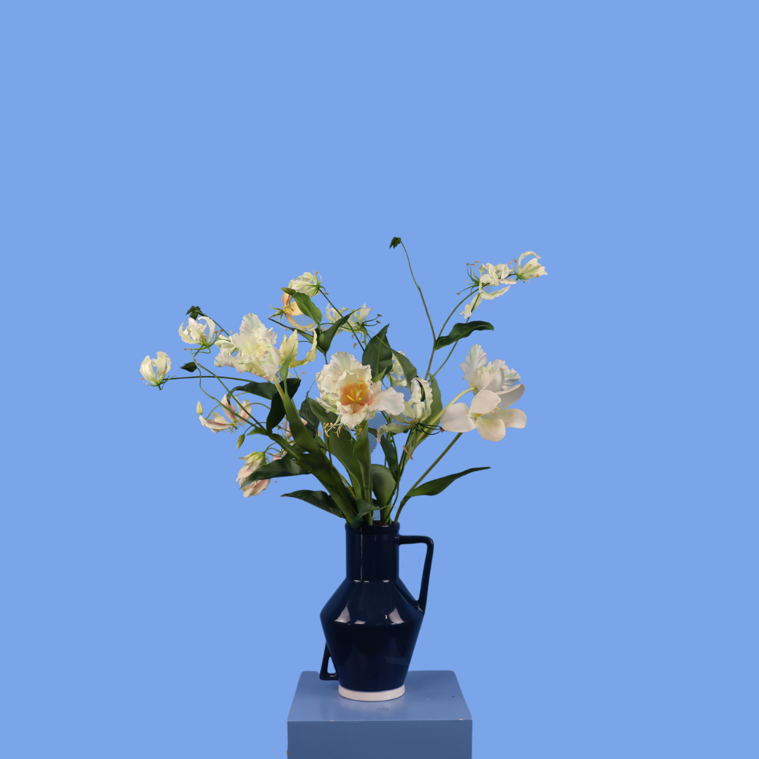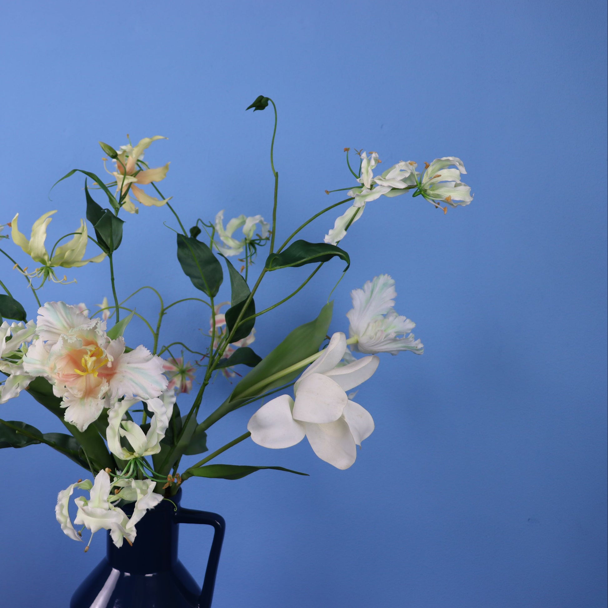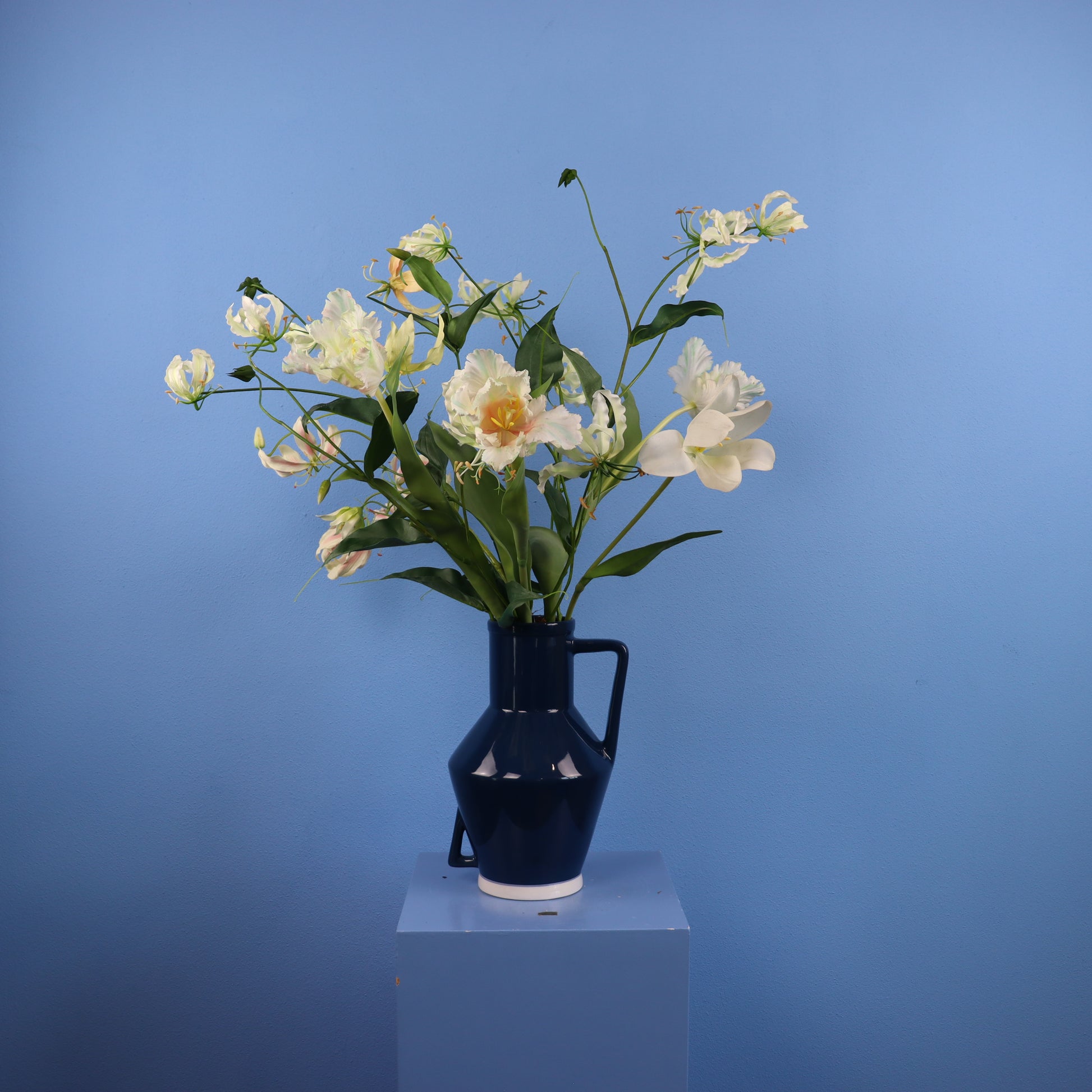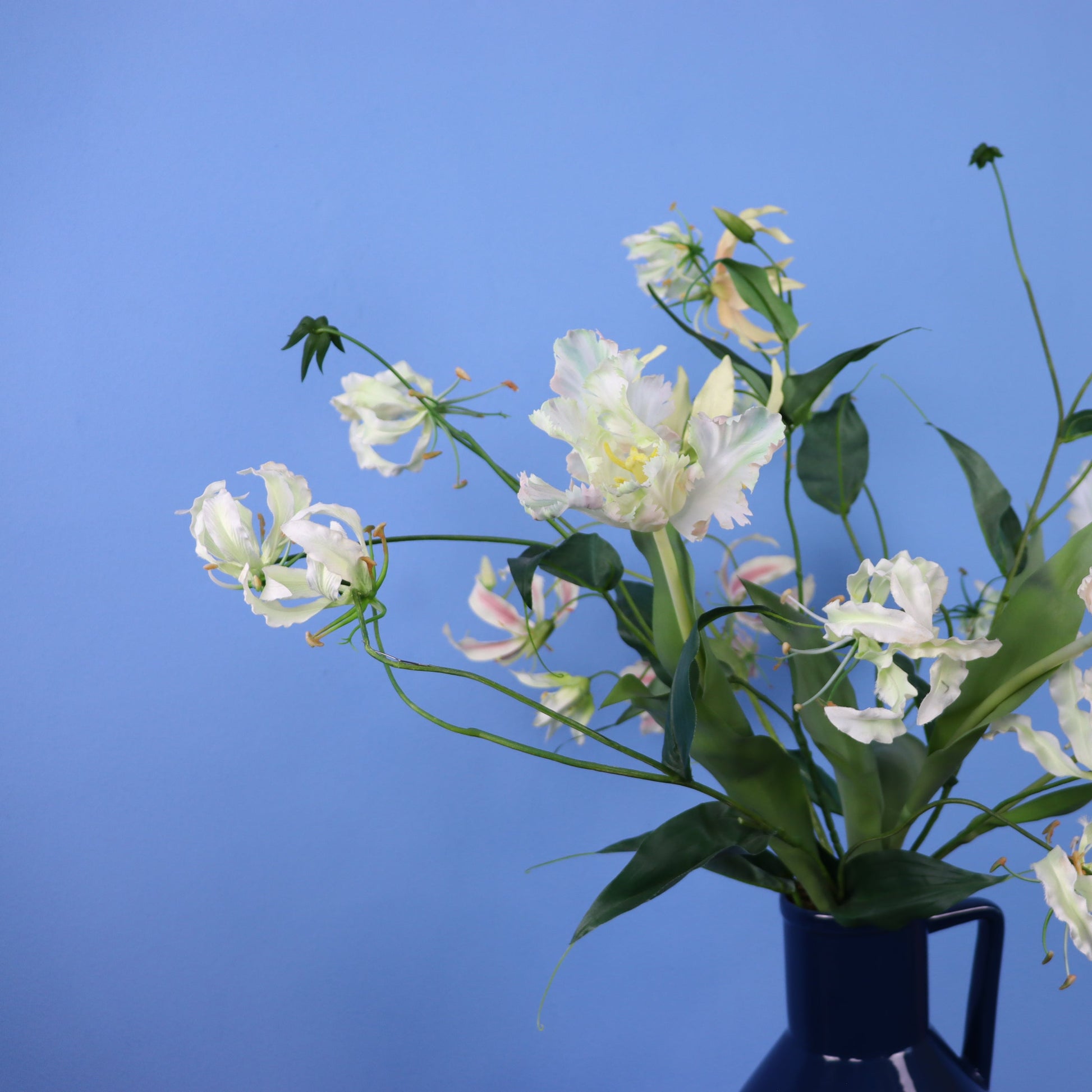 Een blauwe Return to Sender vaas gevuld met klimlelie's