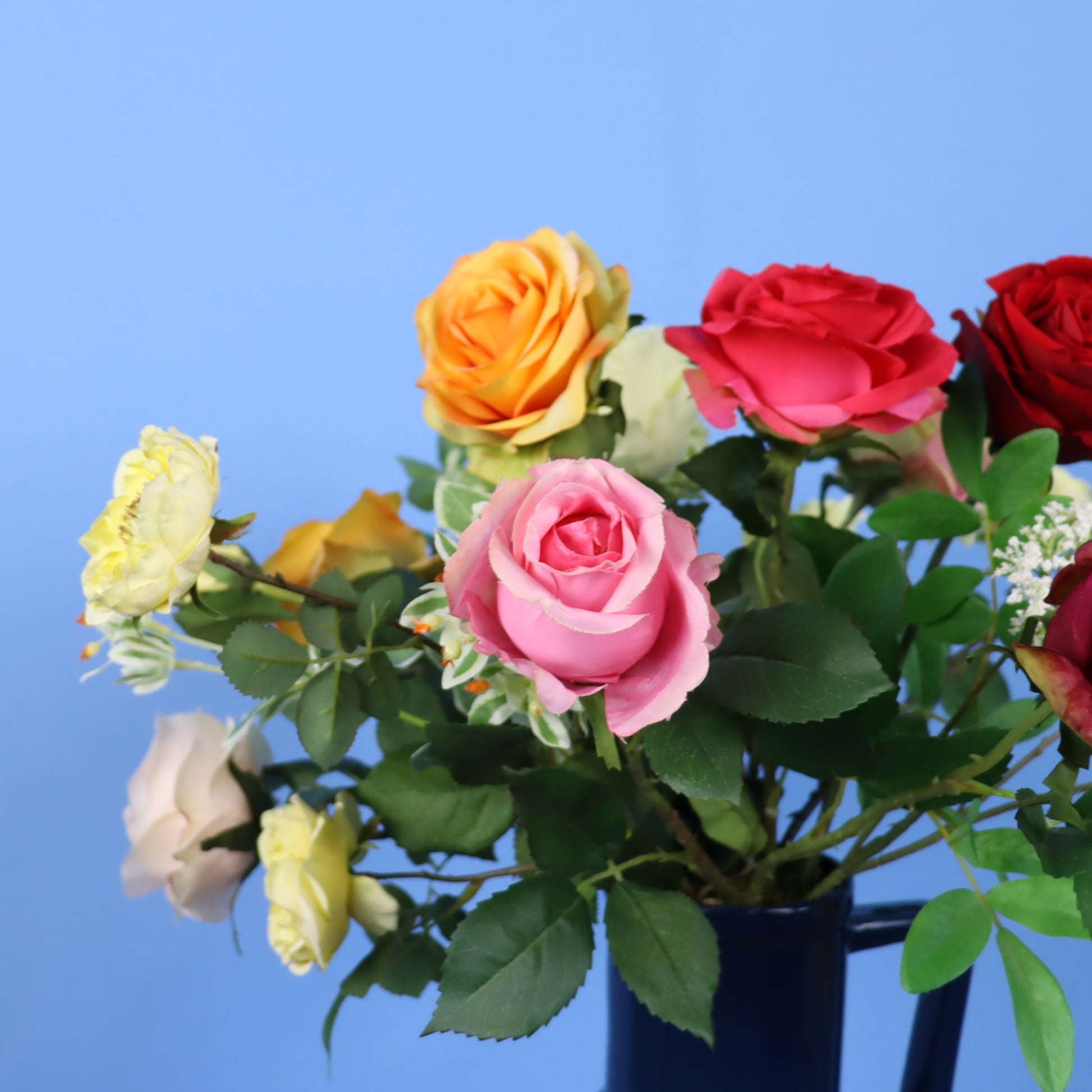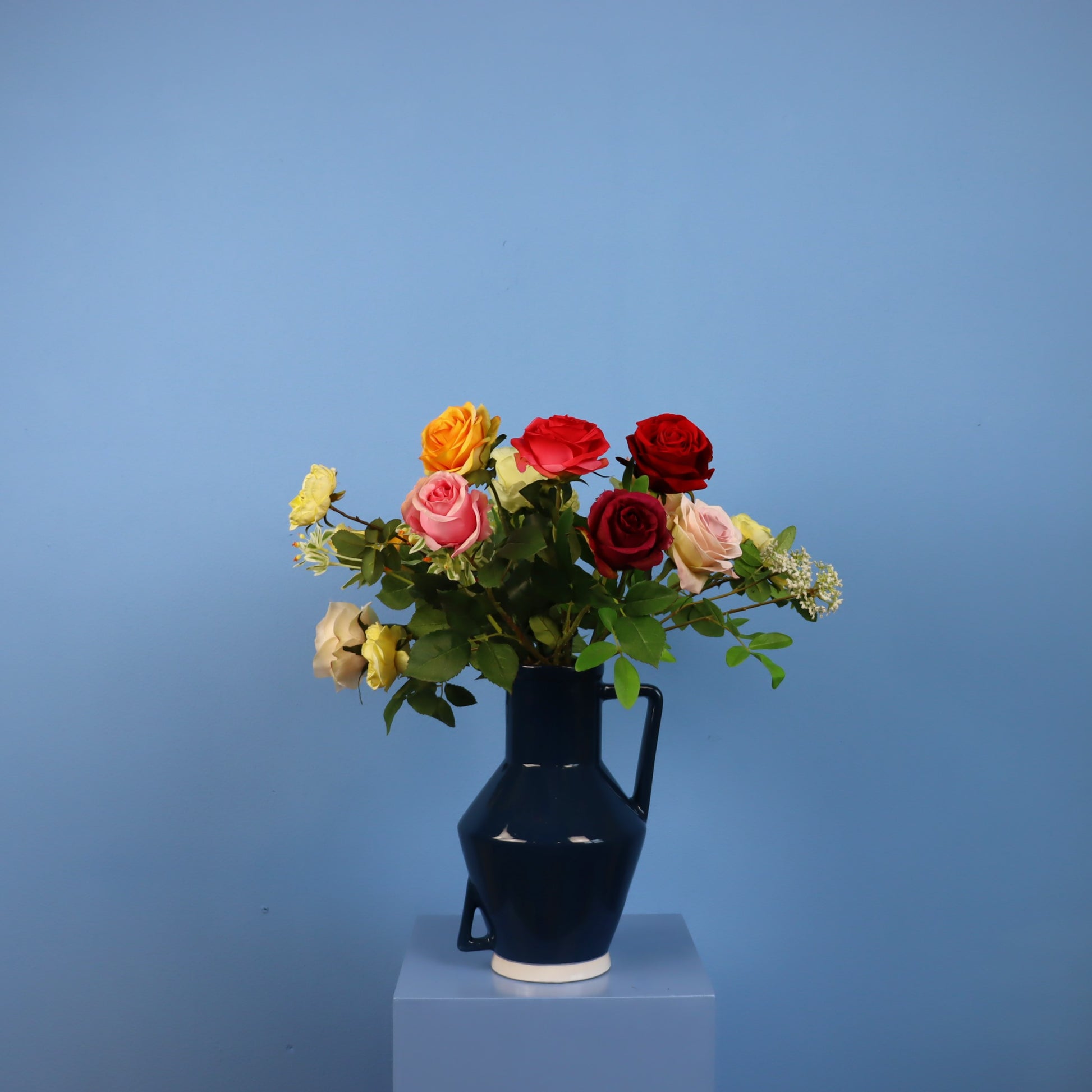 Donkerblauwe Return to Sender vaas met vrolijke rozen in verschillende kleuren.
