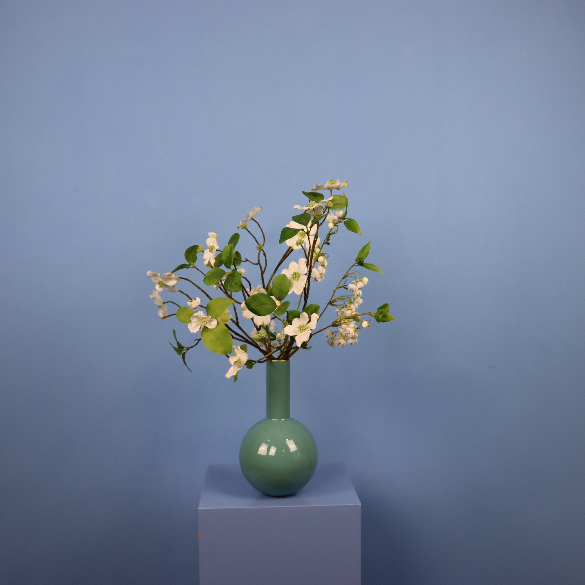 Mooie groene vaas van Pip Studio, gevuld met een prachtig boeket in de kleuren wit en groen.