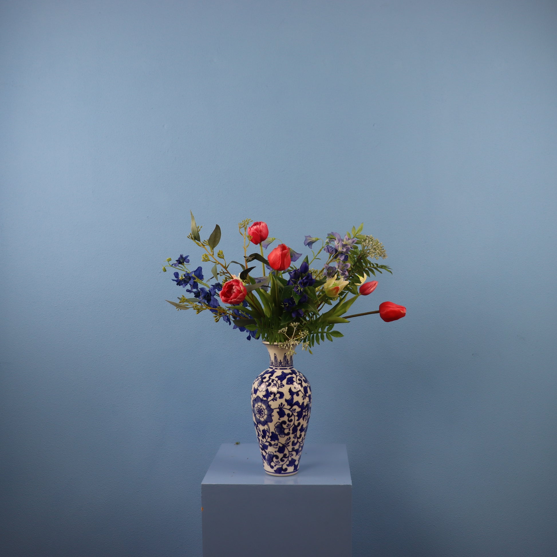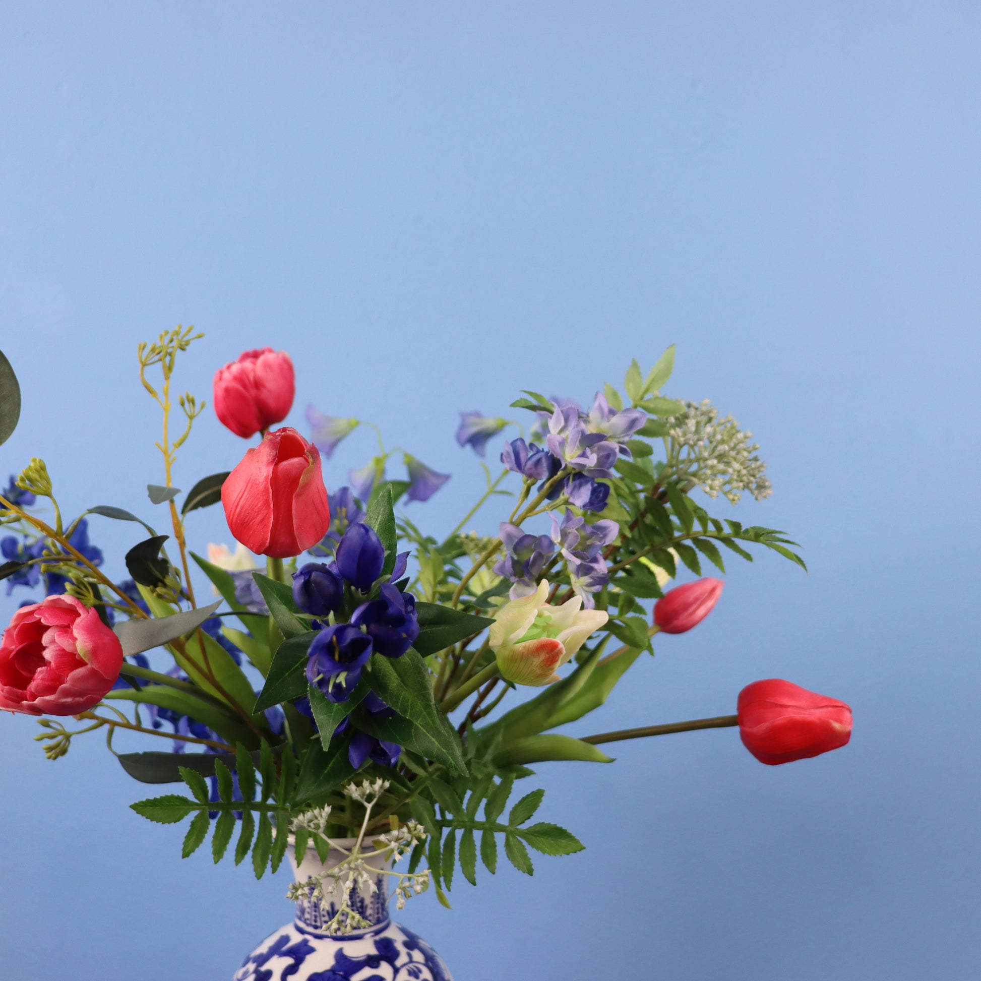 Deze vaas in Delftse stijl is gevuld met een bos kleurrijke blijvende bloemen.
