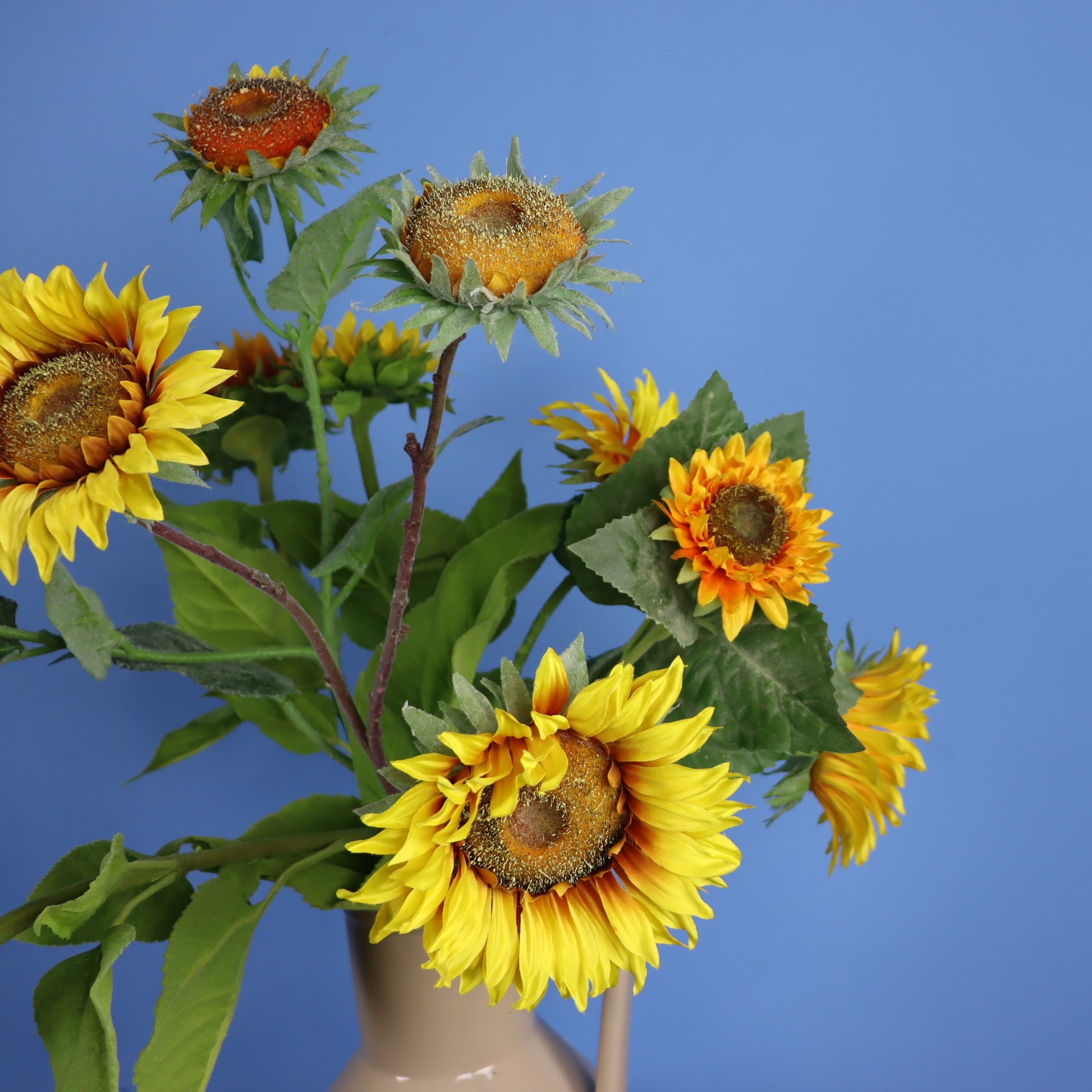Deze beige Return to Sender vaas komt met prachtige zonnebloemen.
