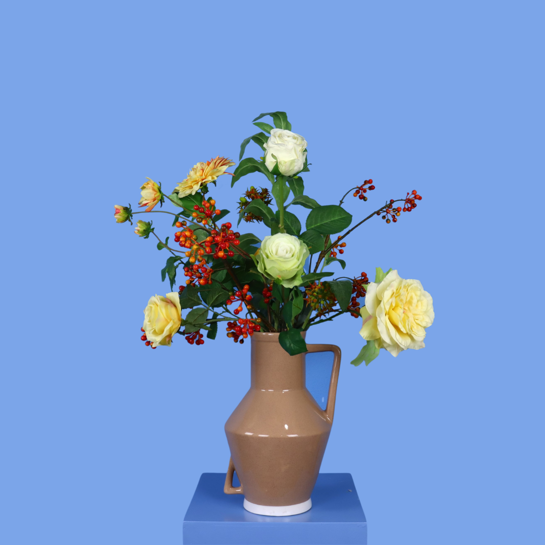 Beige Return to Sender vaas gevuld met rozen en besjes.