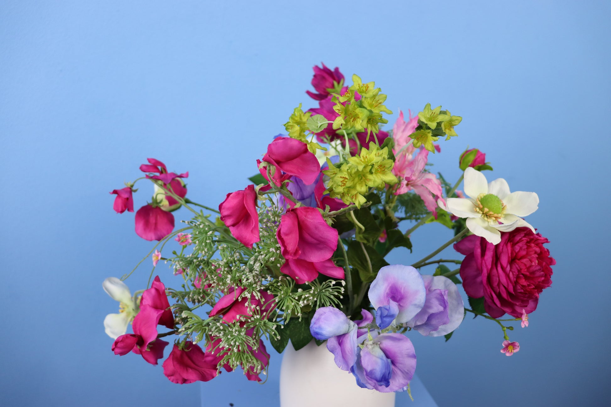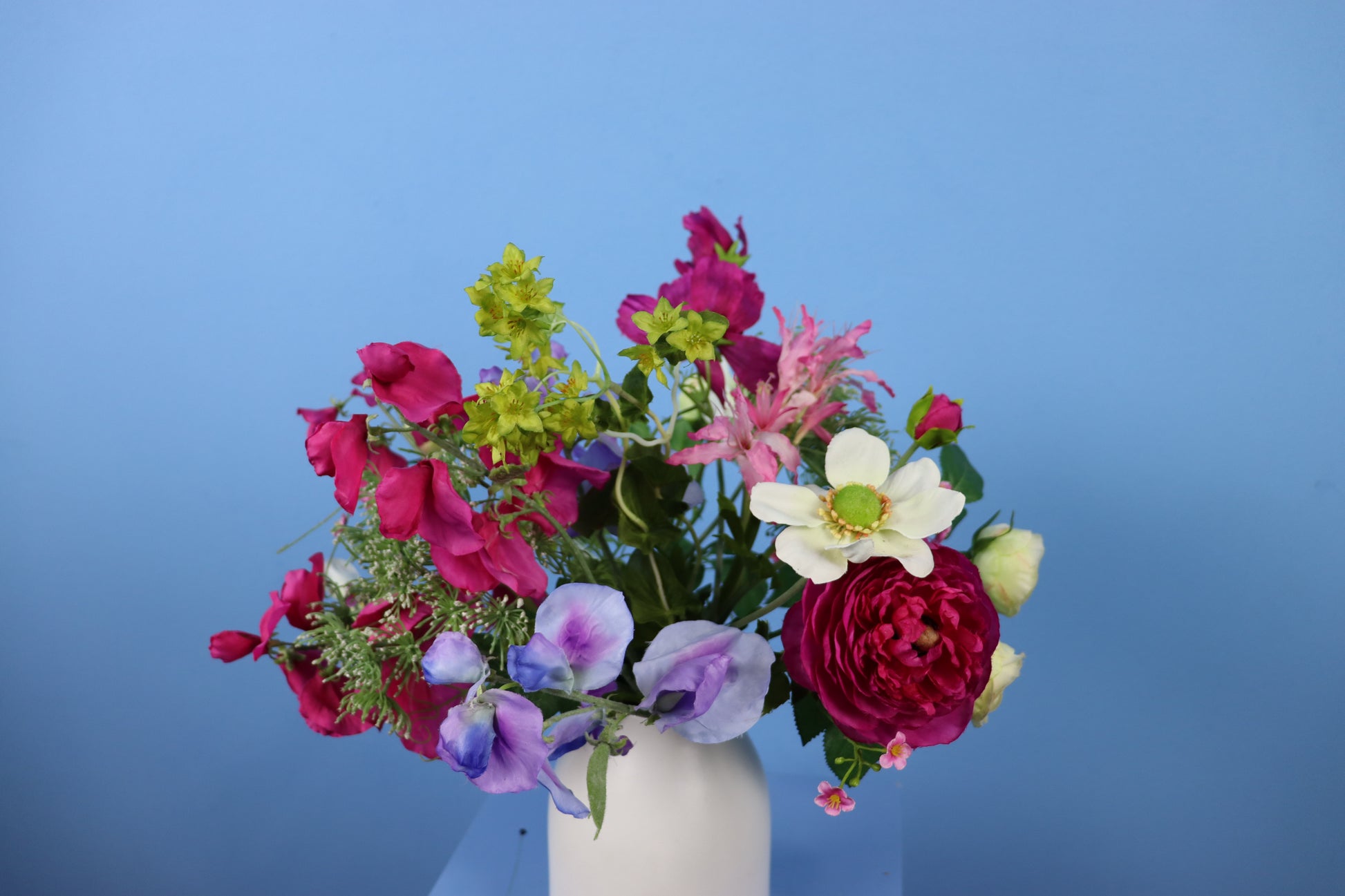 Witte vaas met een boeket in de kleuren roze, wit en groen.
