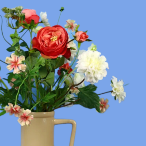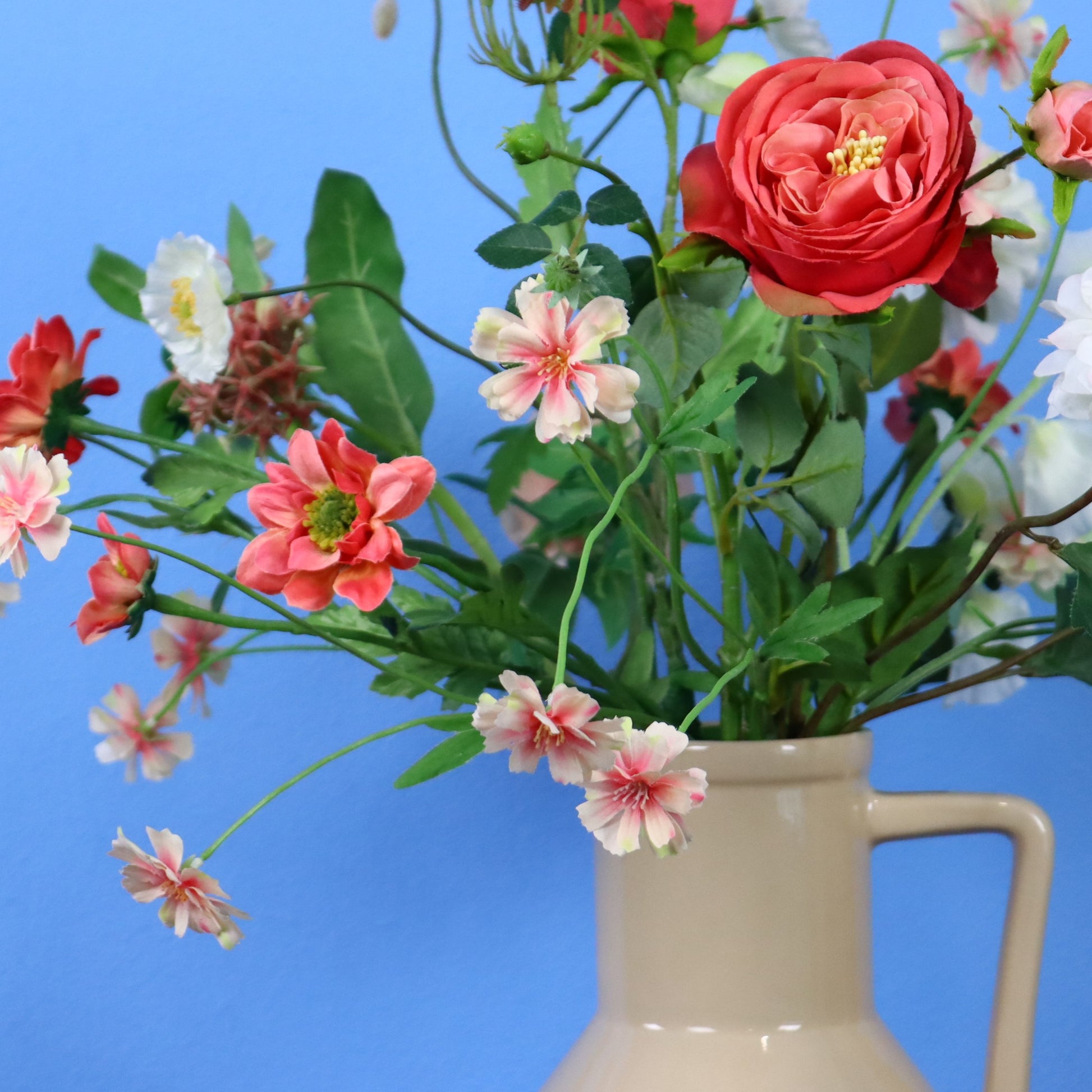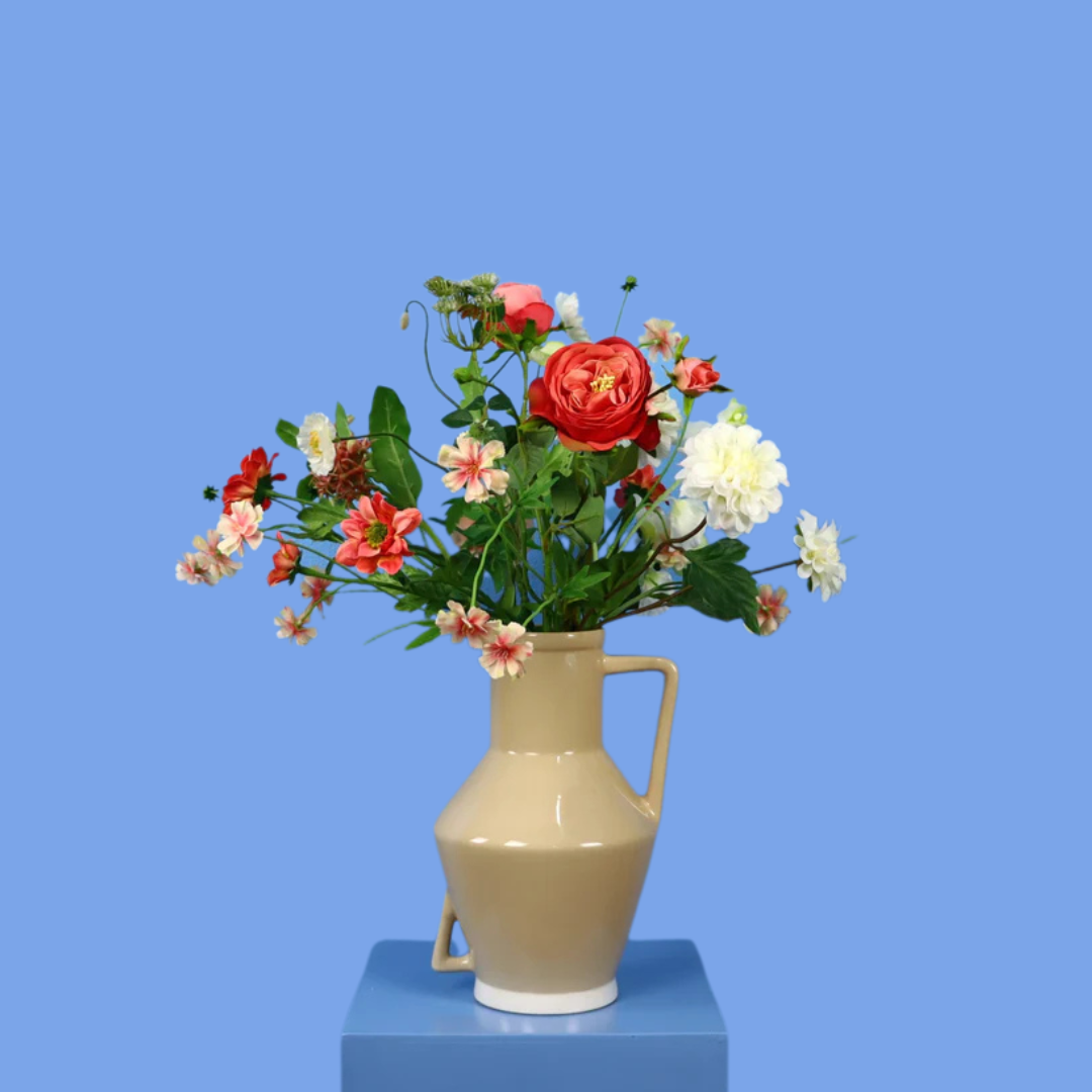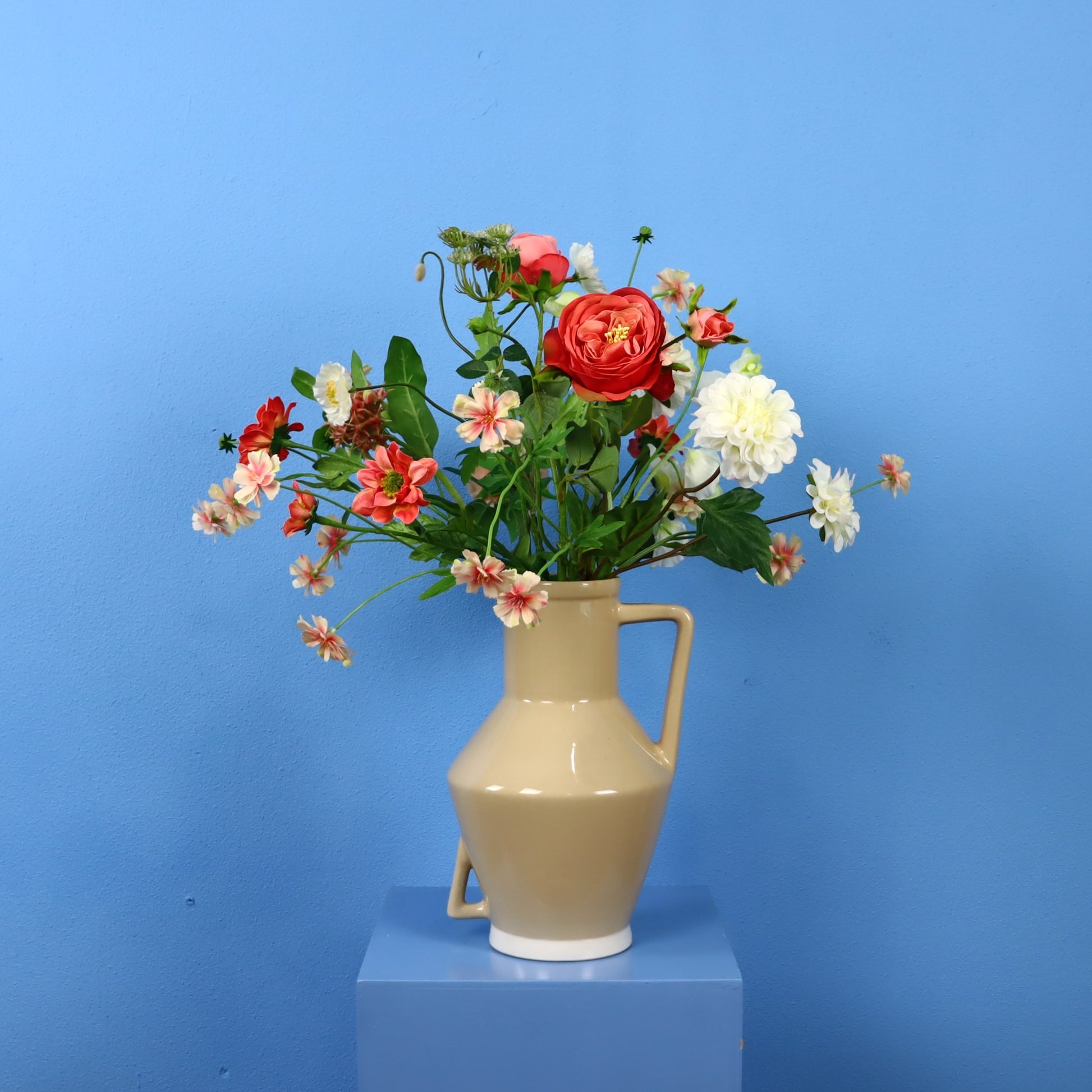 Deze beige Return to Sender vaas is gevuld met prachtige blijvende bloemen.