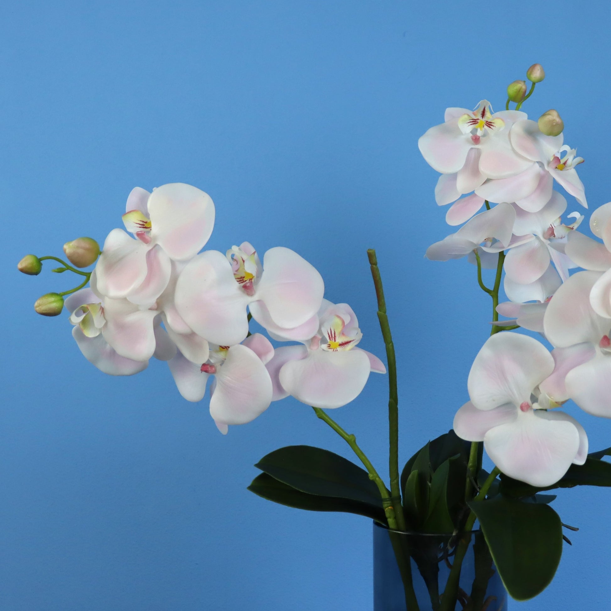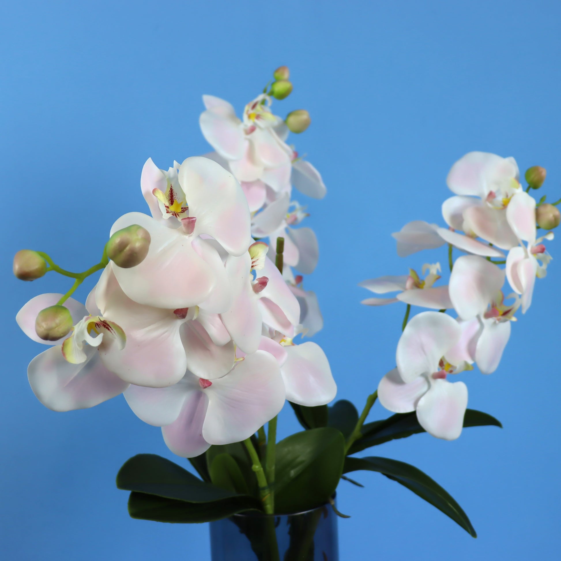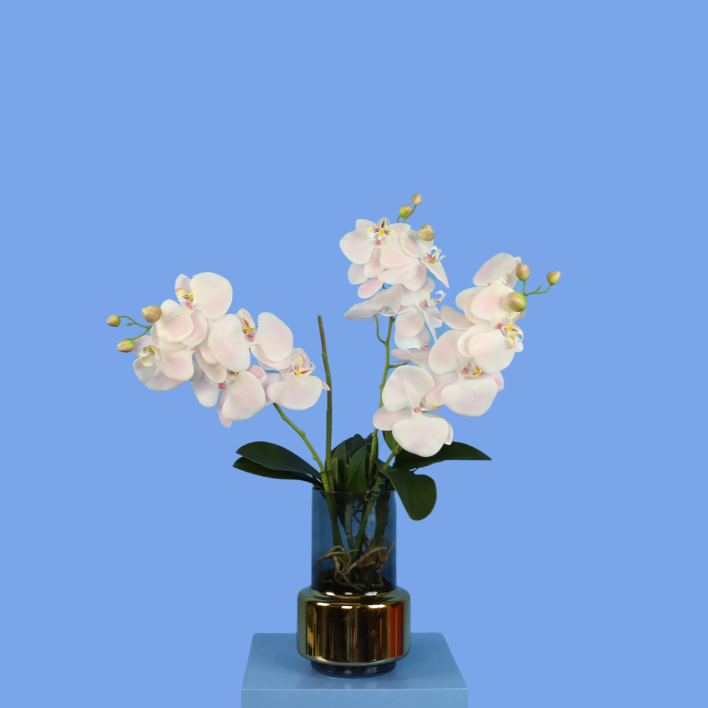 Glazen vaas van Pols Potten met een gouden rand gevuld met orchideeën.