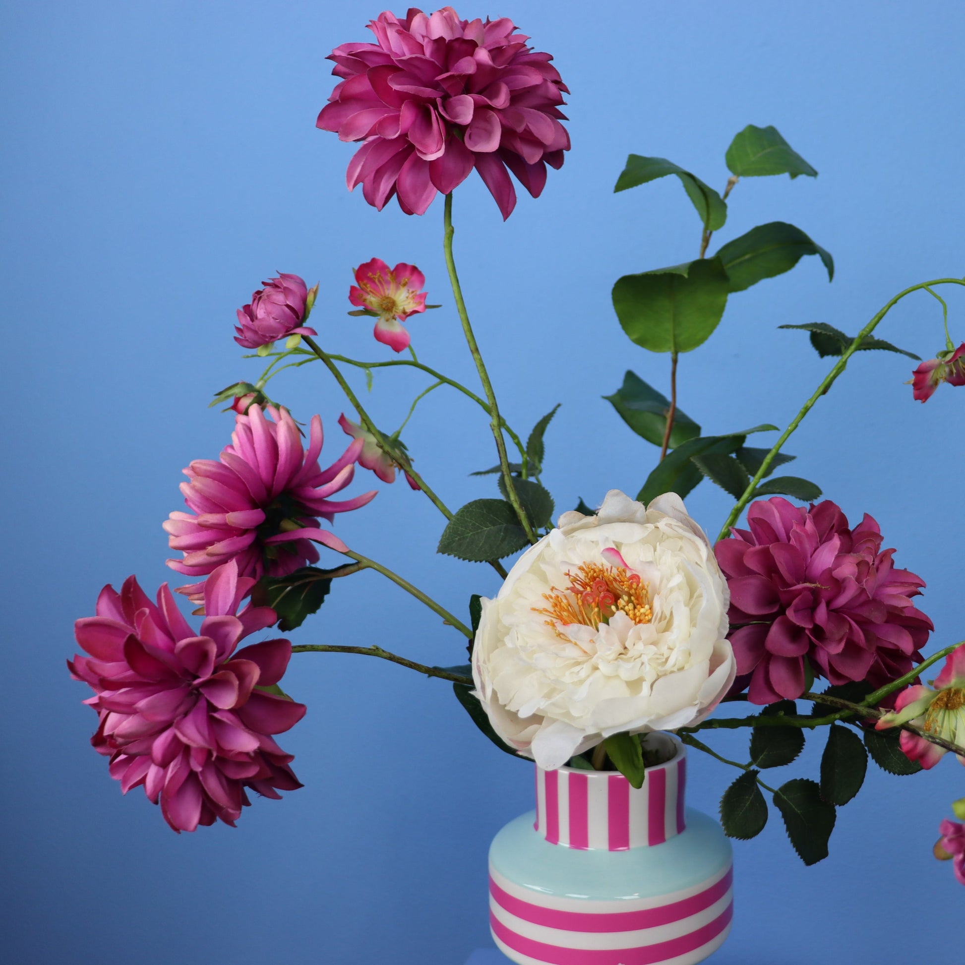 In deze kleurrijke vaas zit een schattig boeket van blijvende bloemen.