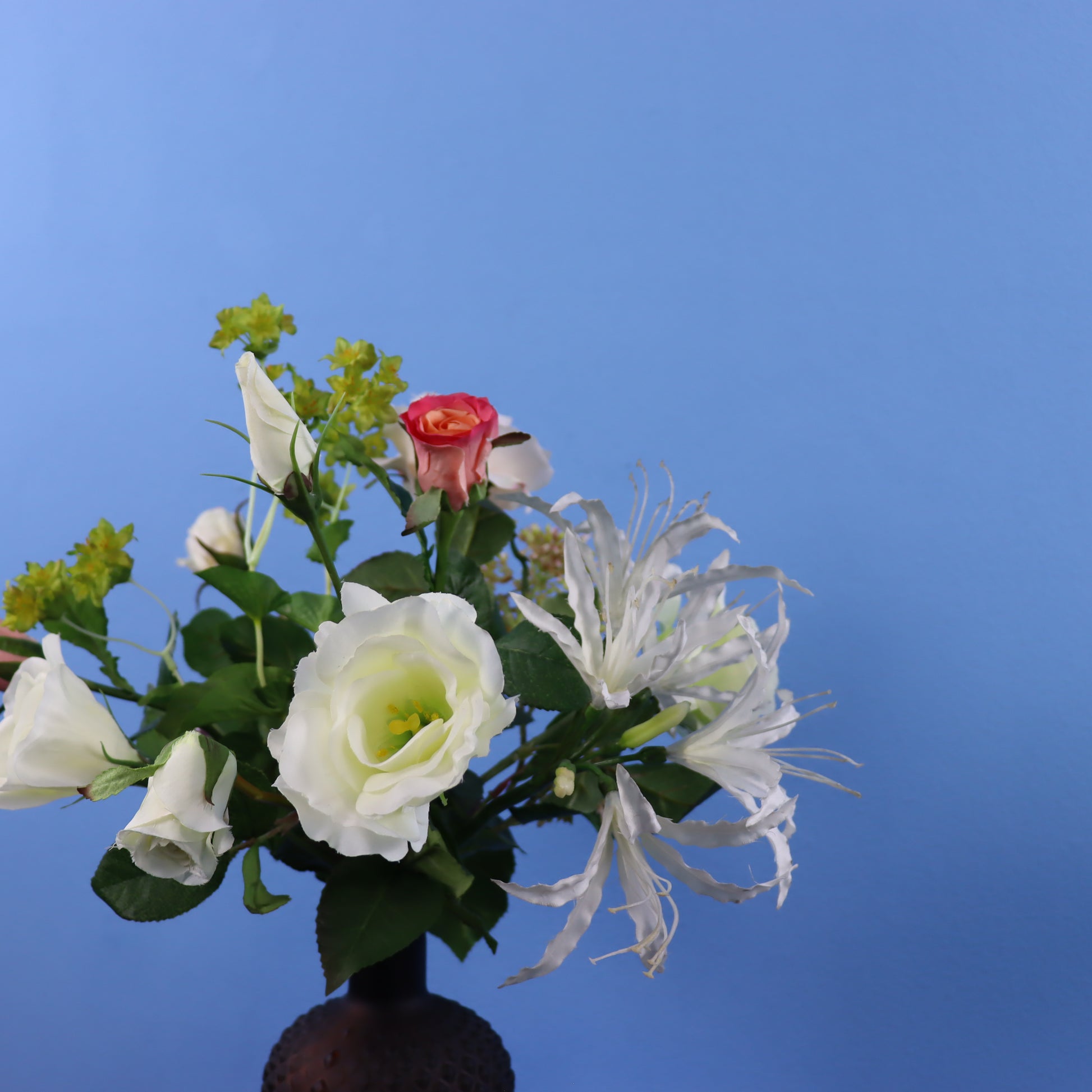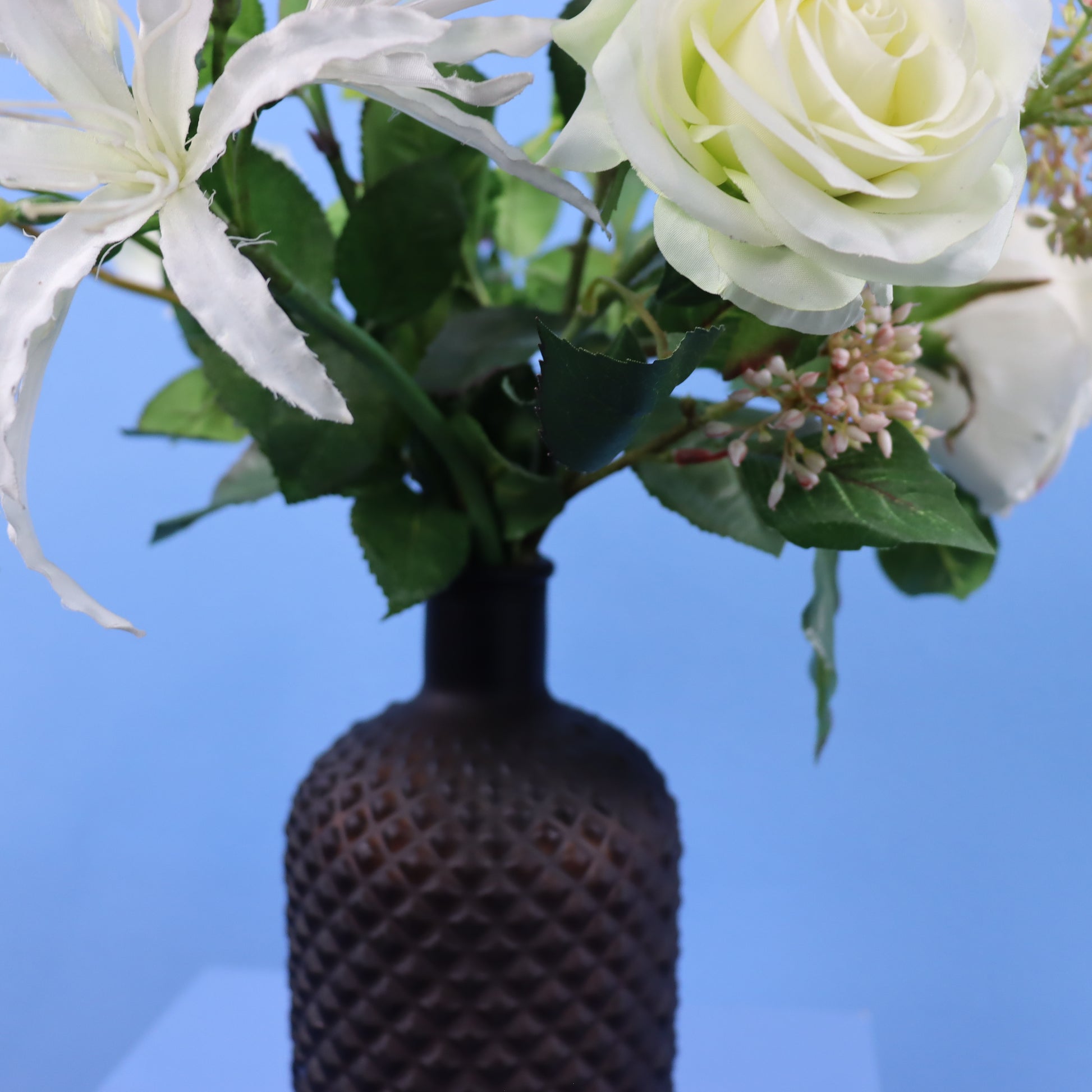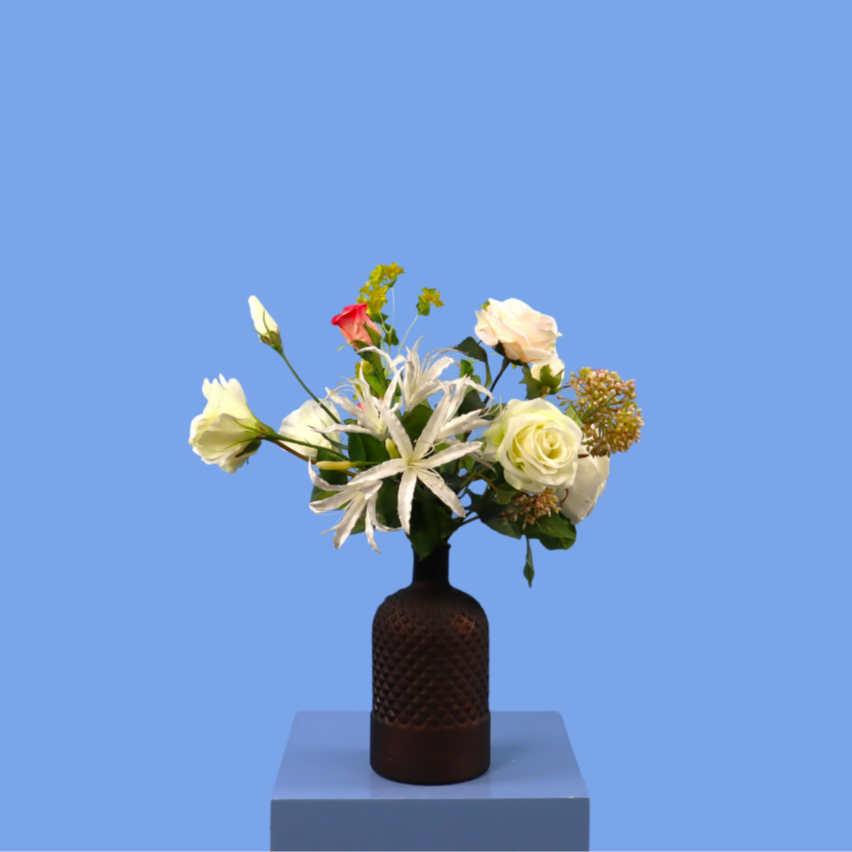 Kleine bruine vaas van glas met wit boeket.