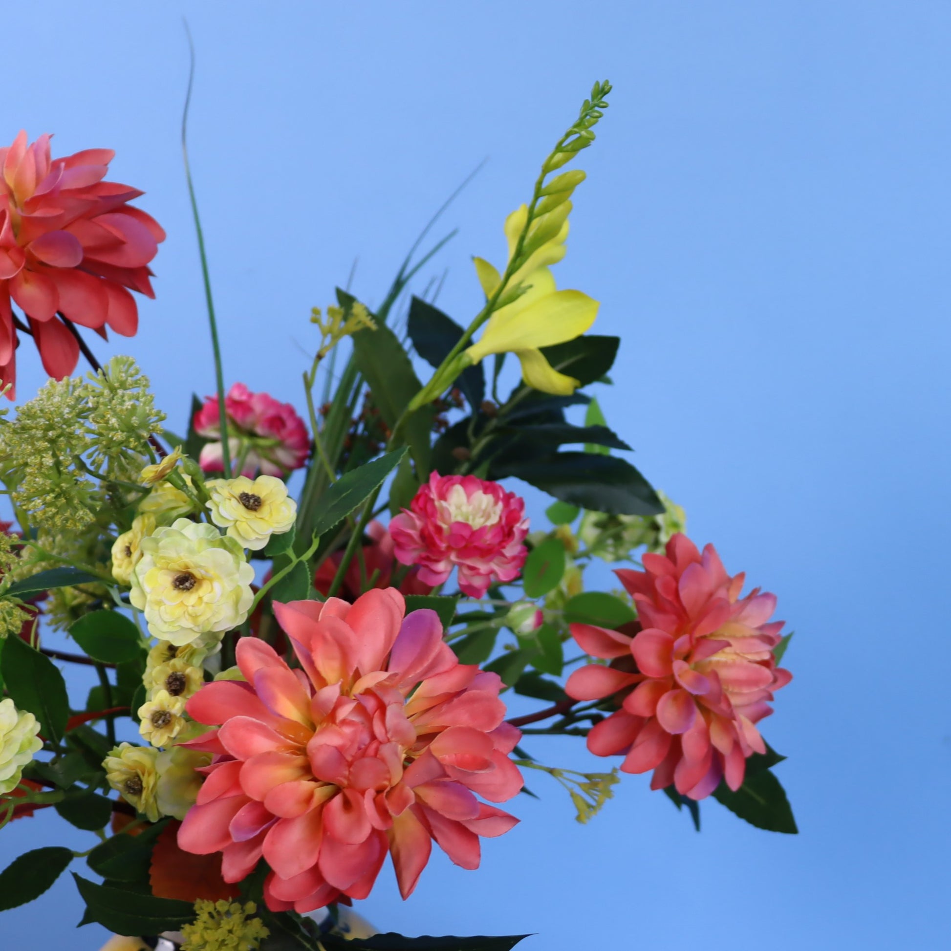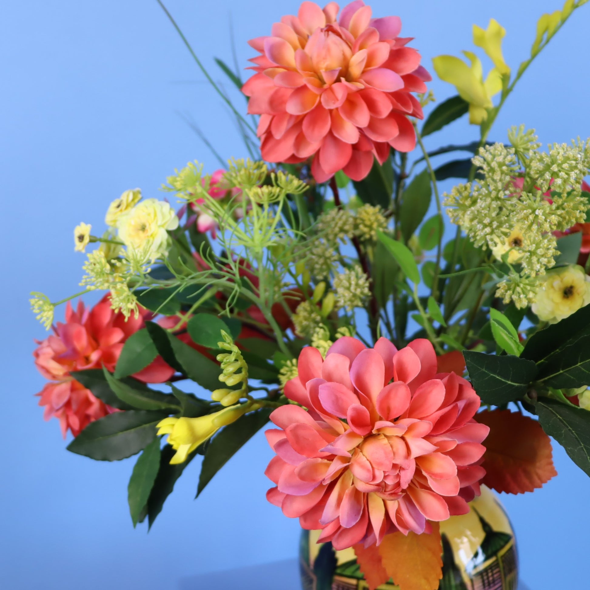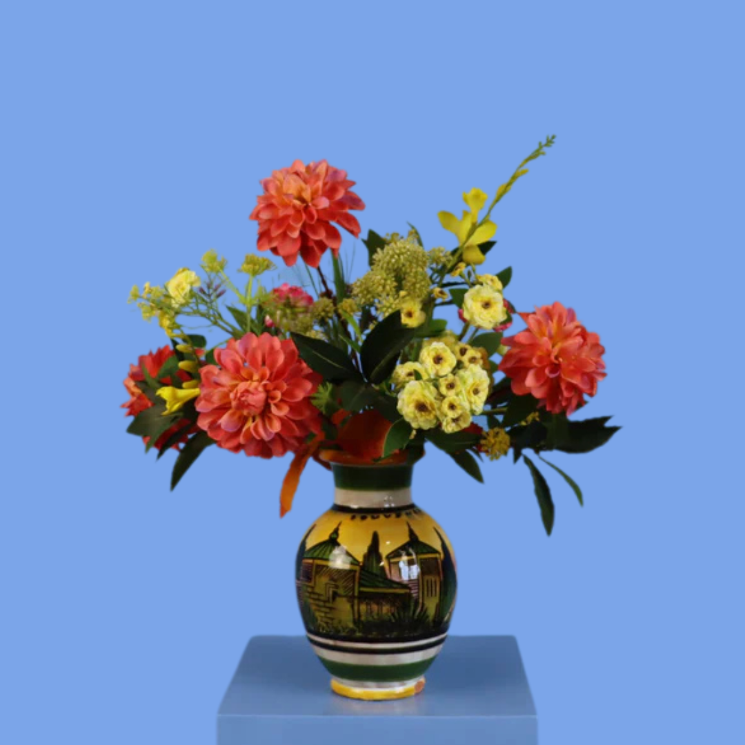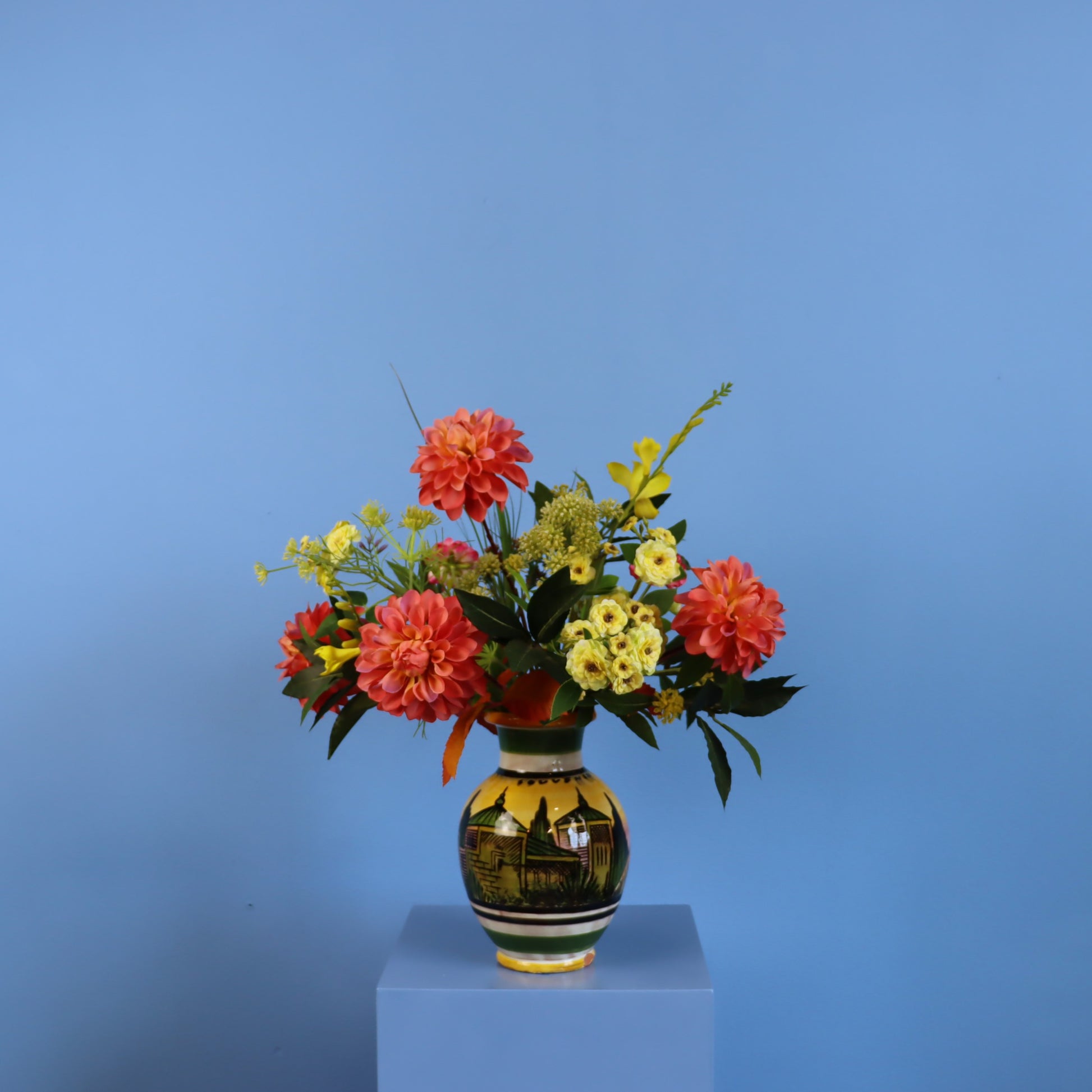 Vintage Marokkaanse vaas met dahlia's en rozen.