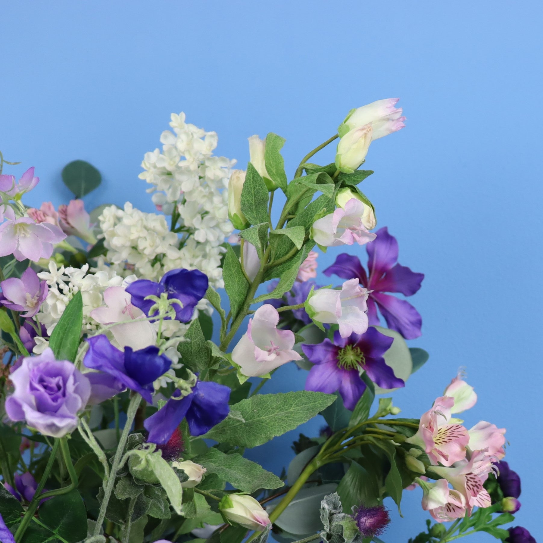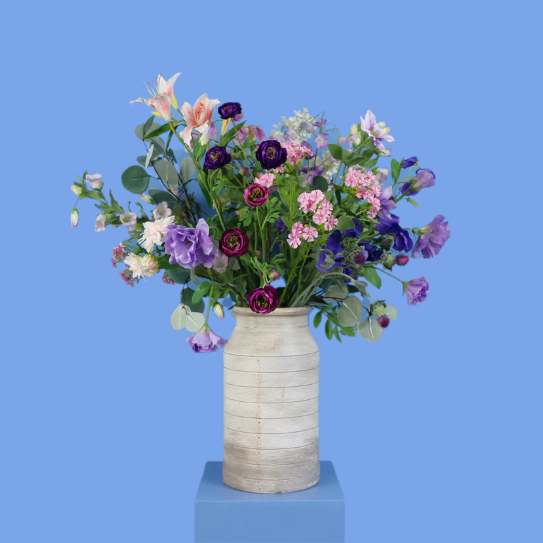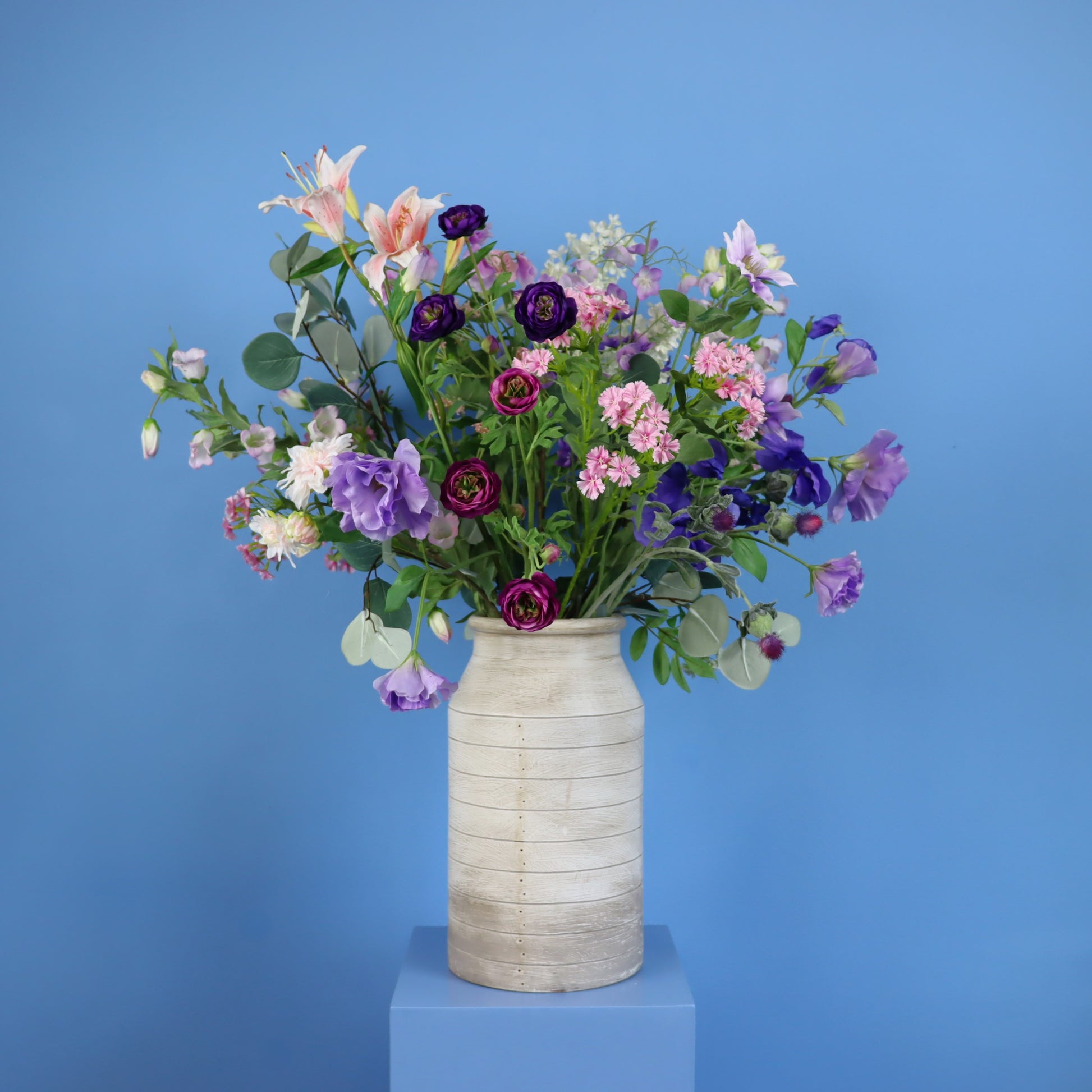 Grote betonnen vaas met een prachtig vol boeket blijvende bloemen.