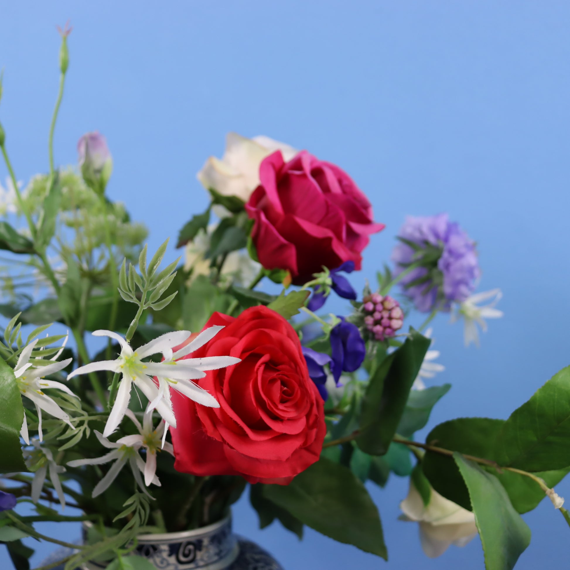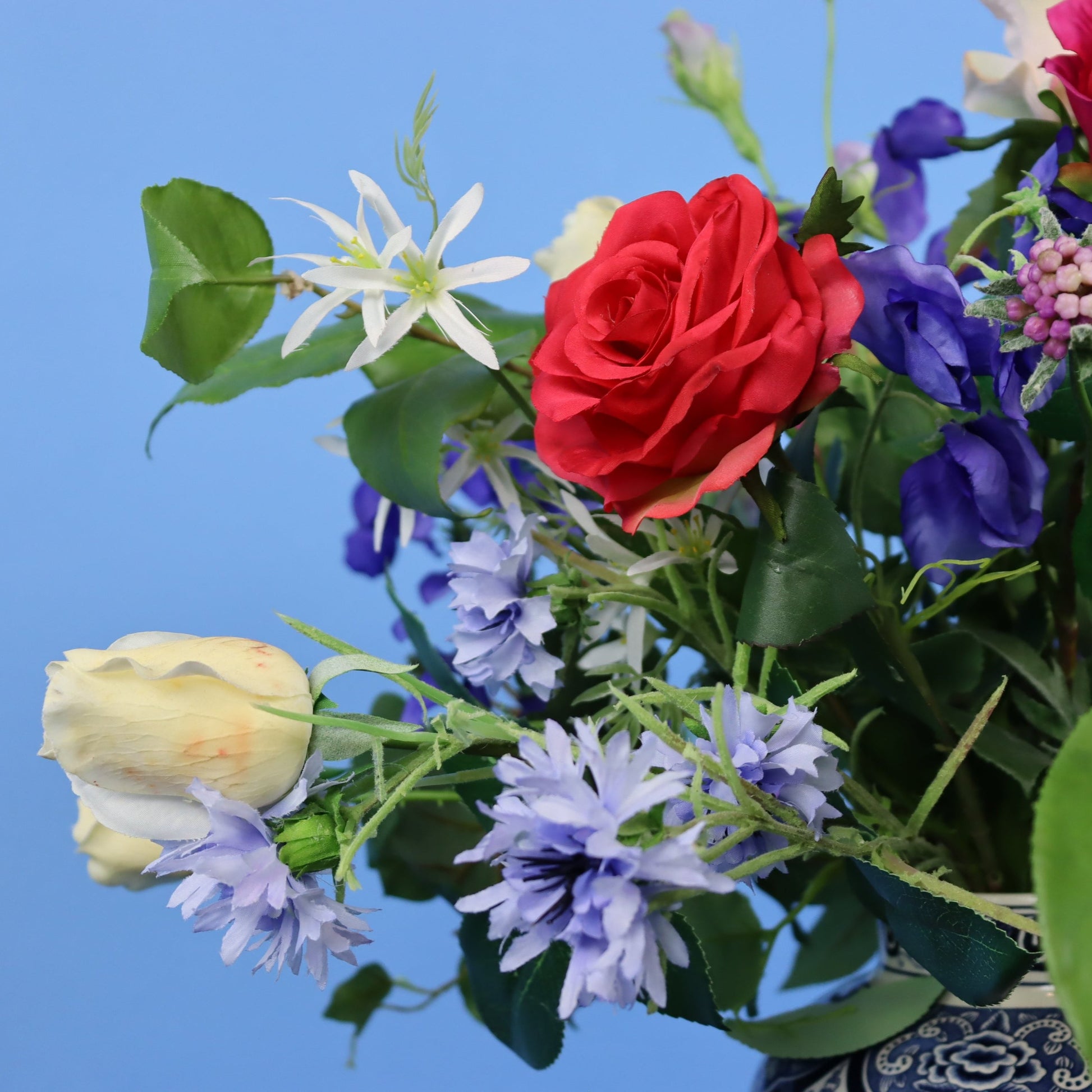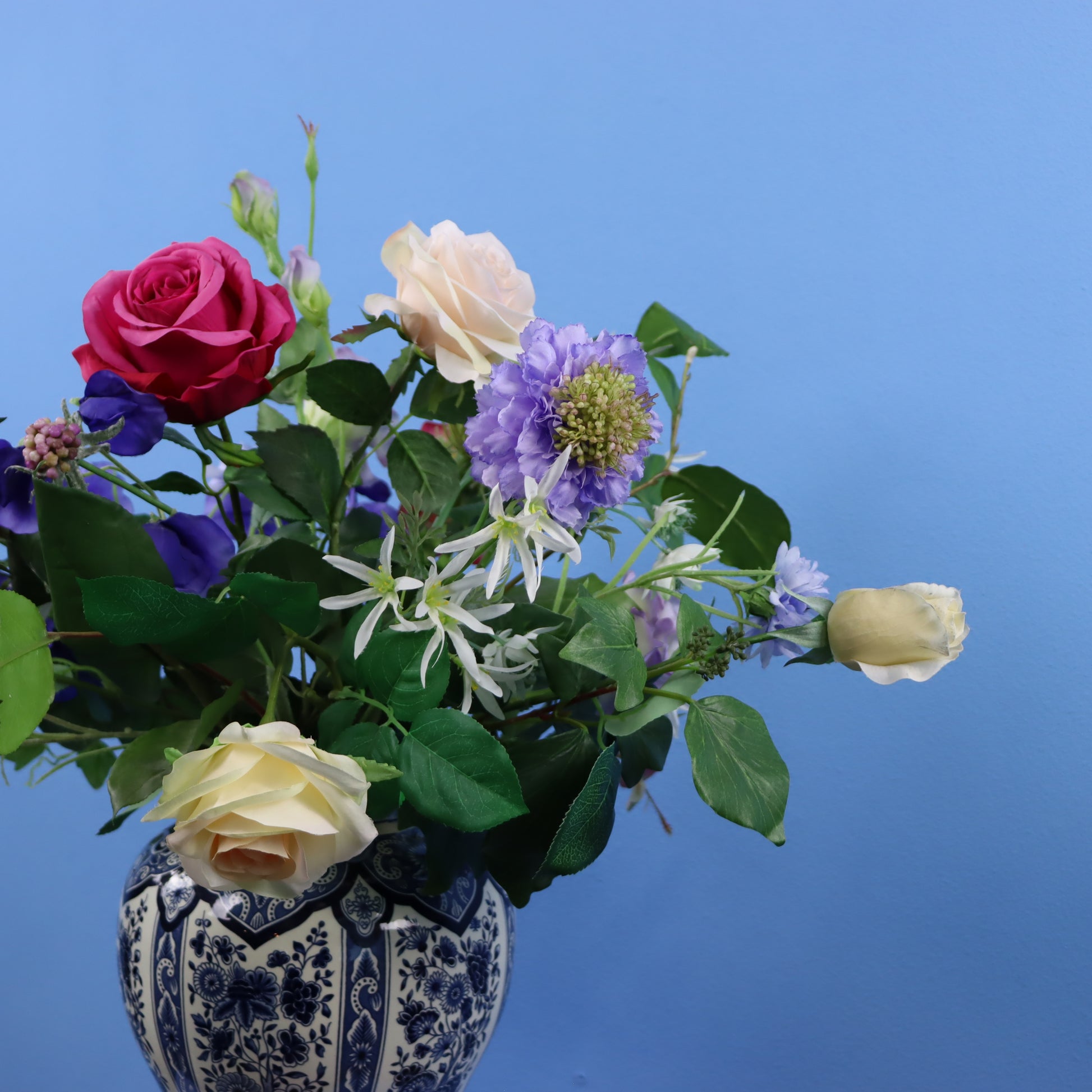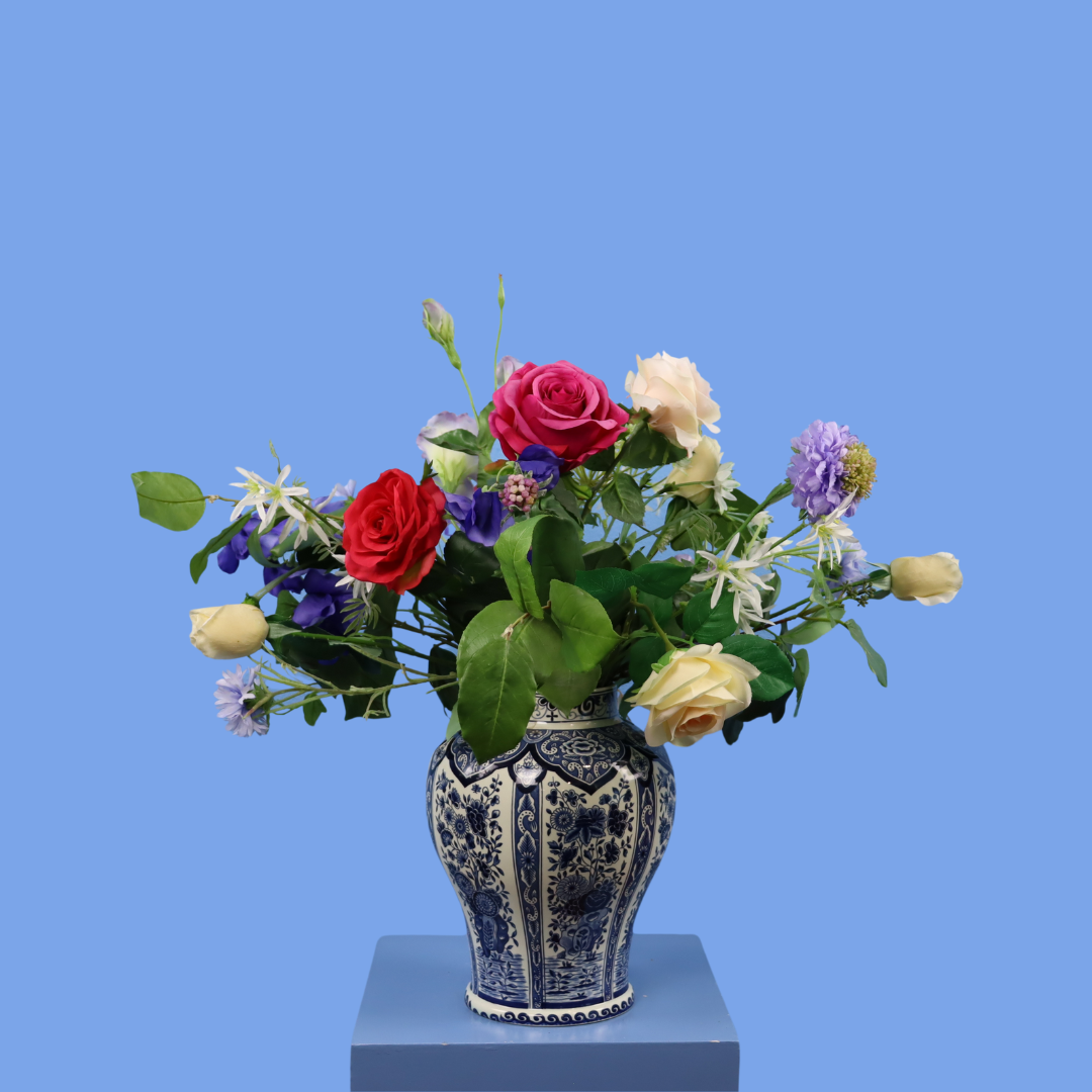 Vaas in delfstblauwe stijl met klassieke bos bloemen o.a. met rozen, korenbloemen en is aangevuld met groen.