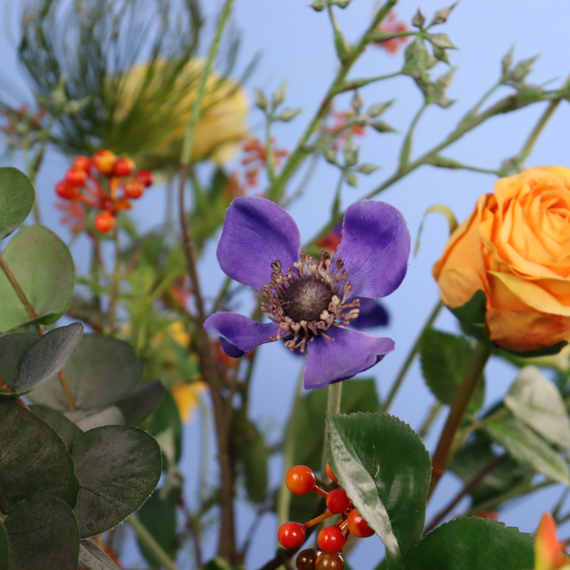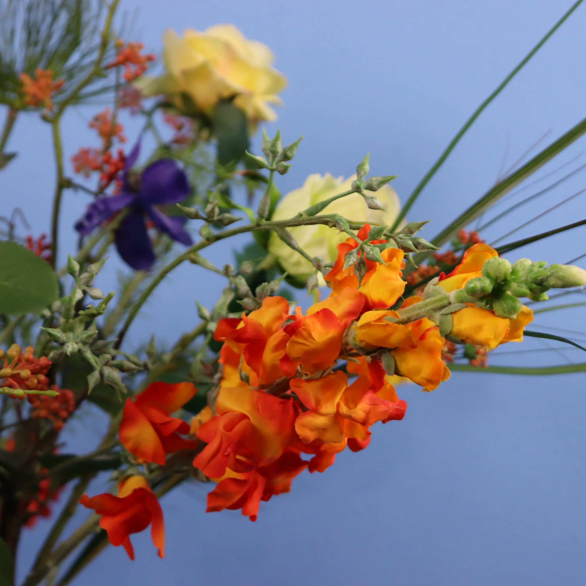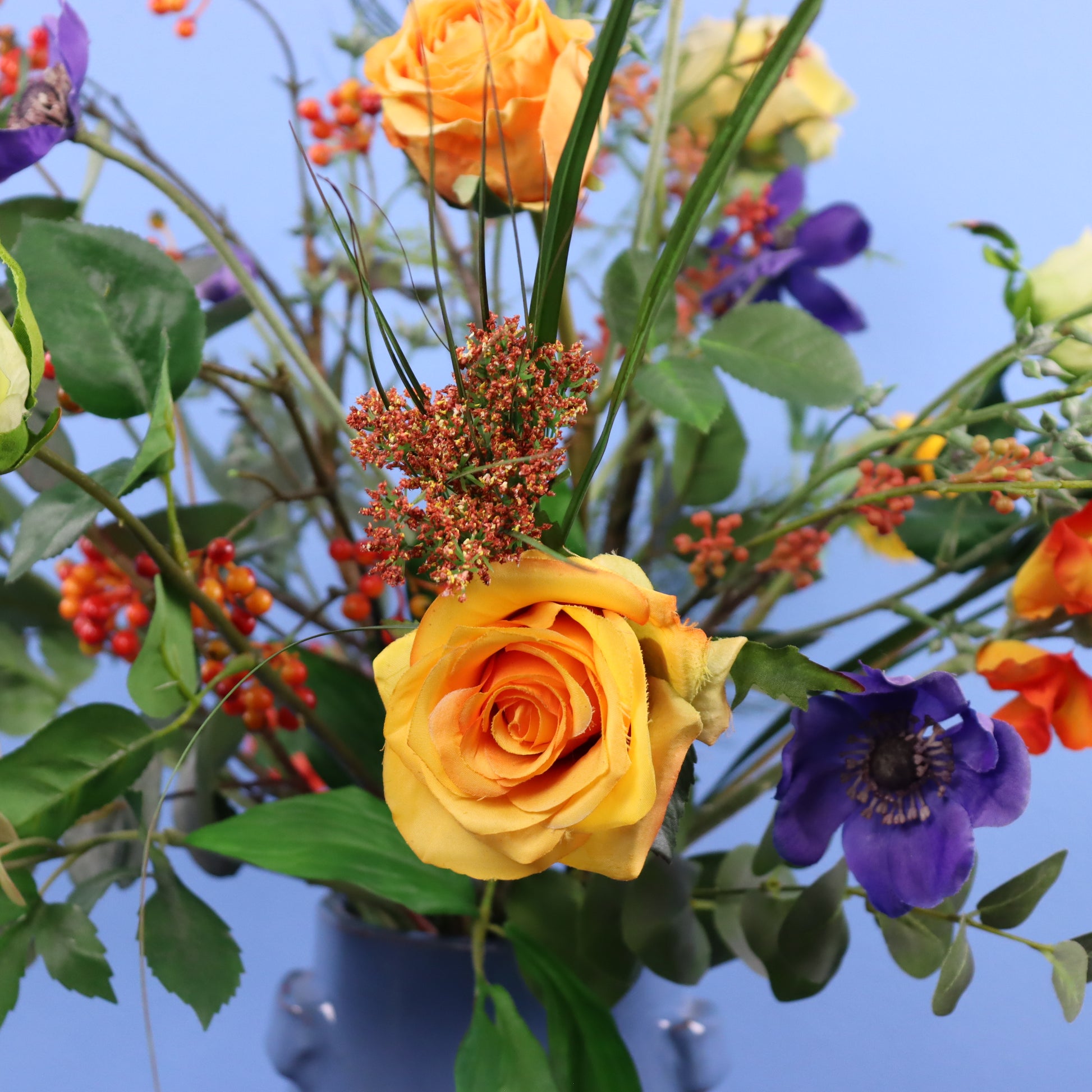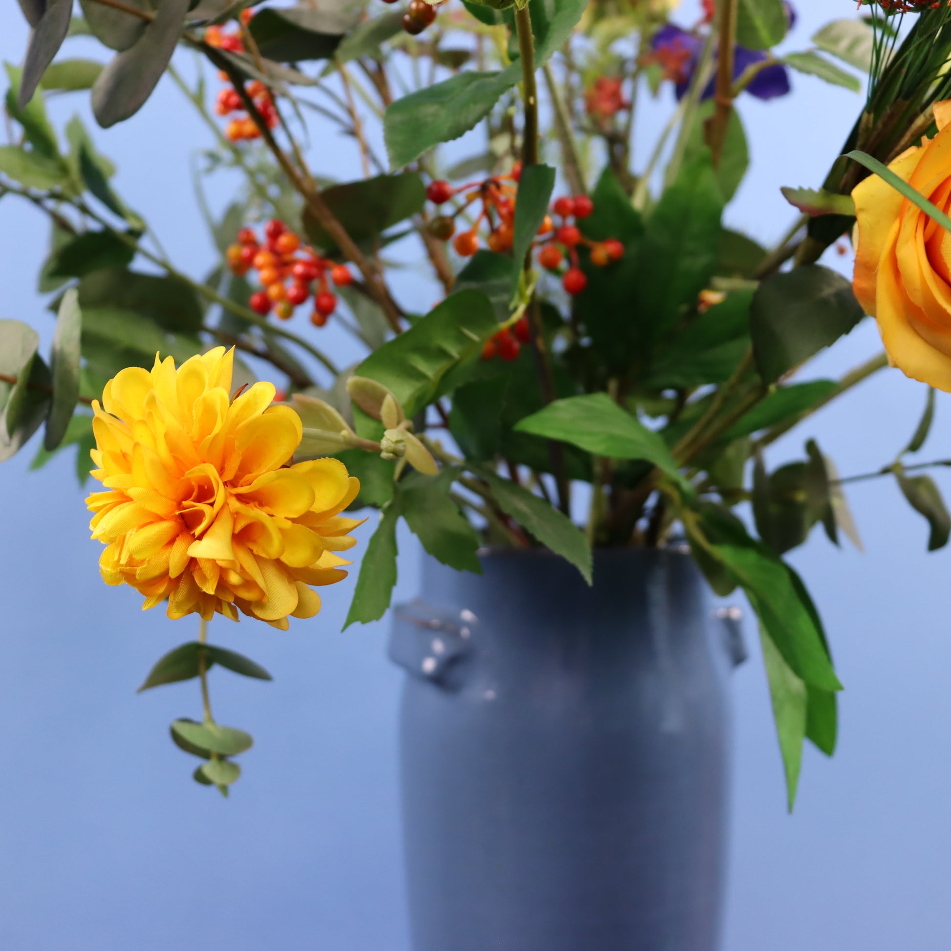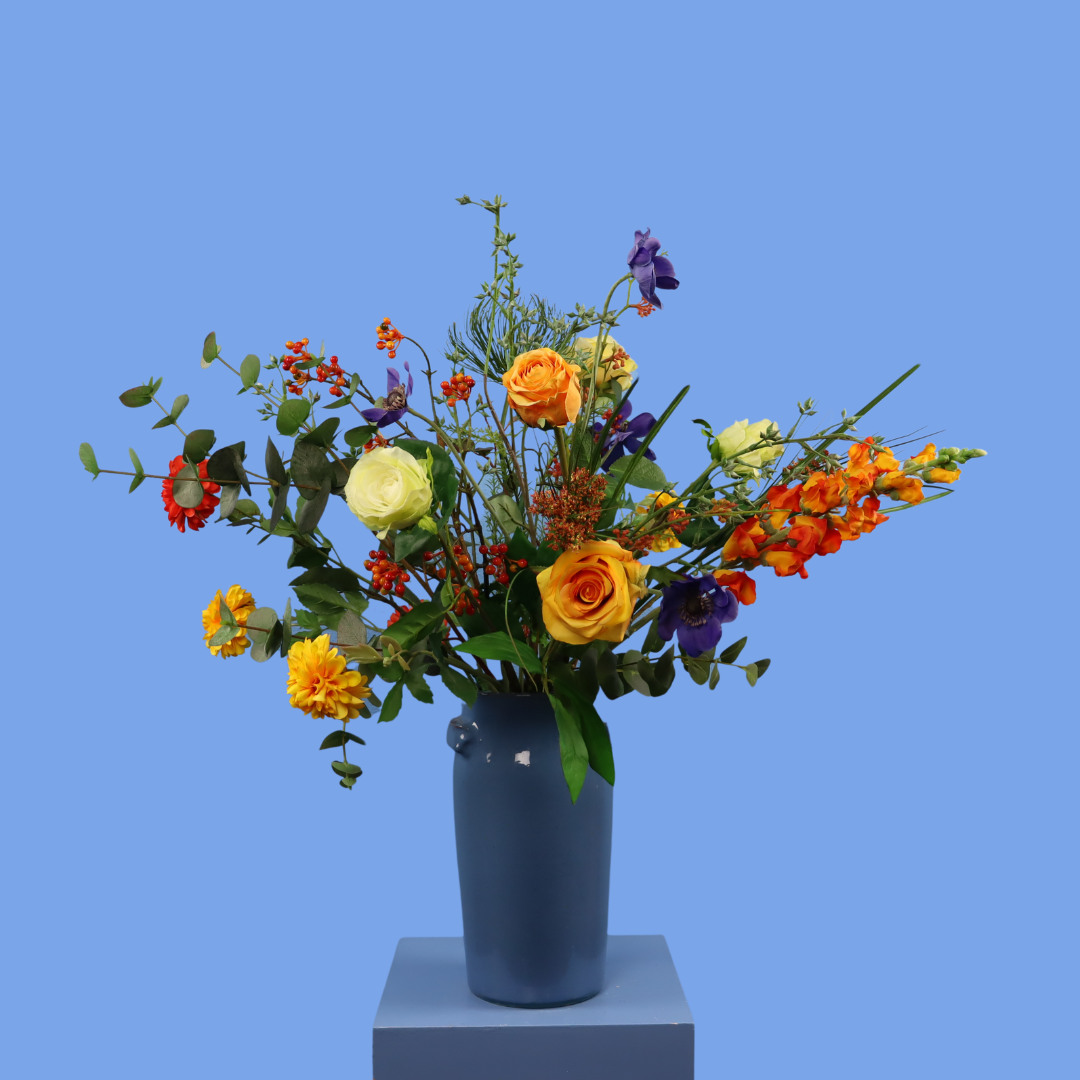 Blauwe Serax vaas met een leuk oranje boeket.