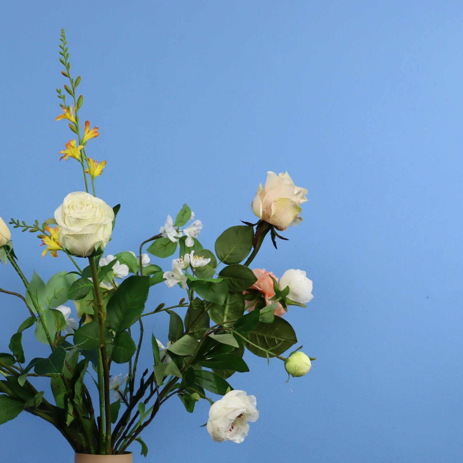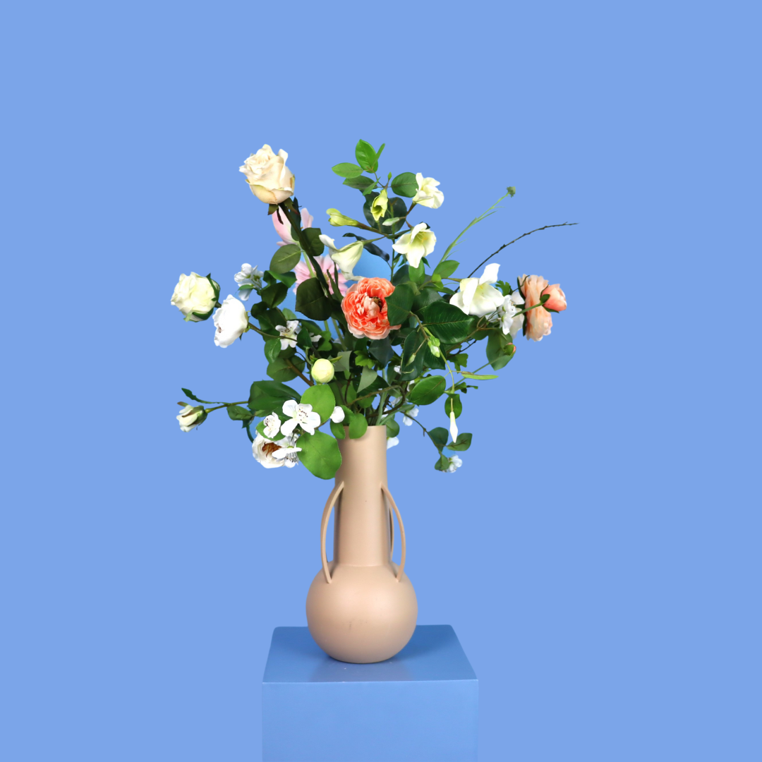 Pols Potten vaas in lichte kleuren met o.a. gerbera´s en rozen.
