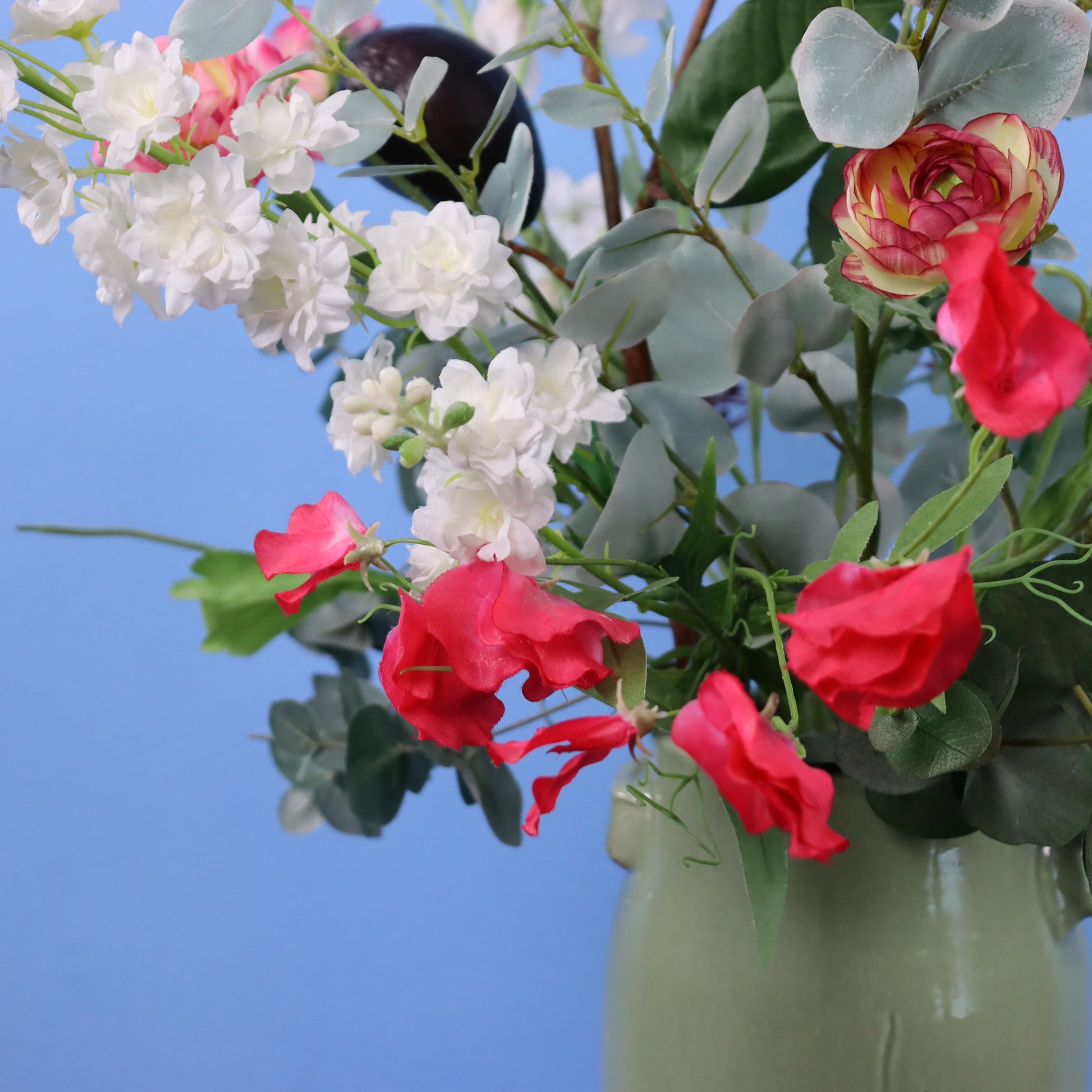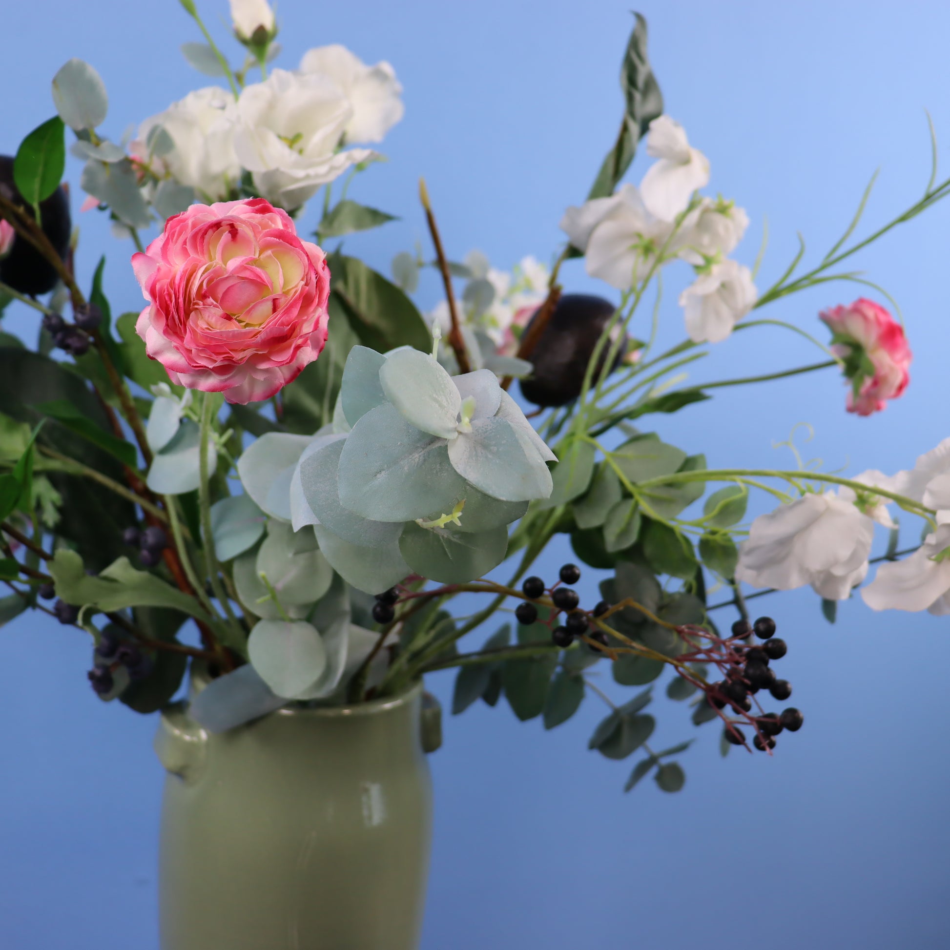 Groene Serax vaas met rozen, lisianthus en is aangevuld met groen.
