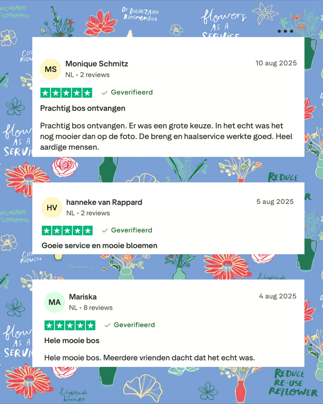 Prachtige lease bloemenEen leuk, duurzaam initiatief en werkelijk prachtige bloemen die er niet fake uitzien. Mijn enorme boeket zonnebloemen ga ik zeker een tijd houden. Uiteindelijk goedkoper dan iedere week een grote bos verse bloemen kopen. En leuk dat ik eventueel, als ik weer eens wat anders wil met mijn interieur, ik een ander boeket kan bestellen dat thuis bezorgd wordt. Januari 04, 2024