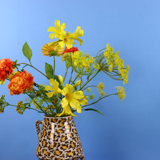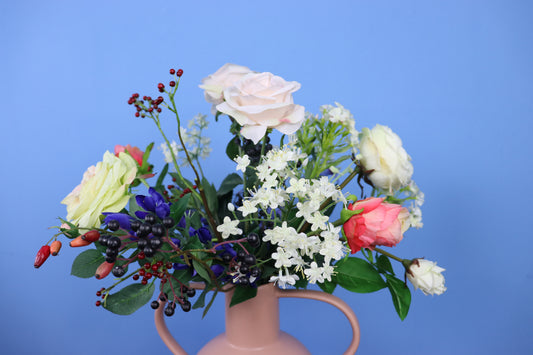 Prachtig gearrangeerd boeket in een stoere vaas!
