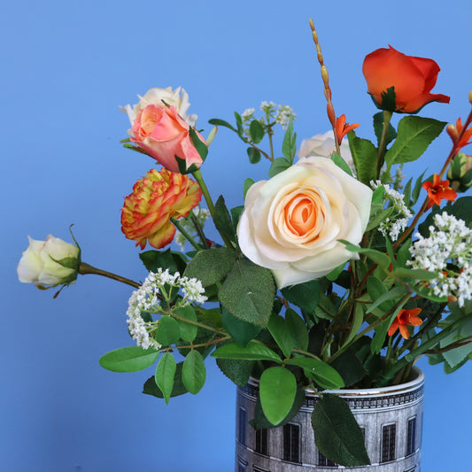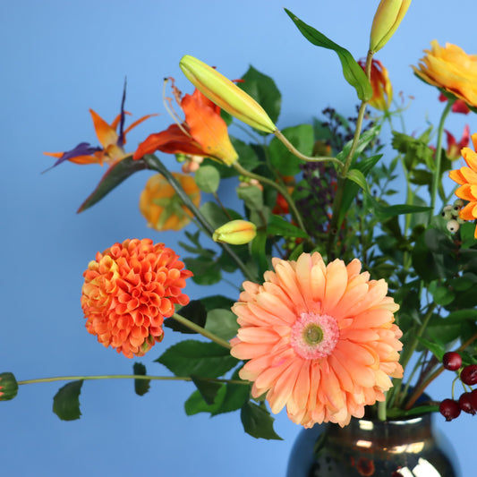 Prachtig gearrangeerd boeket in een stoere vaas!