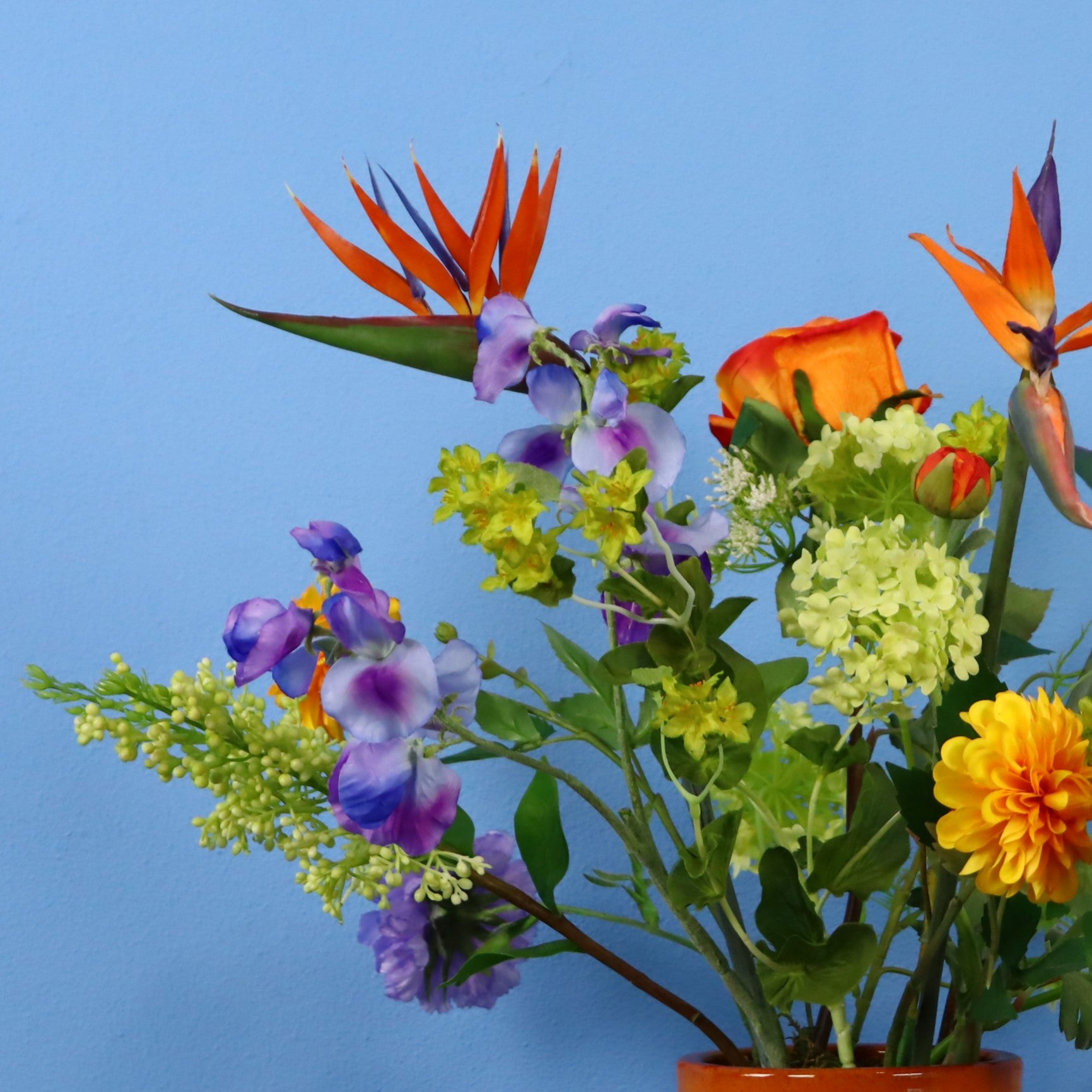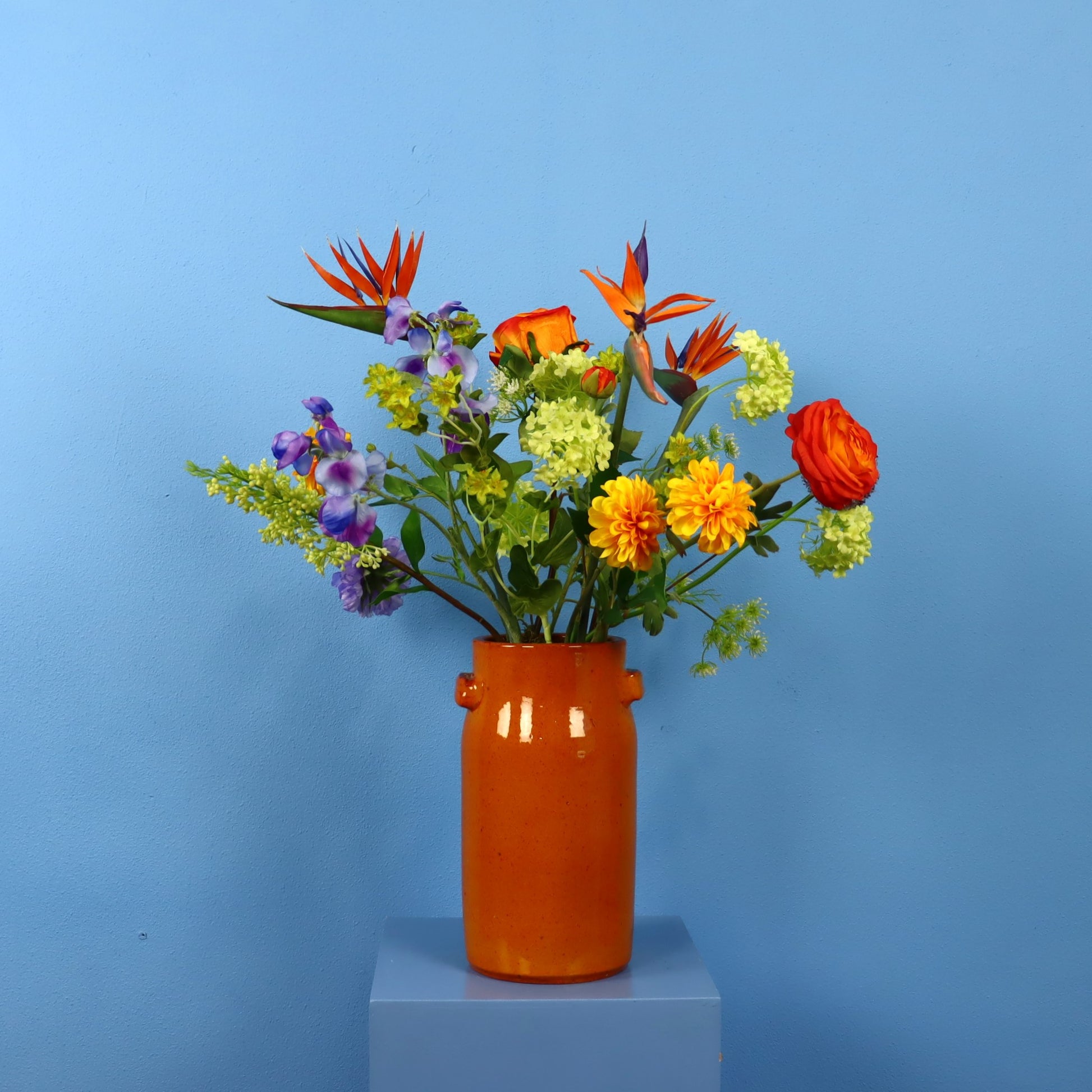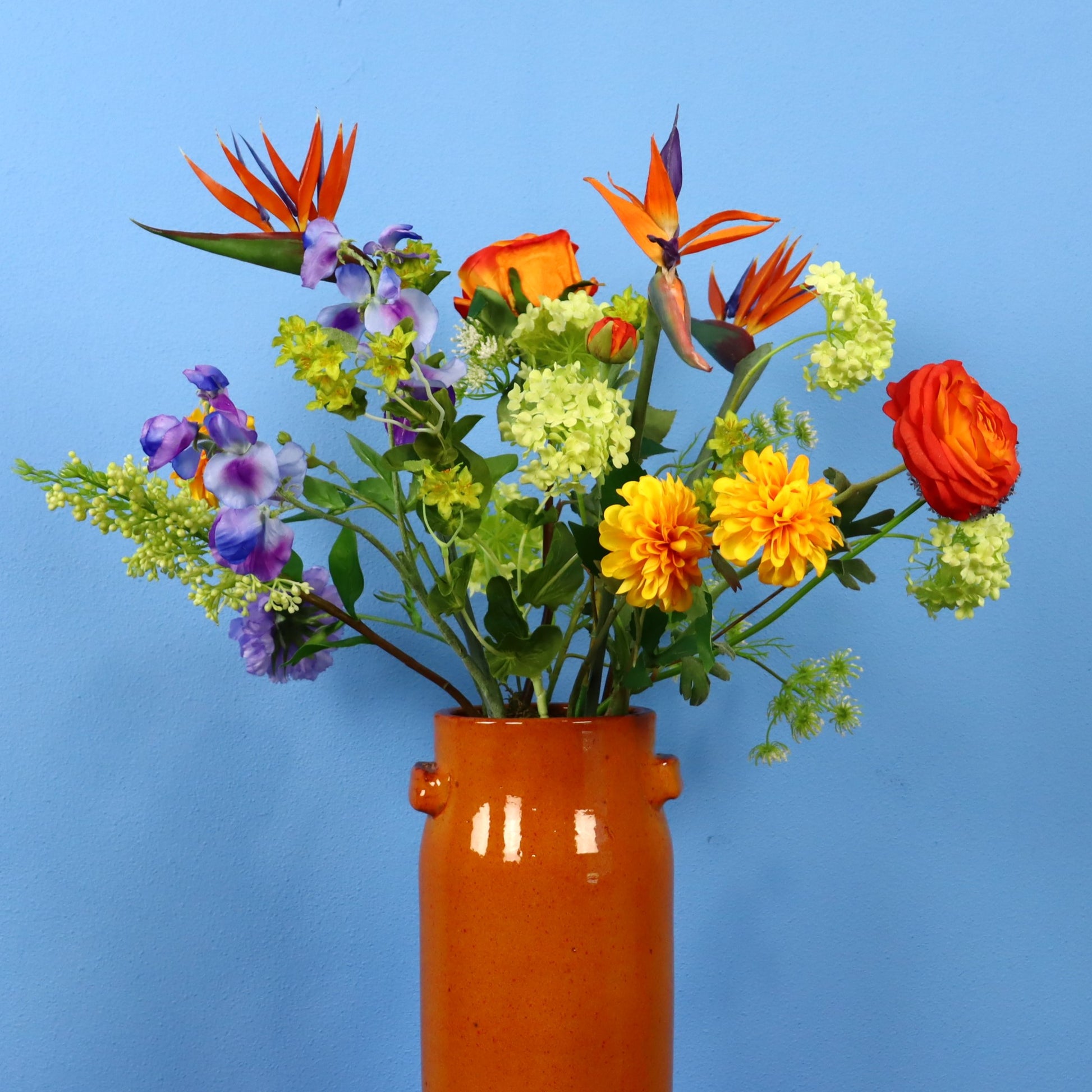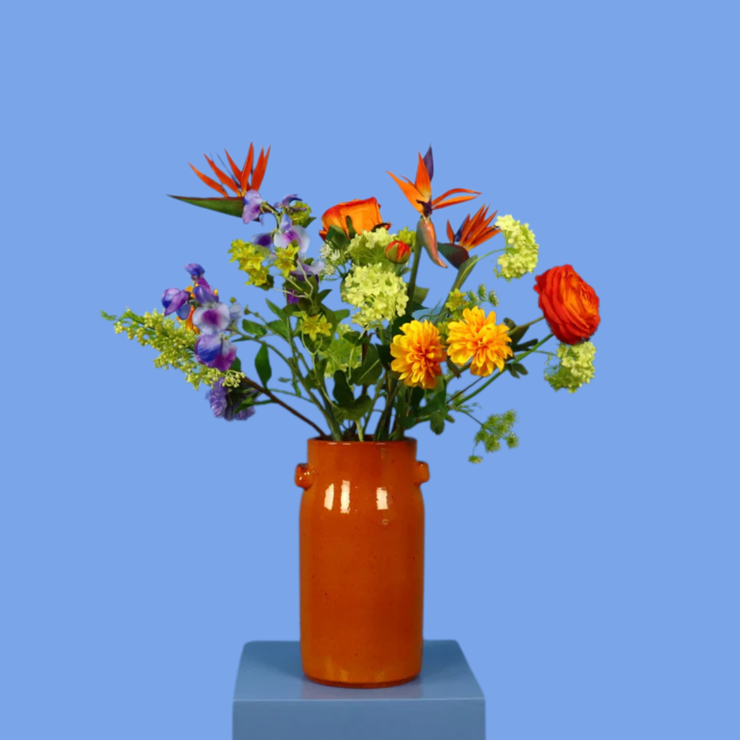 Deze prachtige oranje Serax design vaas is versierd met bloemen in het groen, geel, wit en verrijkt met strelitzia / papegaaienbek.