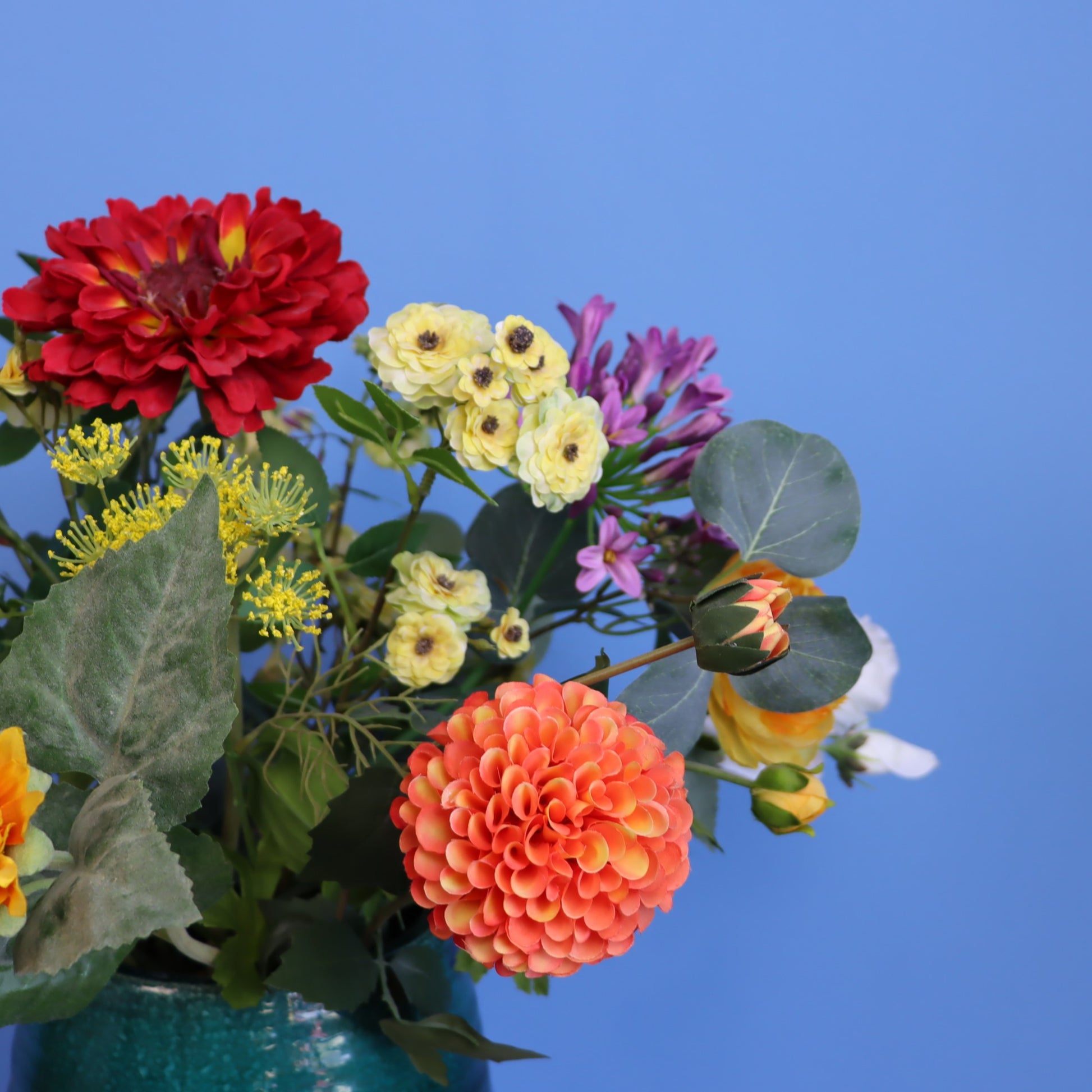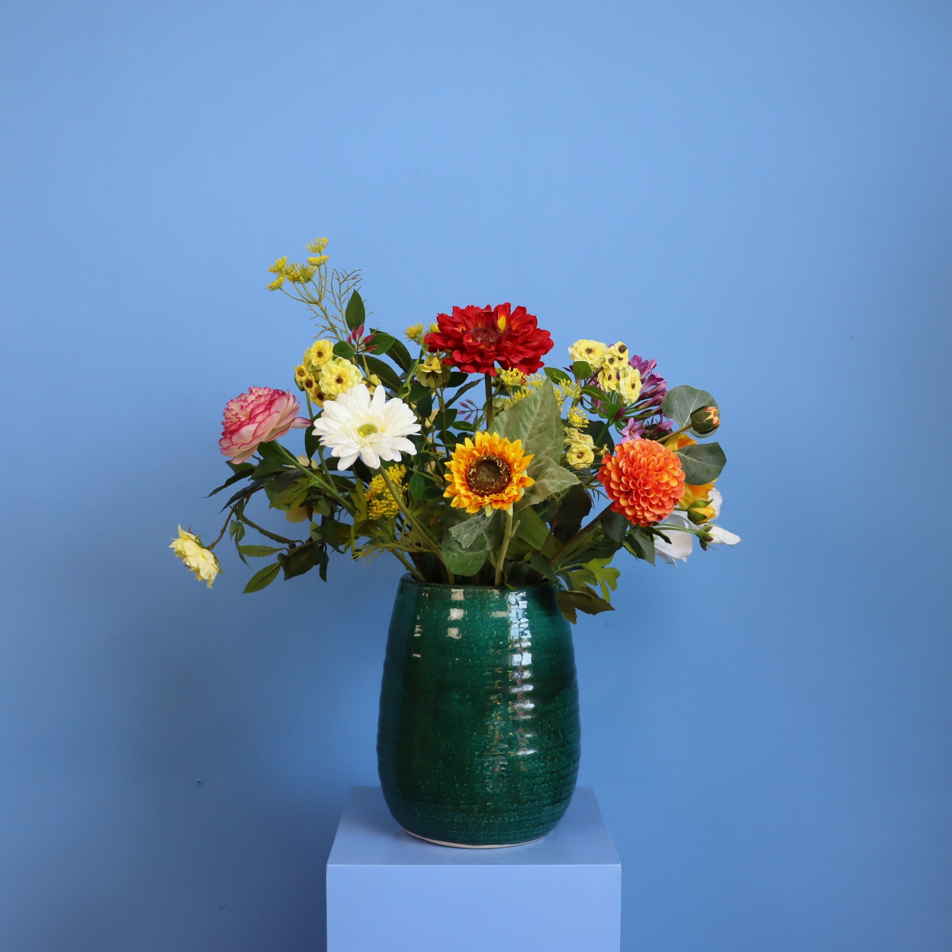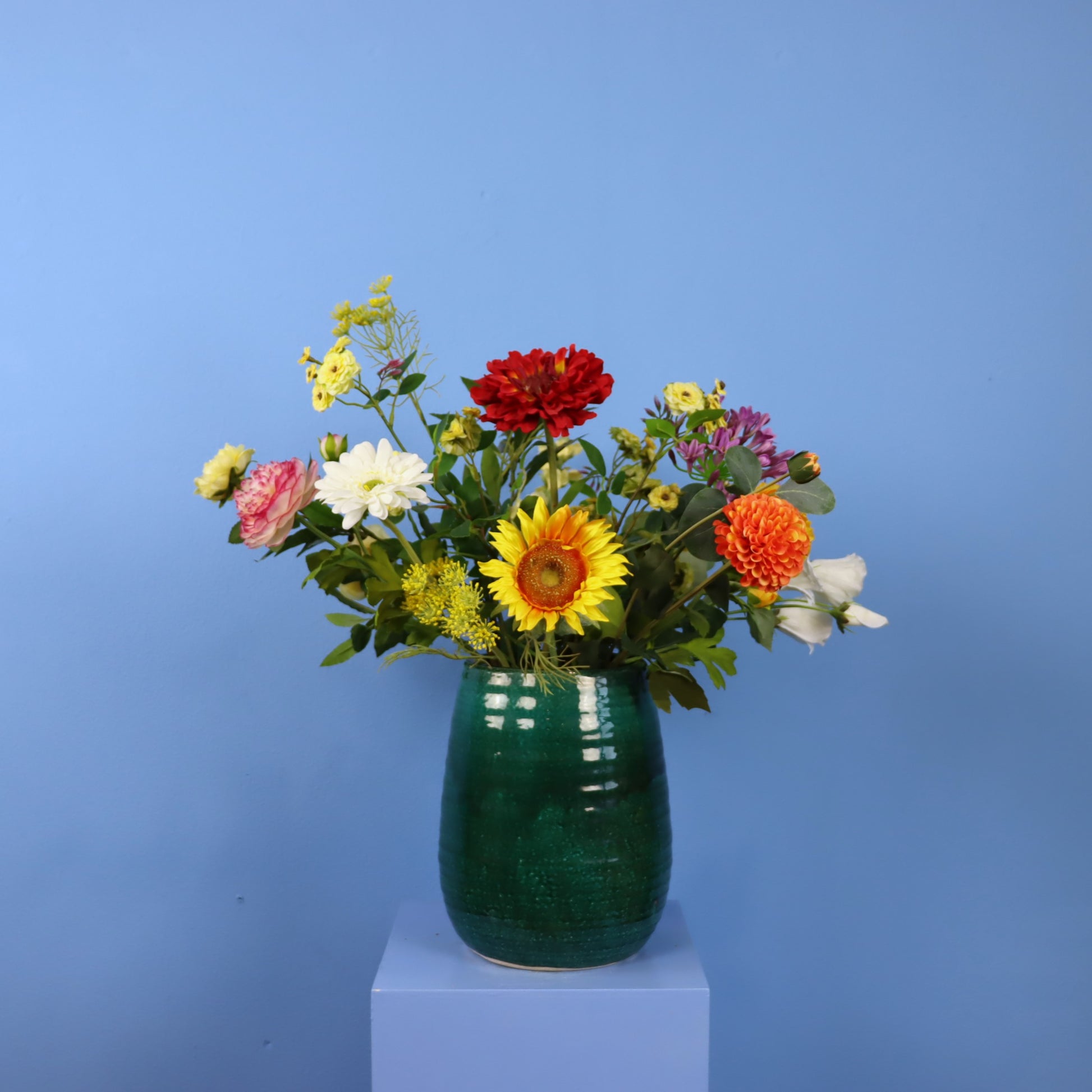 Deze groene Serax vaas is gevuld met een blijvende bloemenmix van Dahlia´s, Zonnebloemen, Lysianthus, Gerbera´s en is aangevuld met groen.