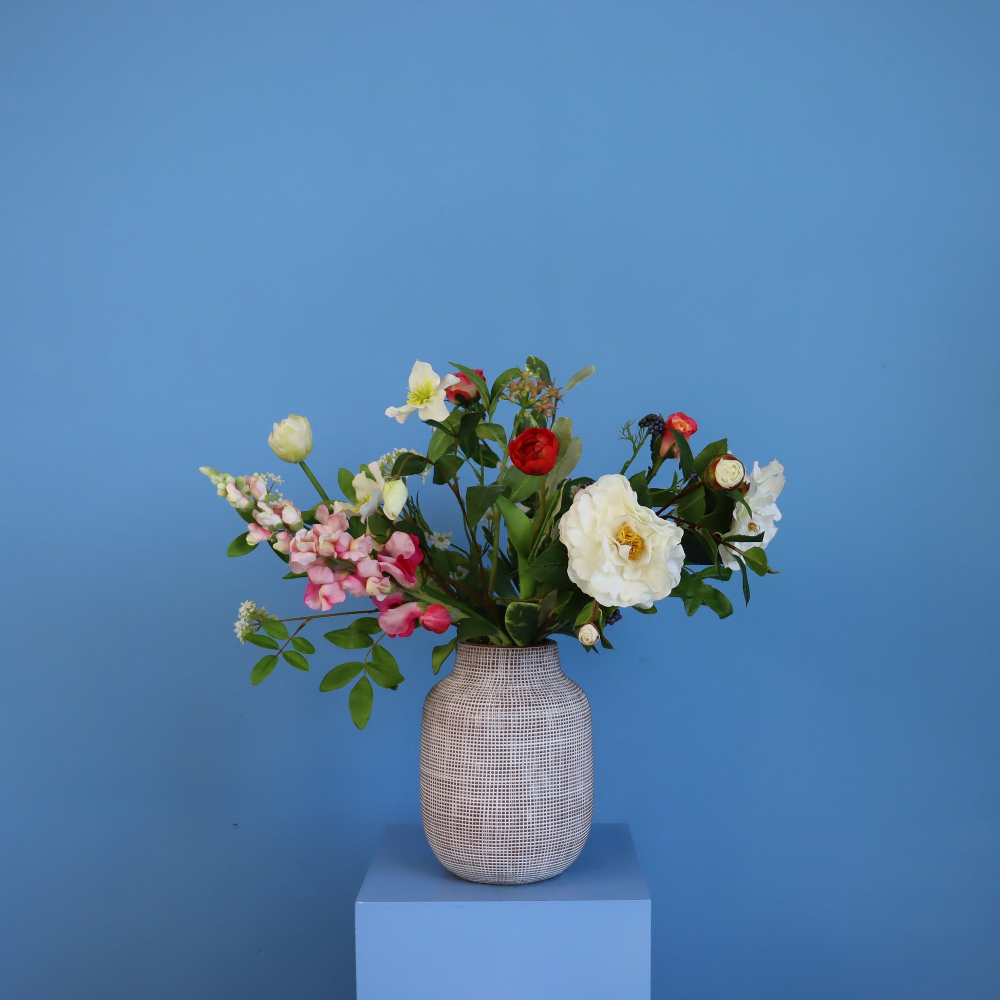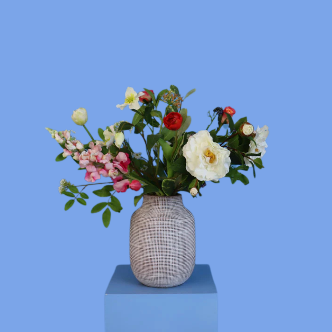 Vaas met bruin reliëf en vrolijke blijvende bloemen mix.
